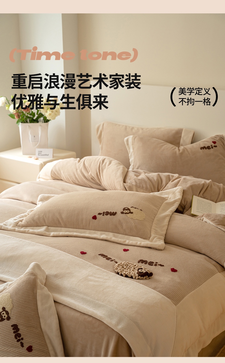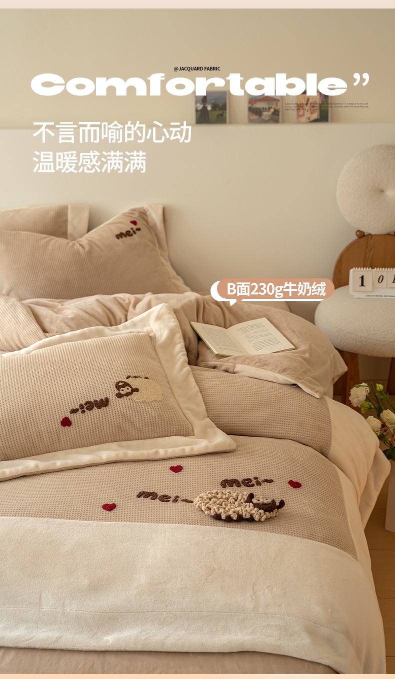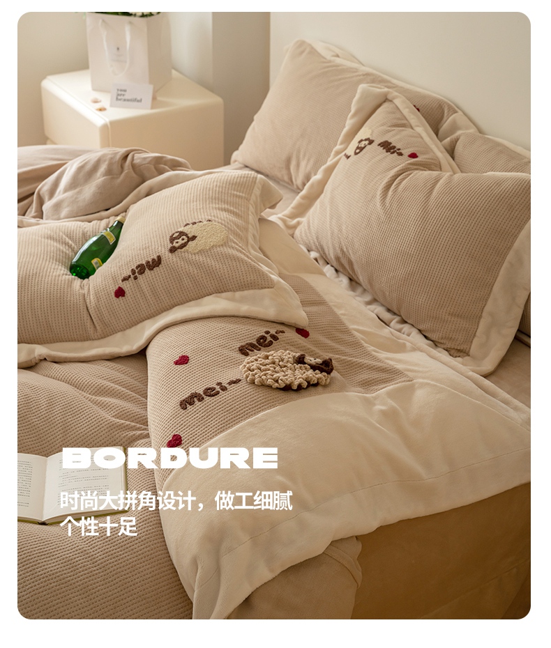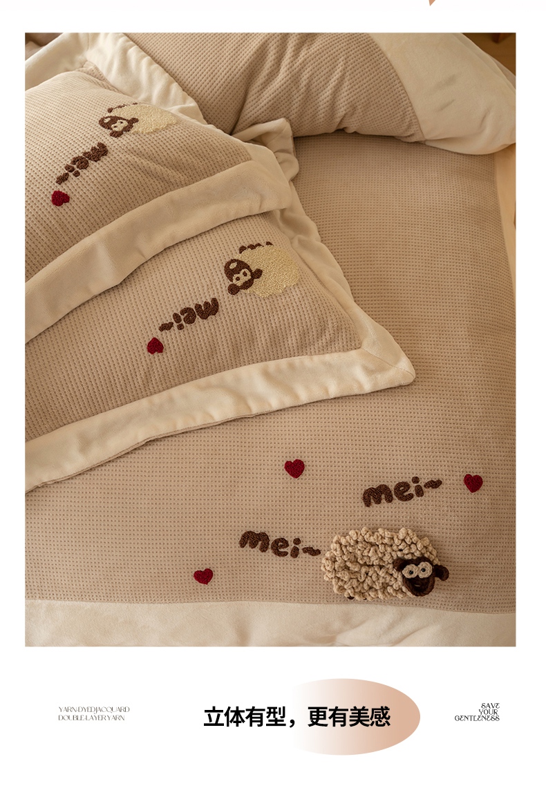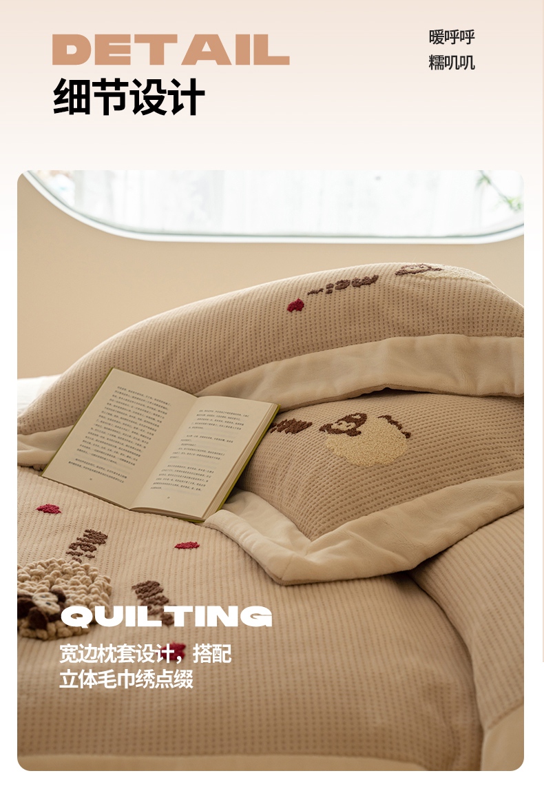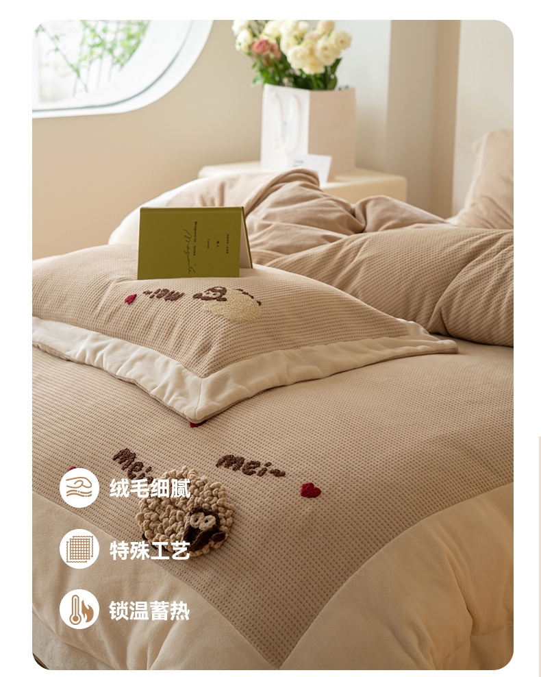 商品名称:名品优仓 2024新款华夫格牛奶绒毛巾绣四件套-喜洋洋 喜洋洋 浅卡其