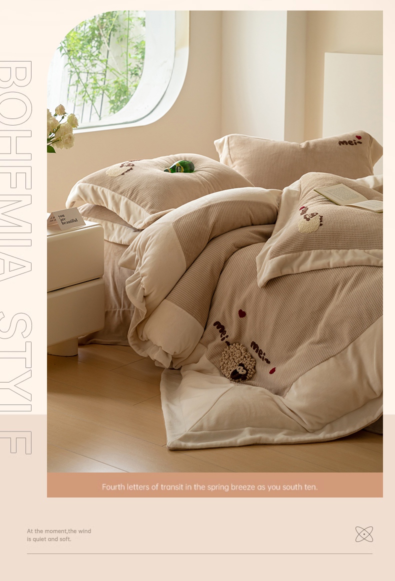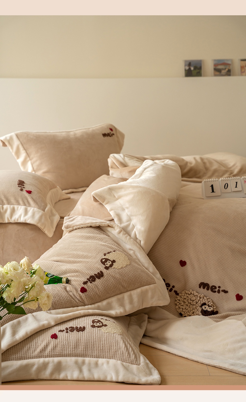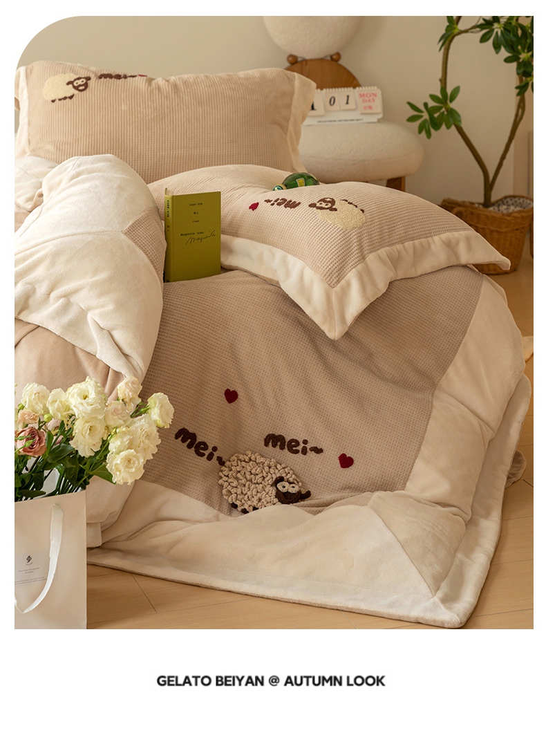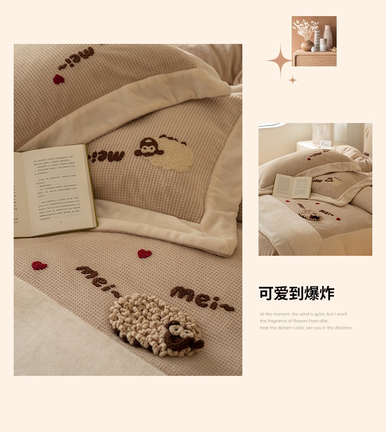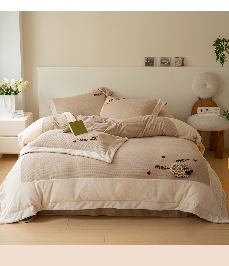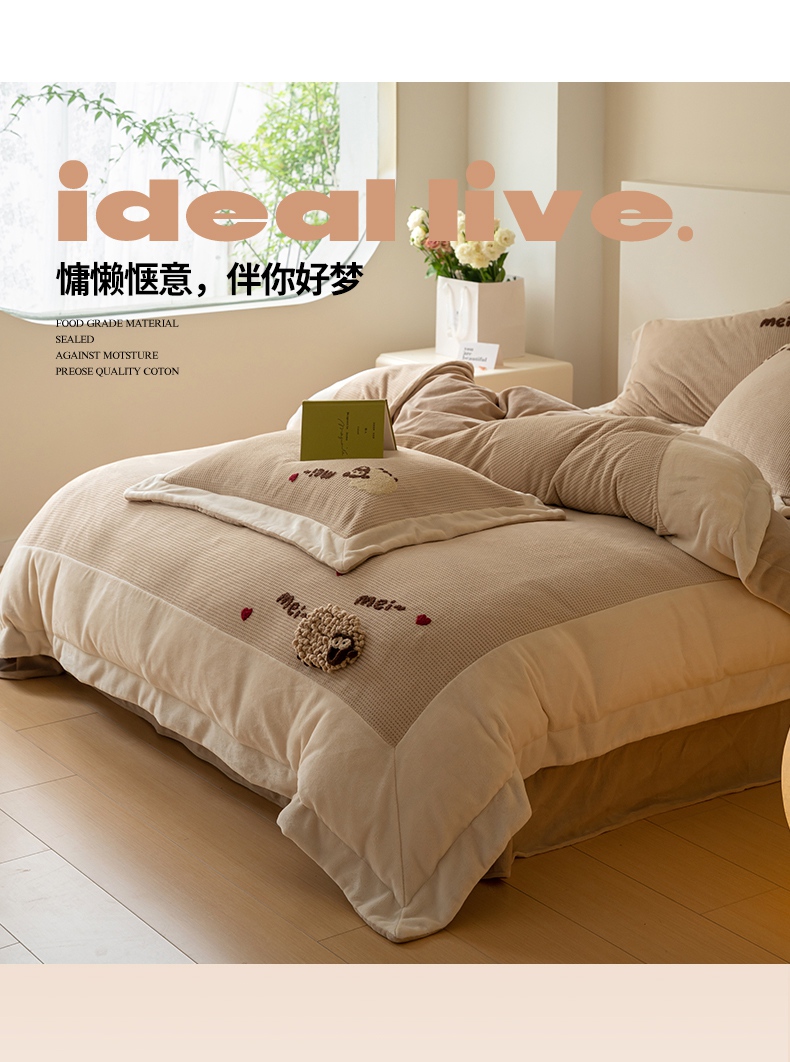 商品名称:名品优仓 2024新款华夫格牛奶绒毛巾绣四件套-喜洋洋 喜洋洋 浅卡其