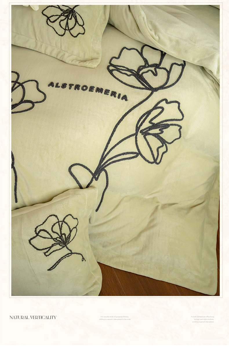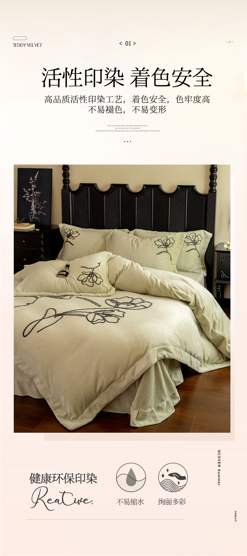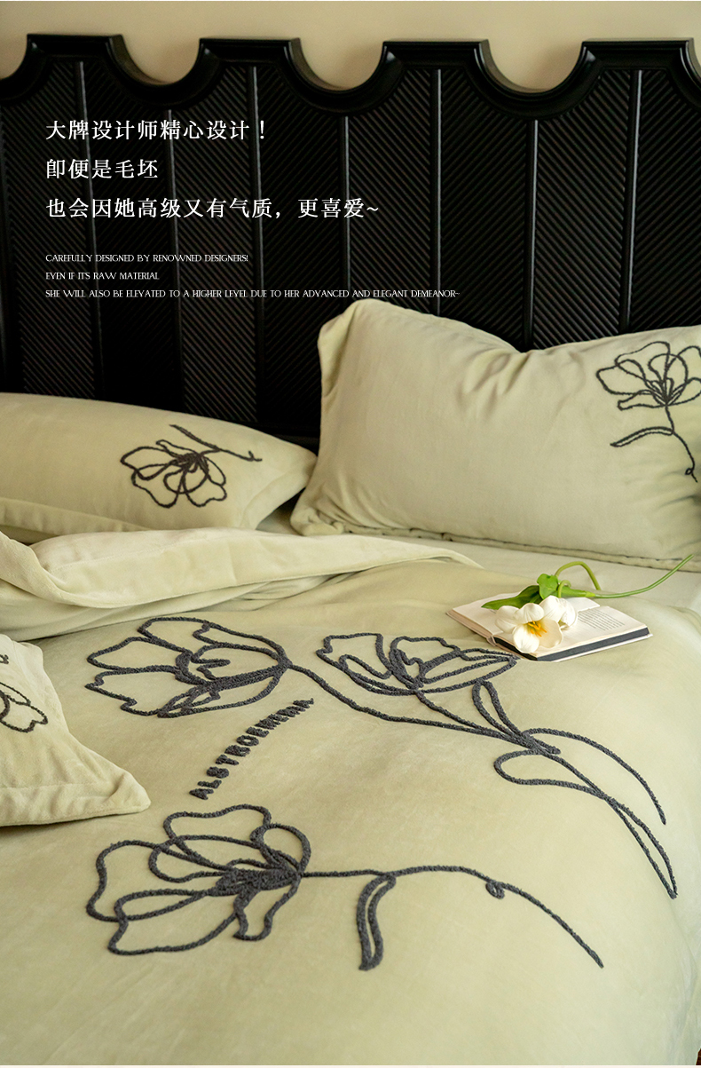 商品名称:名品优仓 2024新款牛奶绒毛巾绣花四件套-摩西 摩西-绿矾