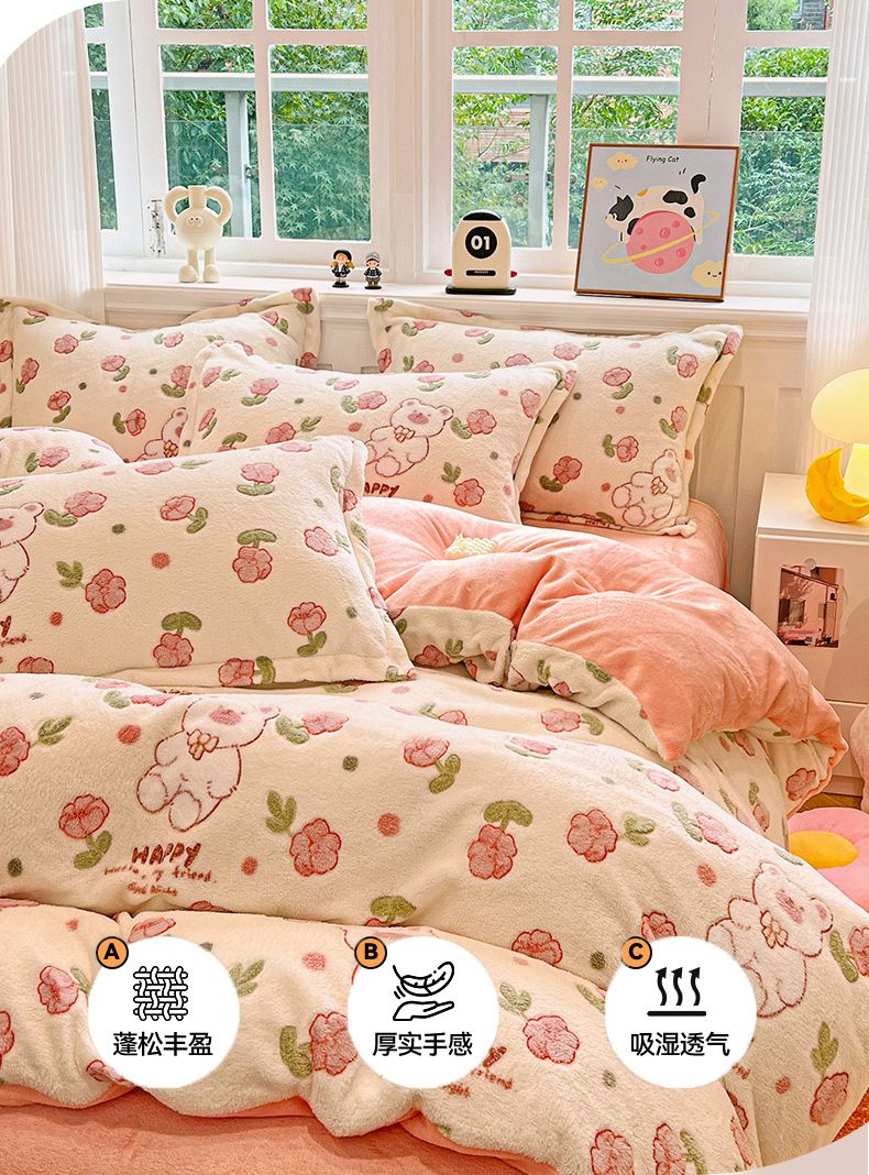 (总)韩巢家纺 2025新款高克重雪花绒牛奶绒四件套系列,郁金香,爱心熊(绿),巴丽娜,大白鹅,大耳朵兔,蝶雅,花花世界,灰色轨迹,米菲,七彩,田园兔(黄),小怪兽,幸运兔,英伦熊