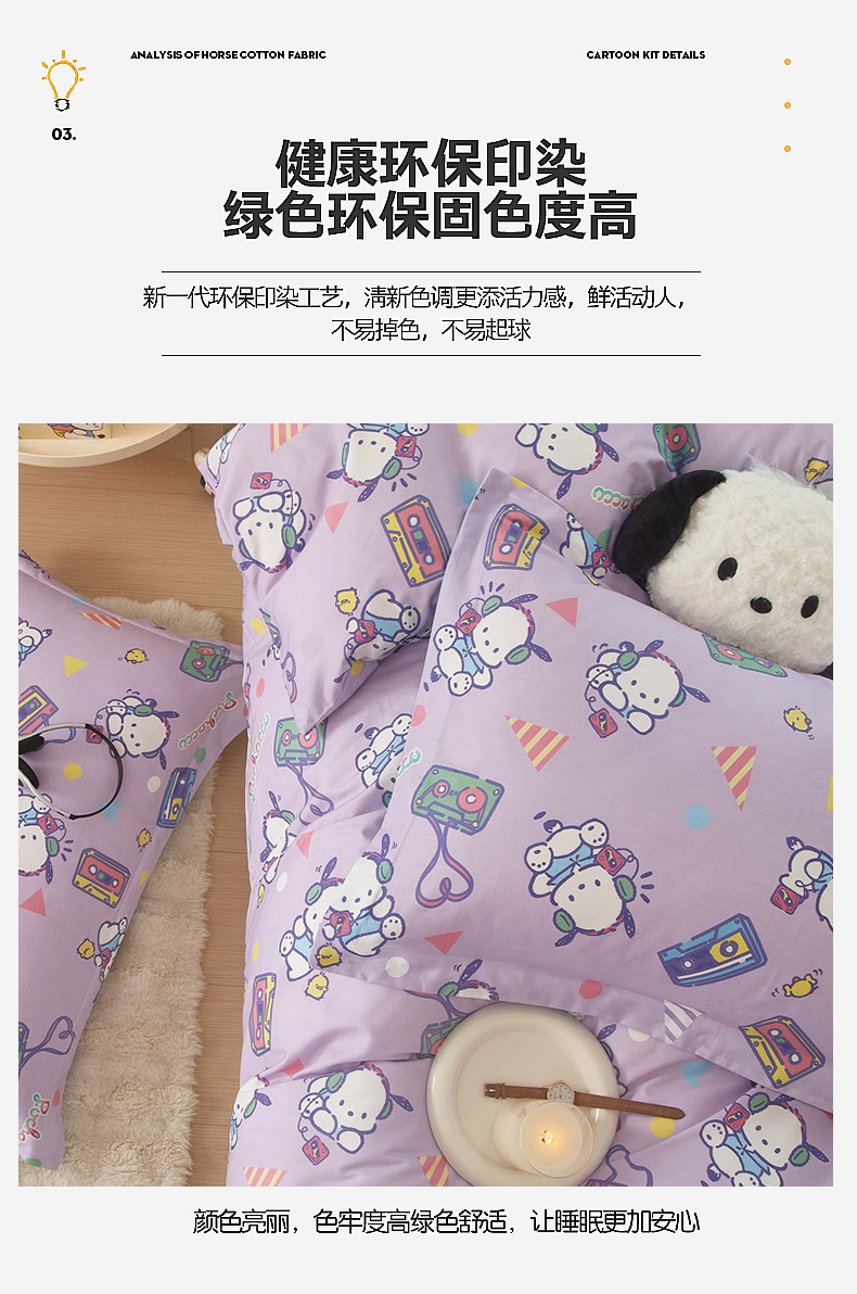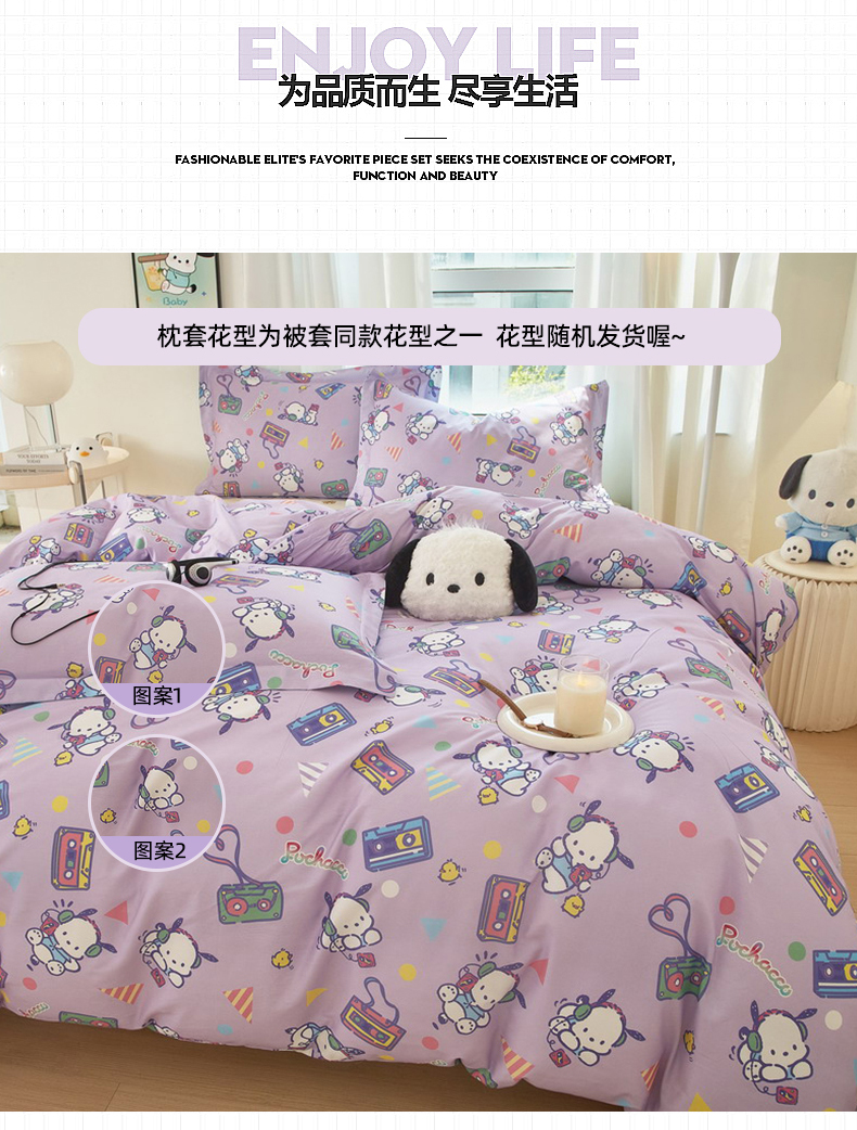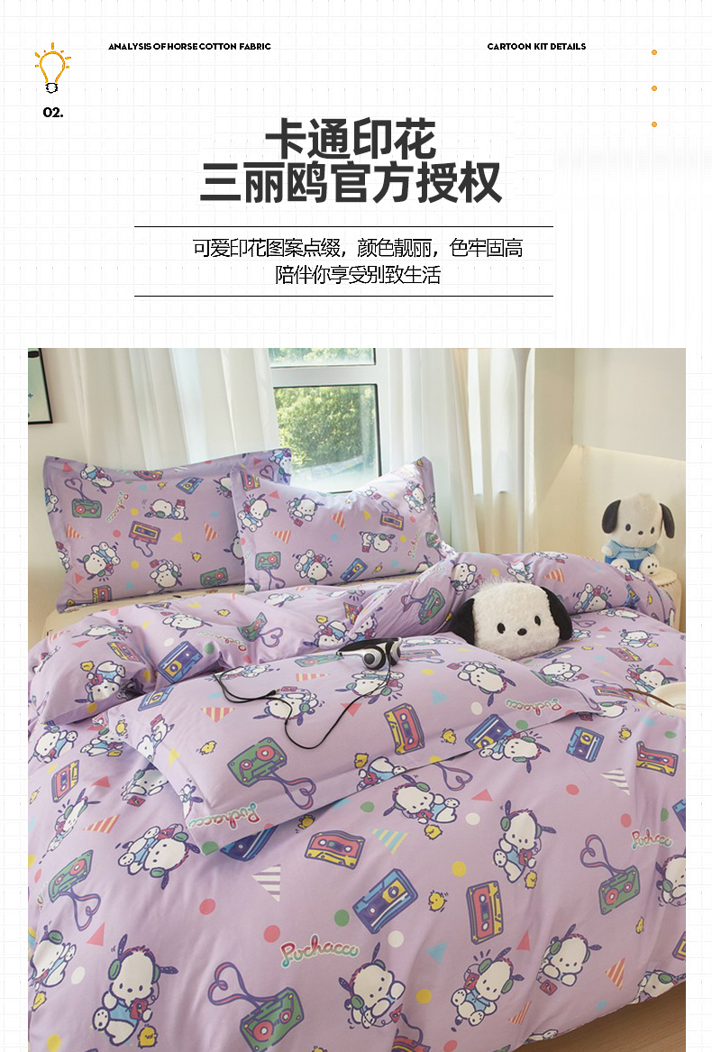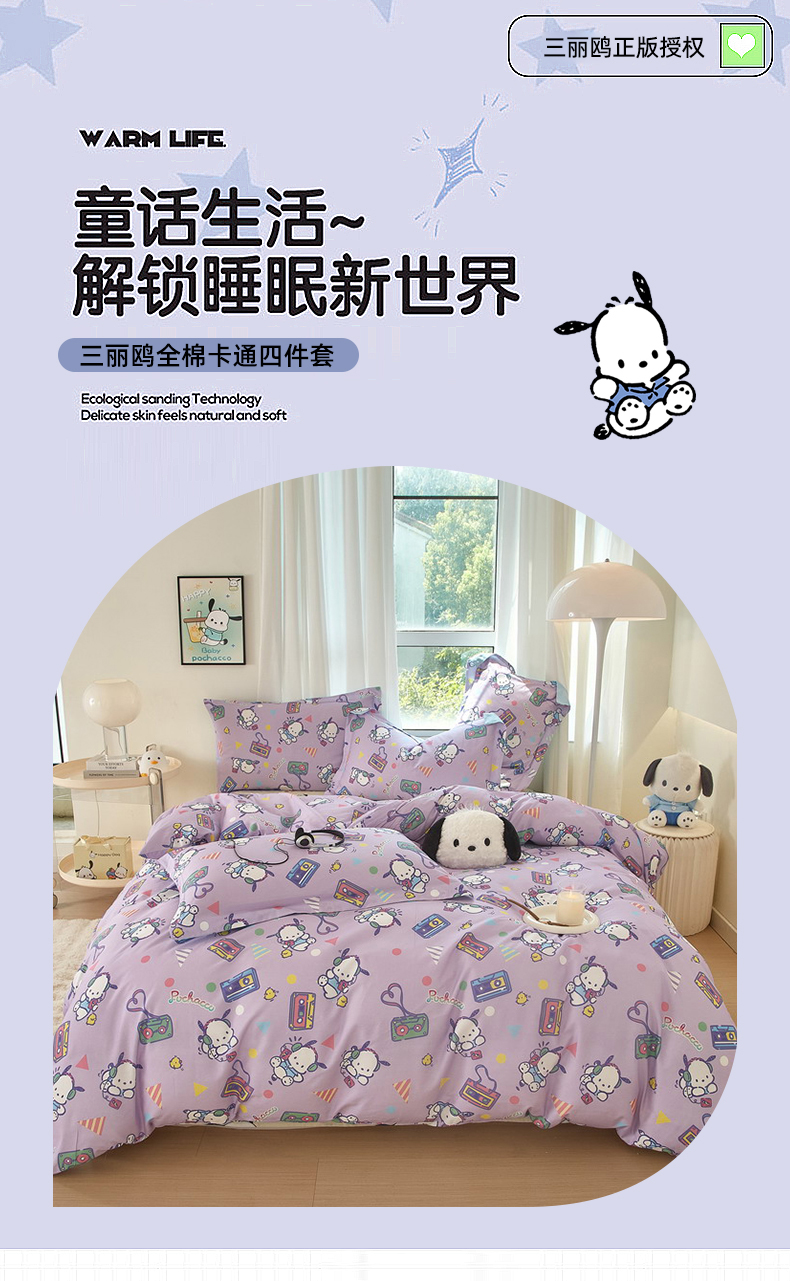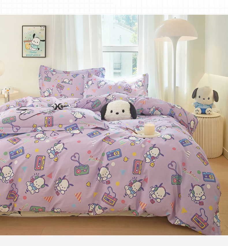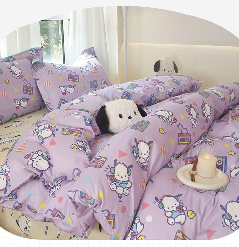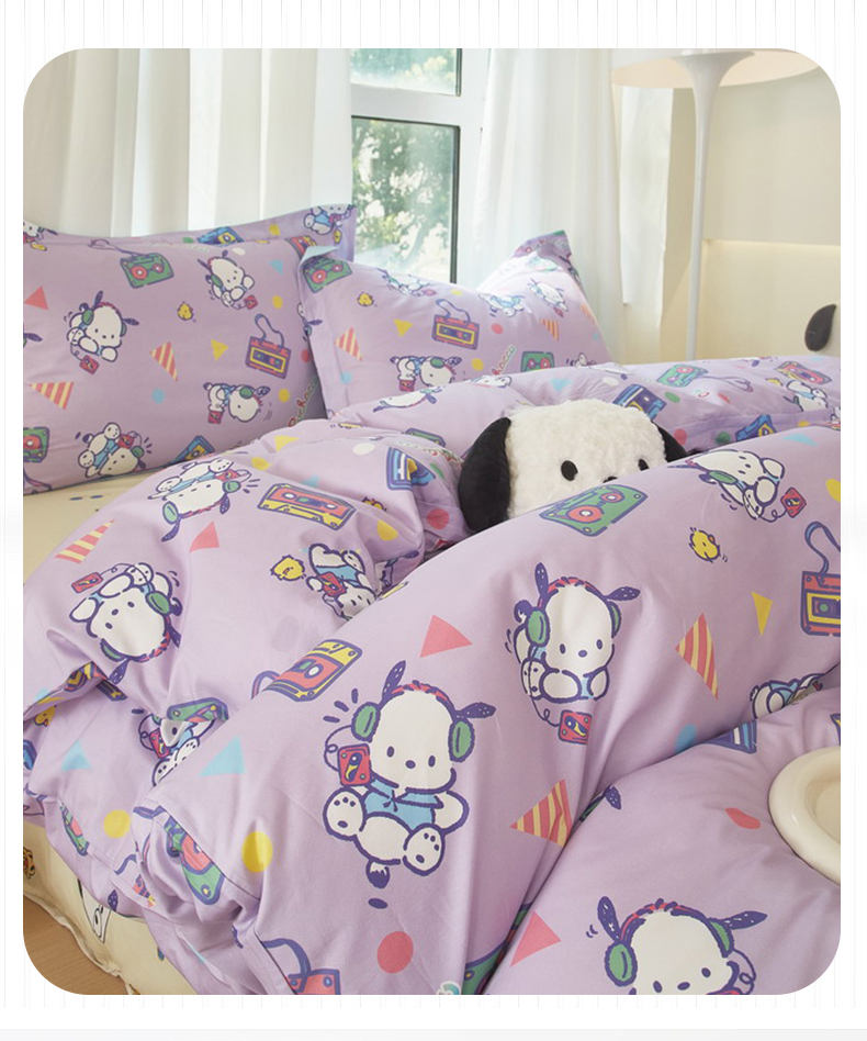 当前位置: 91家纺网 > 商品网购 > 床品套件 > 四件套 > 全棉普通四件套 > 蘭菲家纺 2024新款全棉小版卡通三丽鸥四件套 演唱会.紫