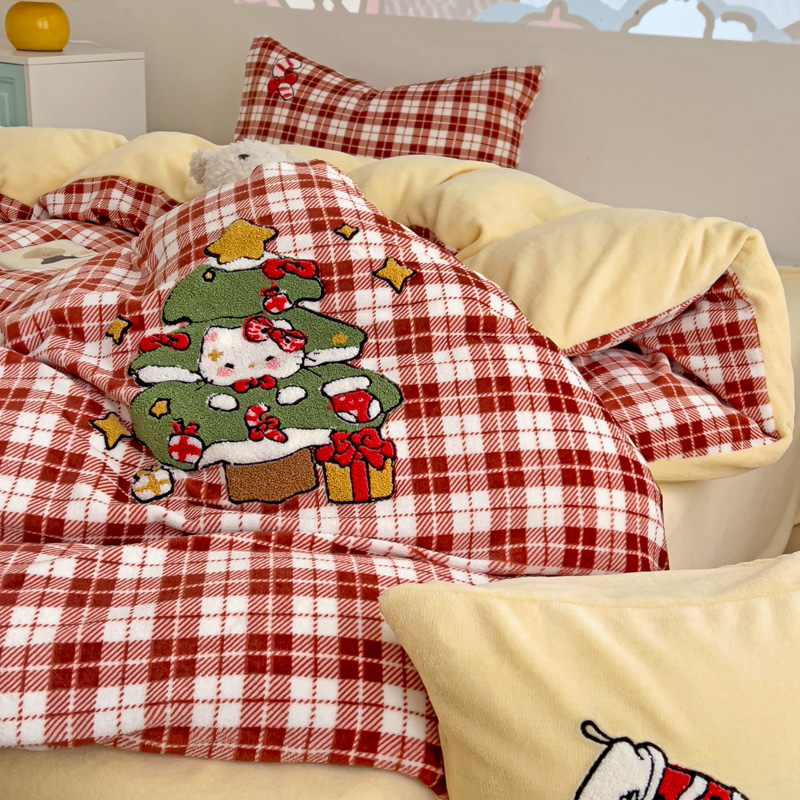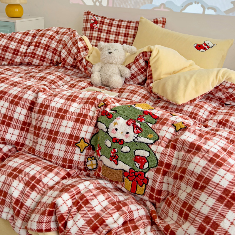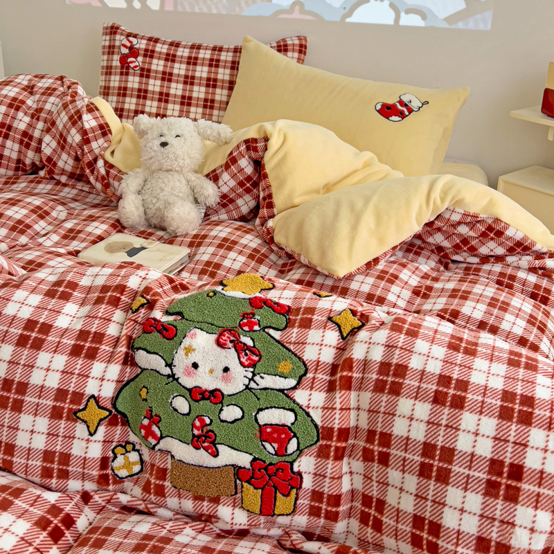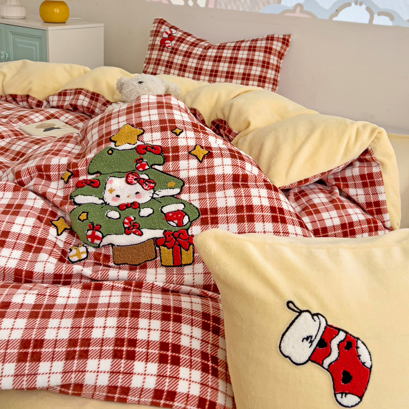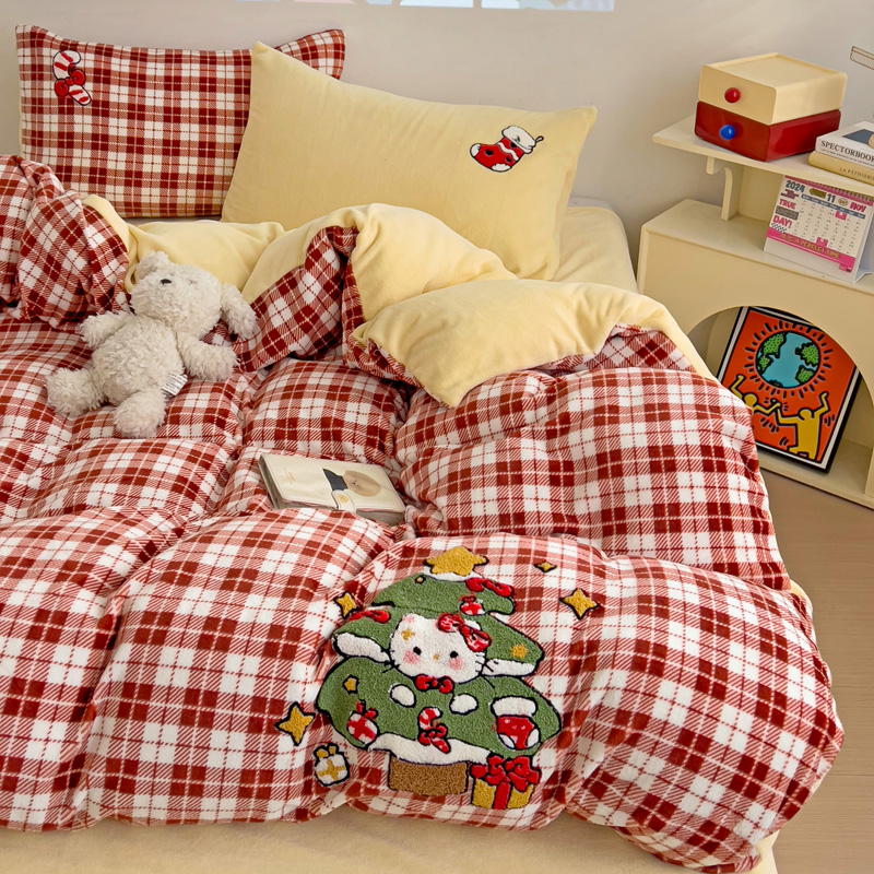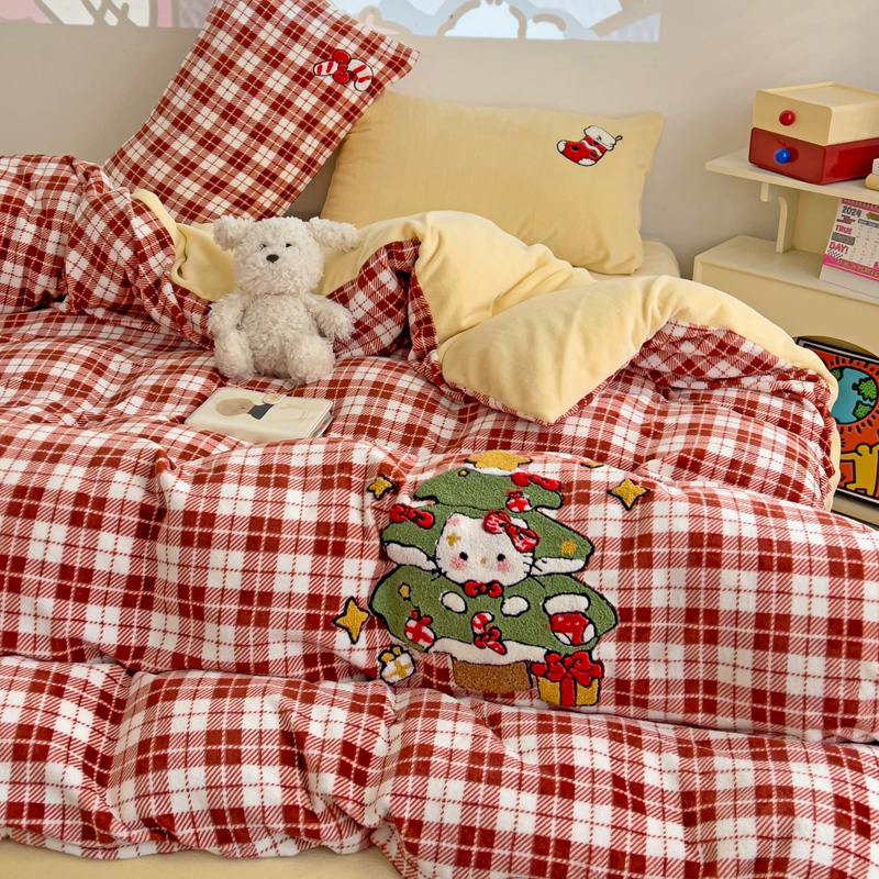 乐童家纺 2024新款高克重牛奶绒小清新印+绣系列四件套 圣诞猫咪
