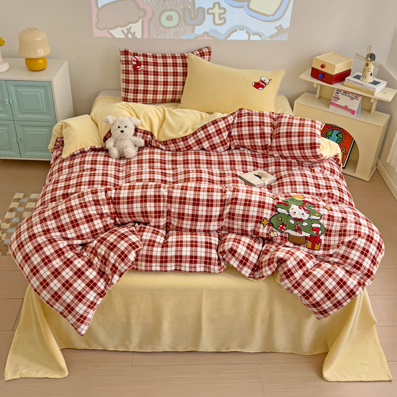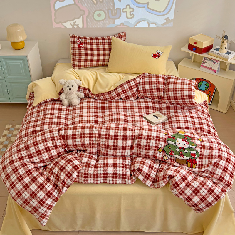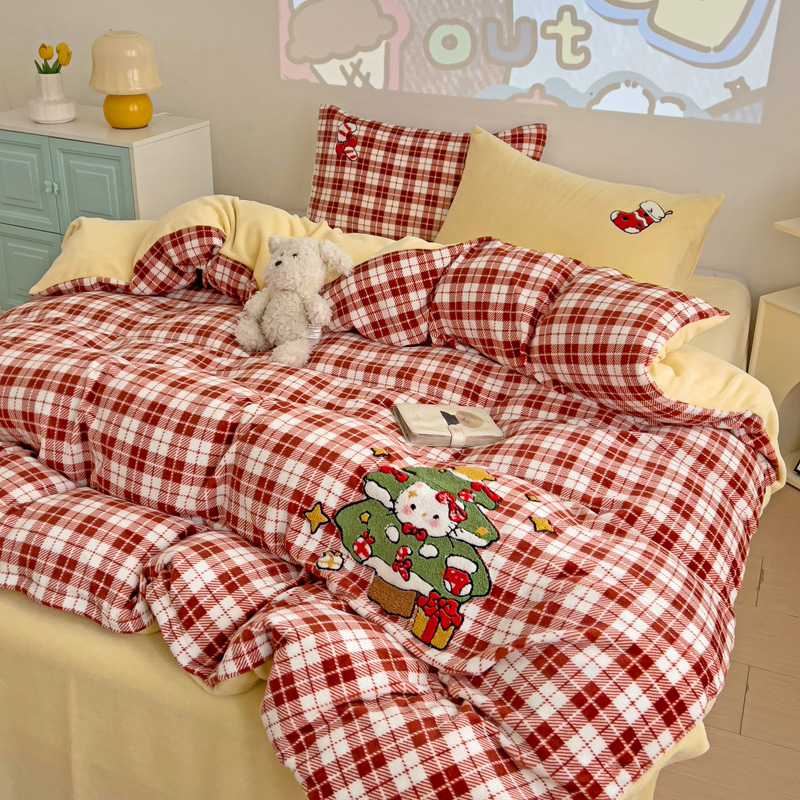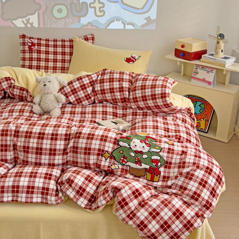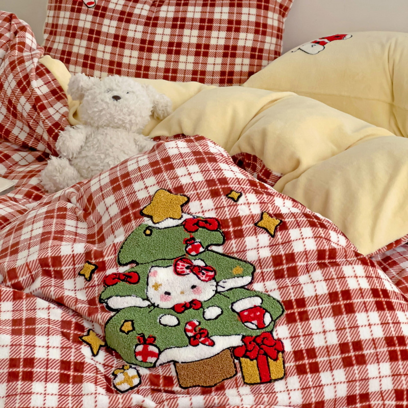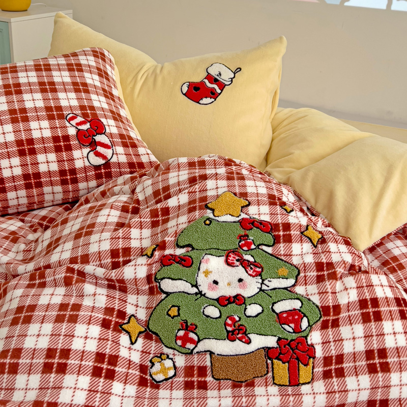乐童家纺 2024新款高克重牛奶绒小清新印+绣系列四件套 圣诞猫咪