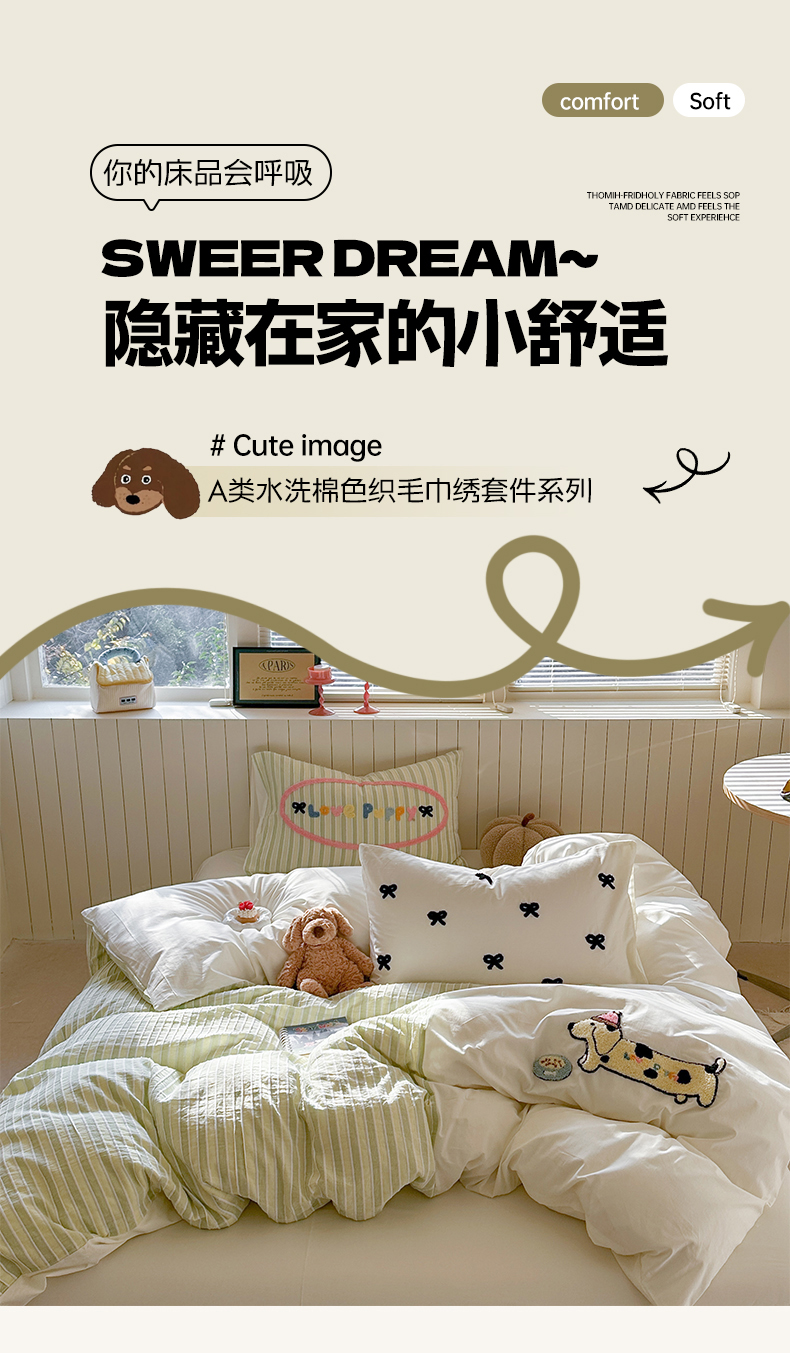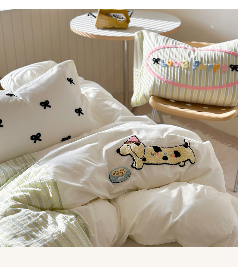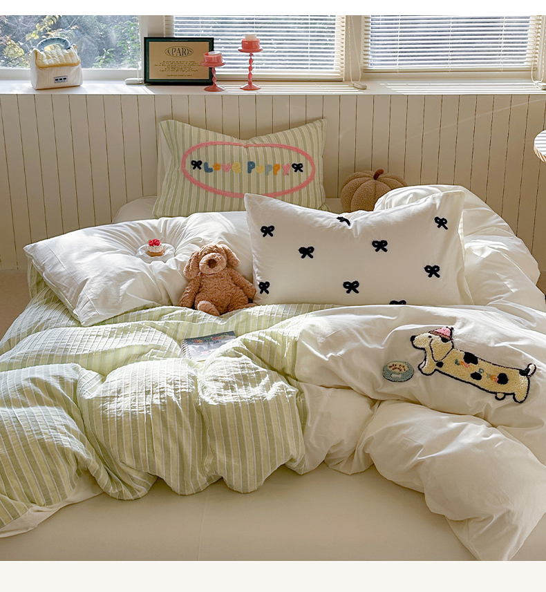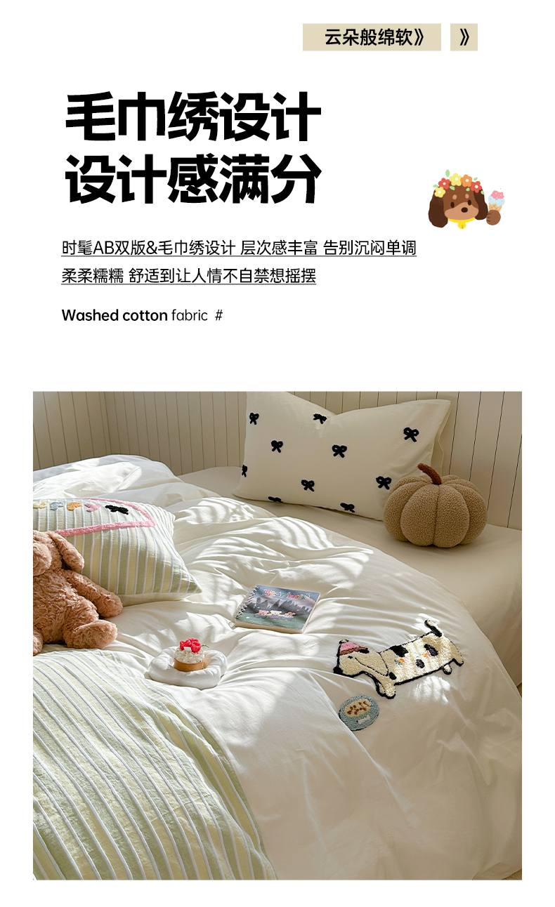暖生活 2025新款全棉水洗棉色织毛巾绣拼撞系列四件套 薄荷腊肠