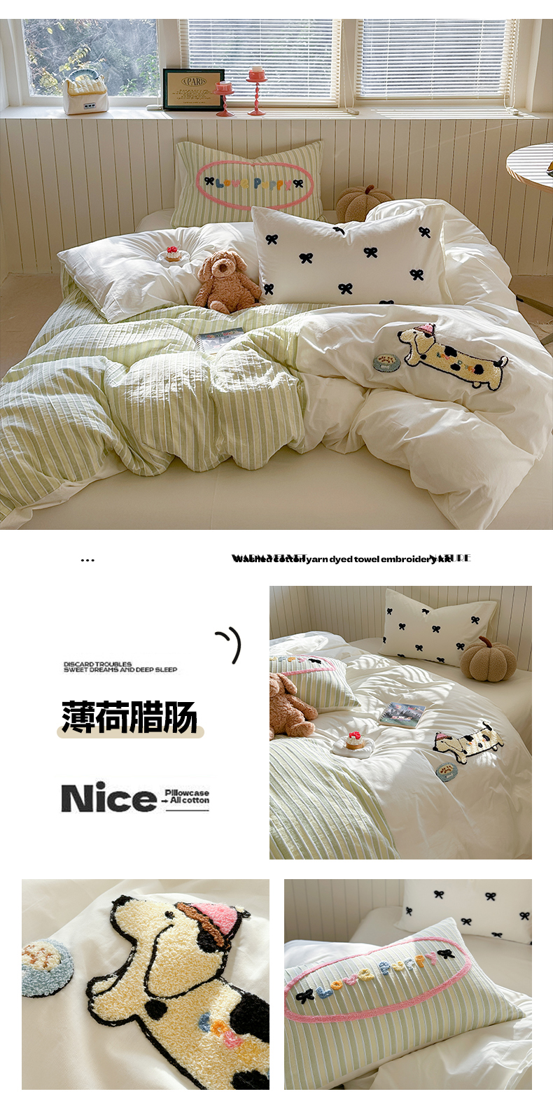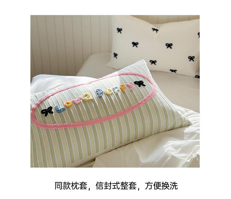 商品名称:暖生活 2025新款全棉水洗棉色织毛巾绣拼撞系列四件套 薄荷腊肠