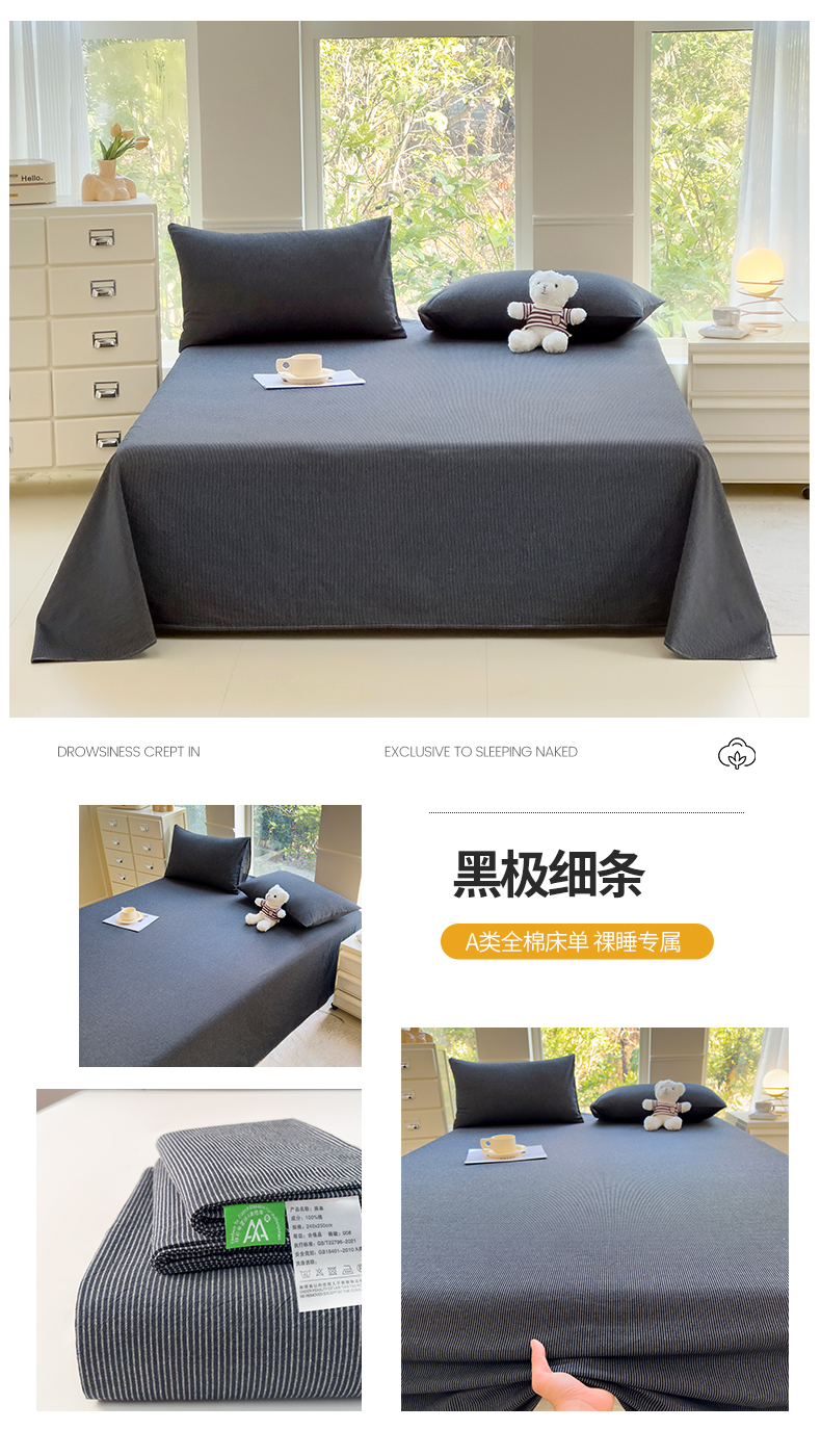 • 91家纺网 家纺一手货源 找家纺 柠萌家居 2025新款无印风全棉色织A类母婴级纯棉水洗棉床单 黑极细条