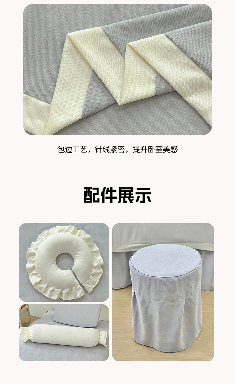(总)不打烊家纺 (原春恩家纺) 2025新款贡棉美容床罩系列套件-艾米尔,艾米尔米白色,艾米尔米白色拼灰色,艾米尔米白色拼绿色,艾米尔米白色拼驼色,艾米尔米白色拼玉色