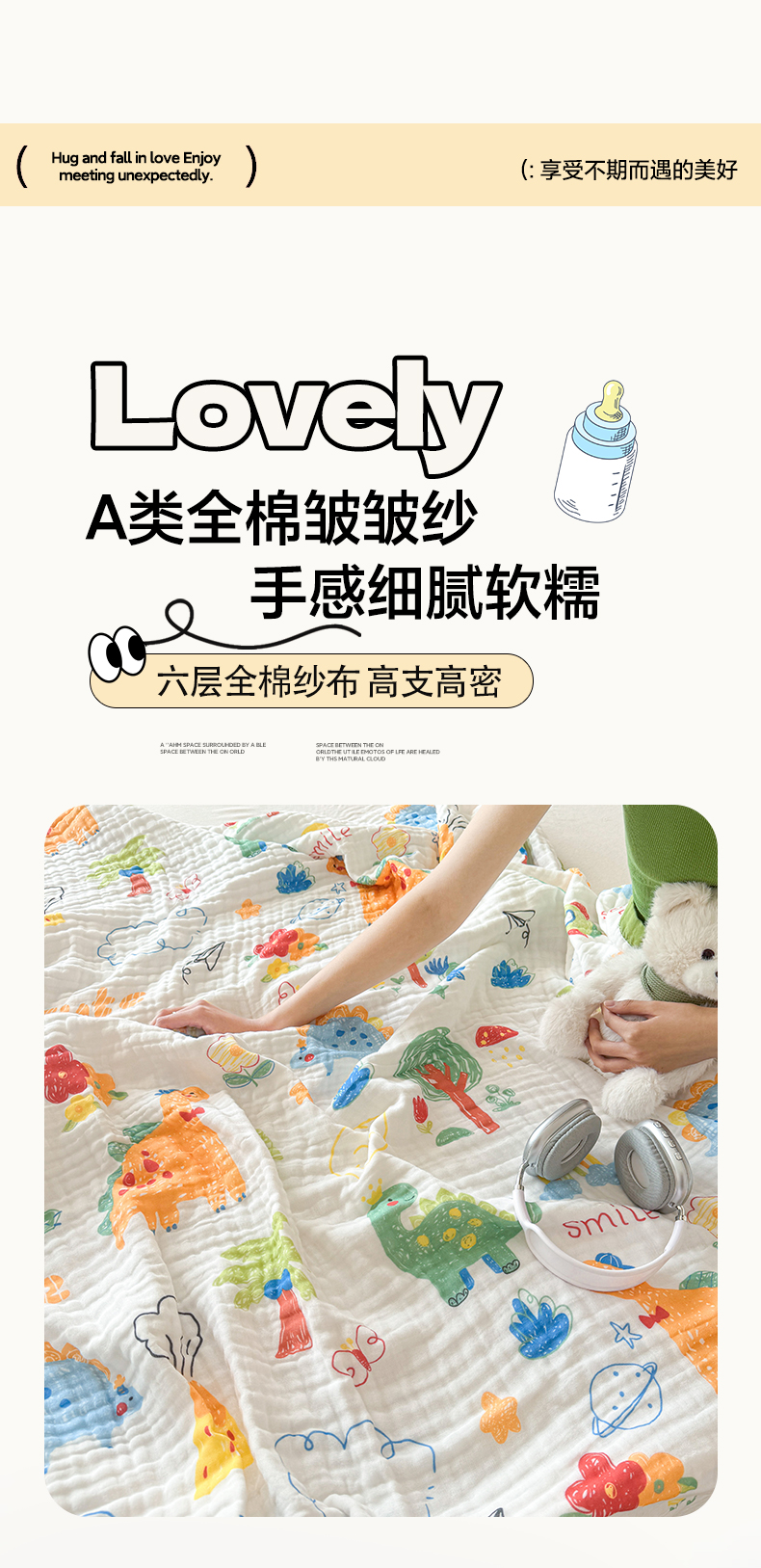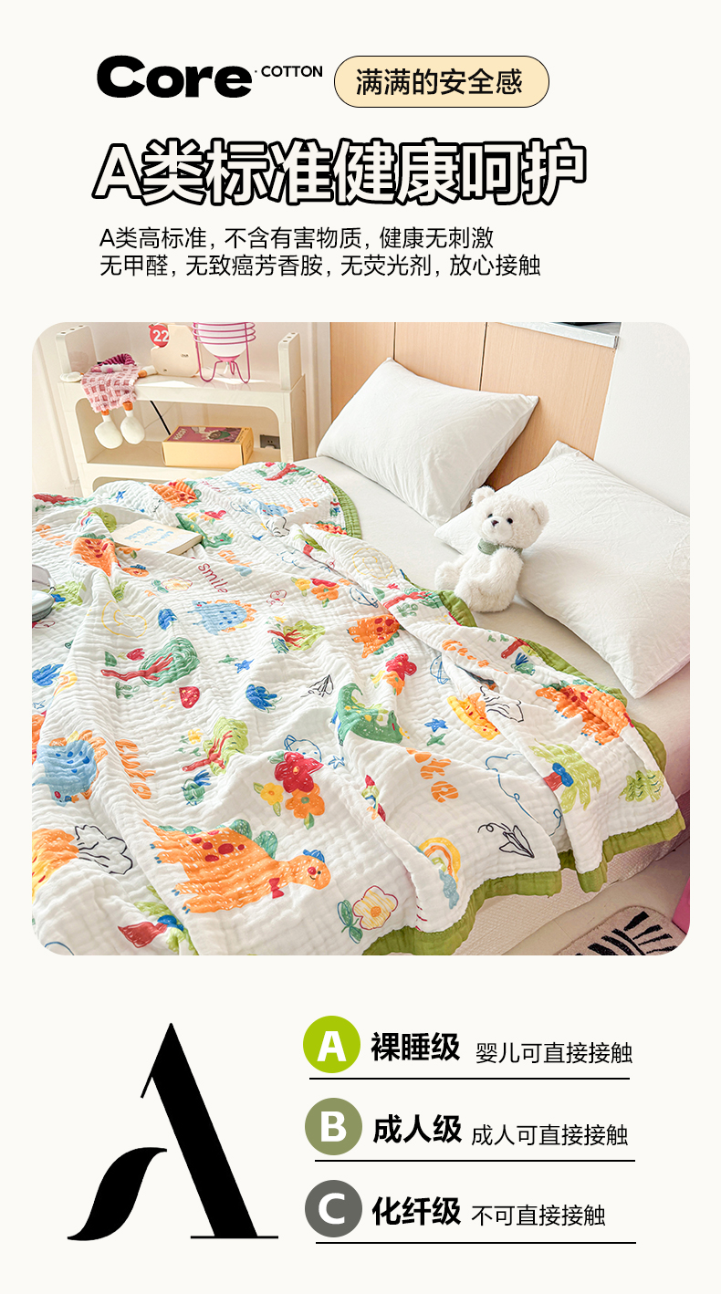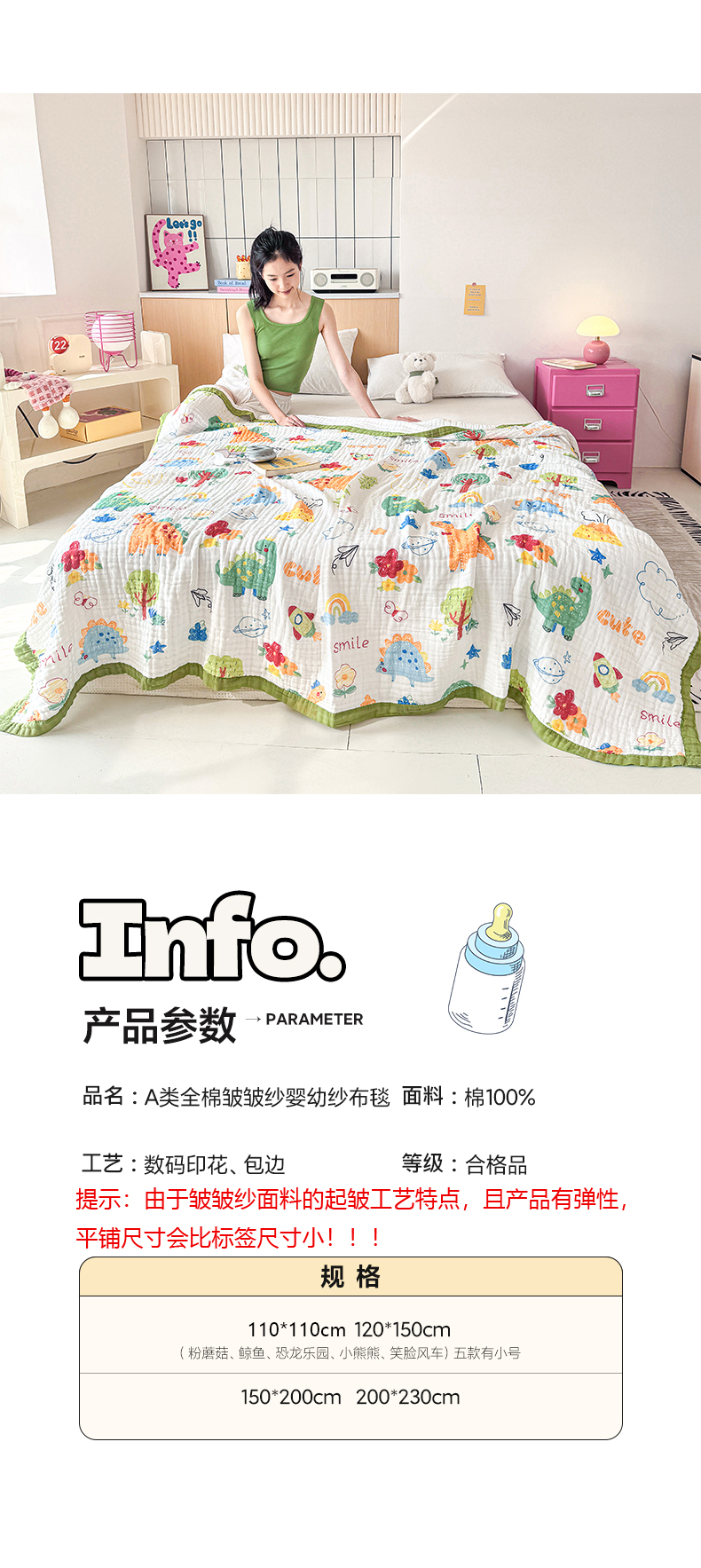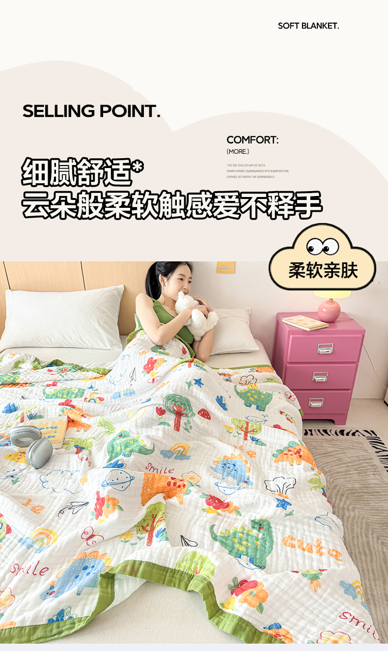 商品名称:棠薇家纺 2025新款全棉六层皱皱纱婴幼毯泡泡纱印花盖毯包被浴巾 恐龙乐园