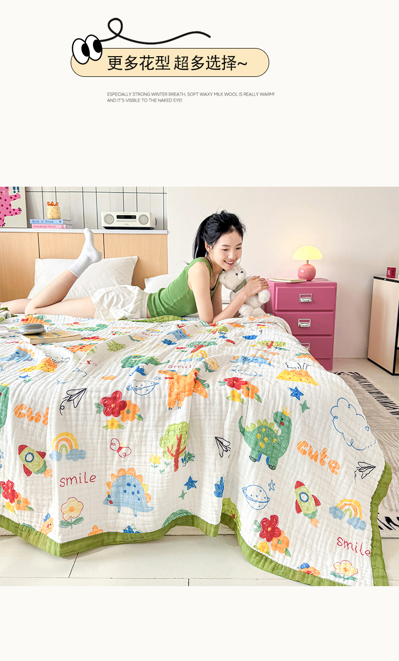 棠薇家纺 2025新款全棉六层皱皱纱婴幼毯泡泡纱印花盖毯包被浴巾 恐龙乐园