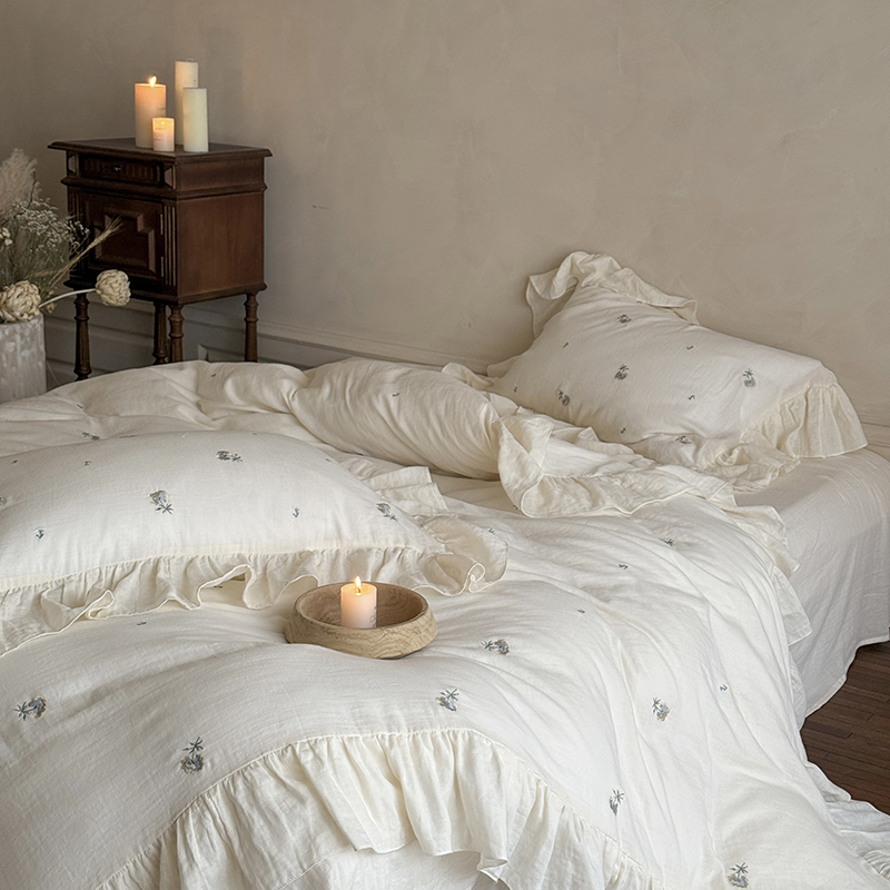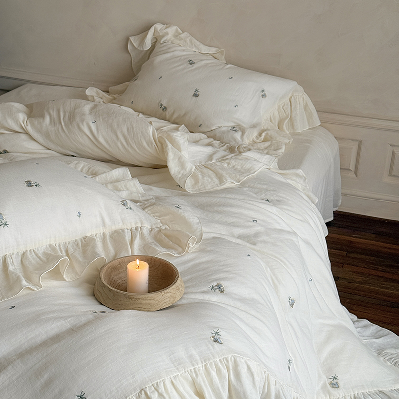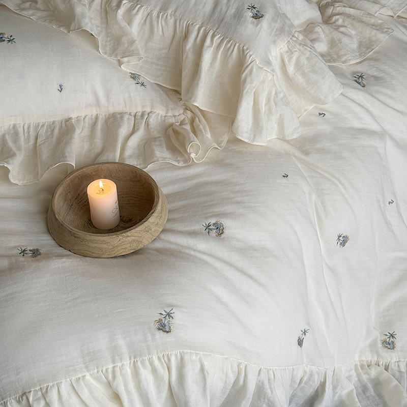 佳汐蓝 2025春夏新品双层皱皱纱刺绣+荷叶边四件套--花与浔 奶白