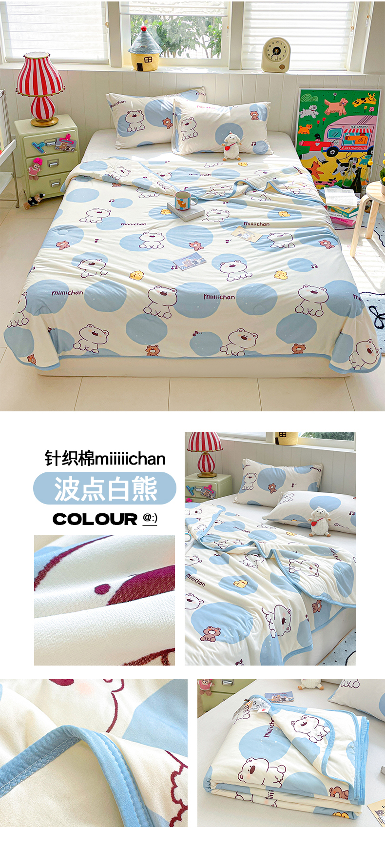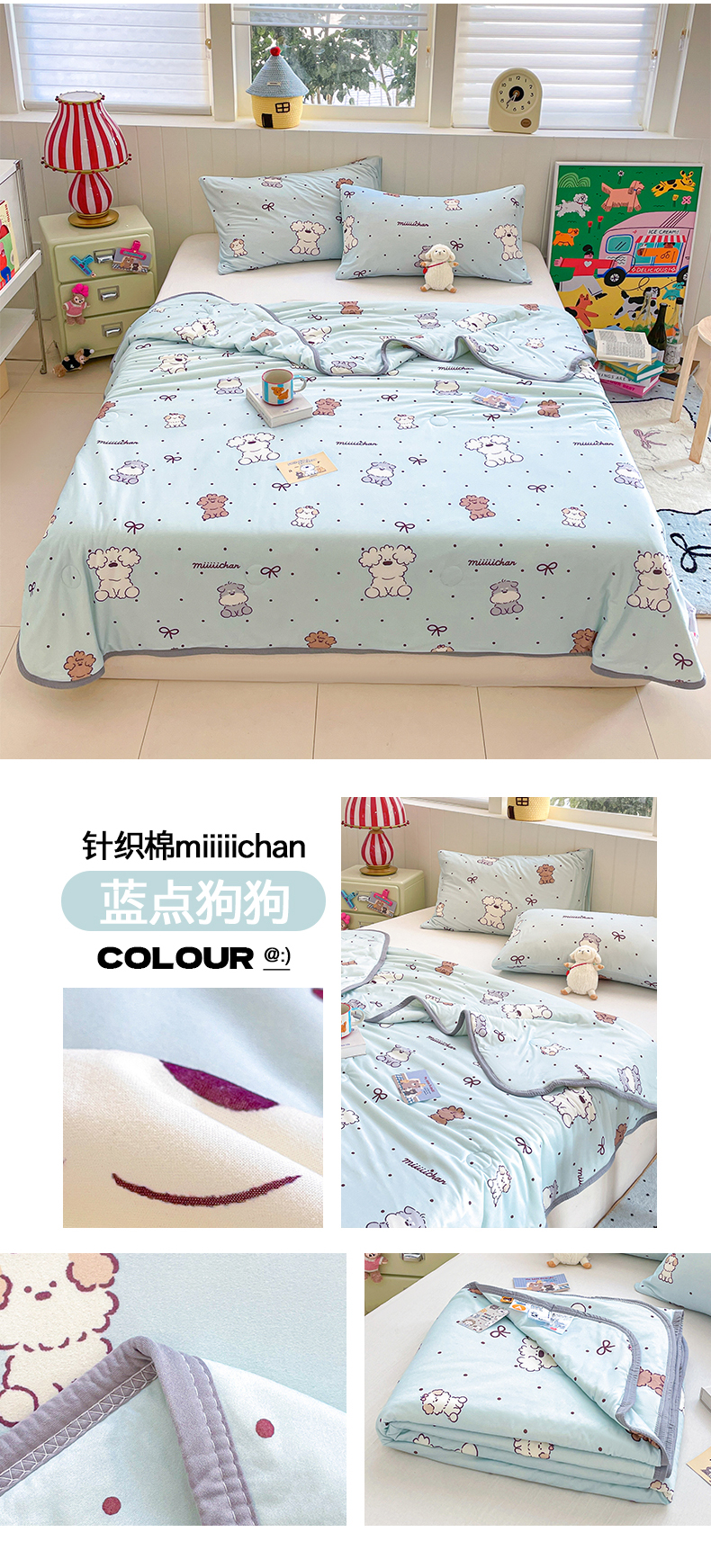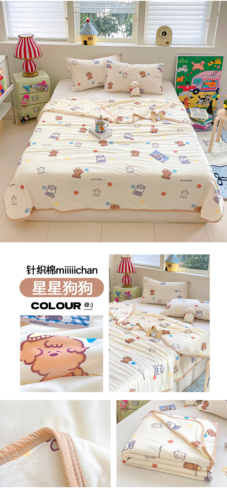 商品名称:桃子家居 2025新款A类高品质正版授权miiiiichan可爱卡通狗狗白熊女孩牛奶丝针织棉夏被夏凉被空调被 组合图仅供展示