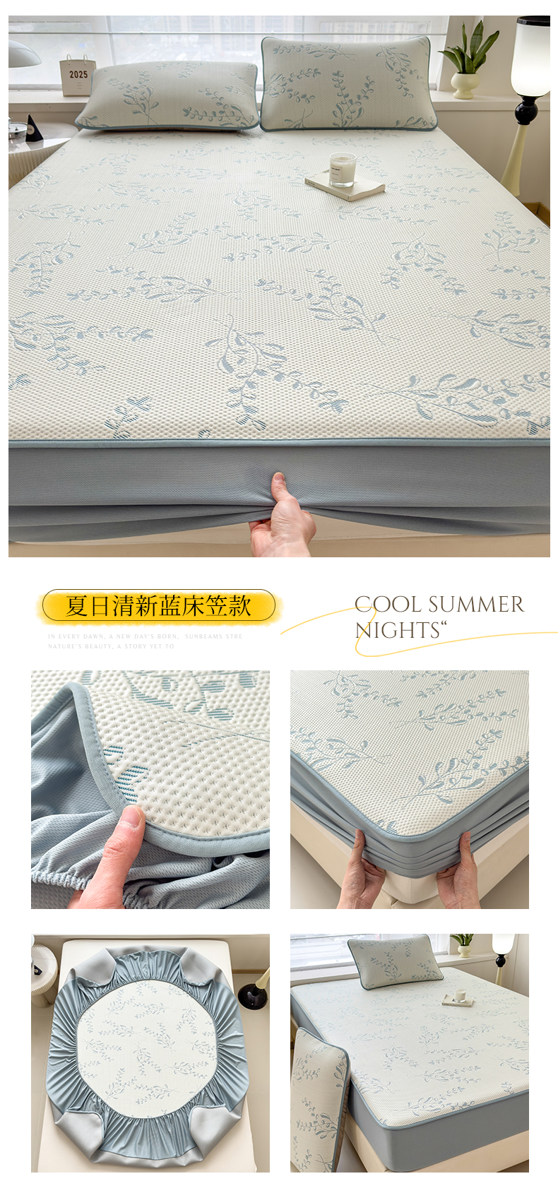 2025年新款PE豆豆提花凉席花卉系列-床笠款 夏日清新蓝