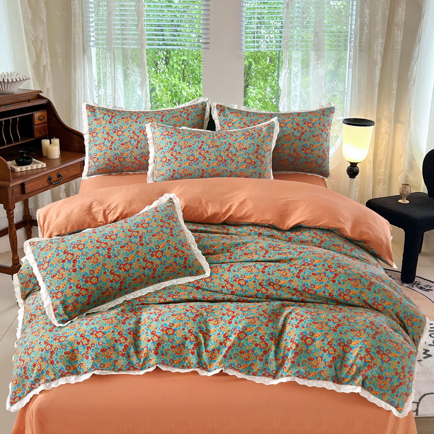(总)2025新款云感木棉皱皱双层纱全棉花边四件套