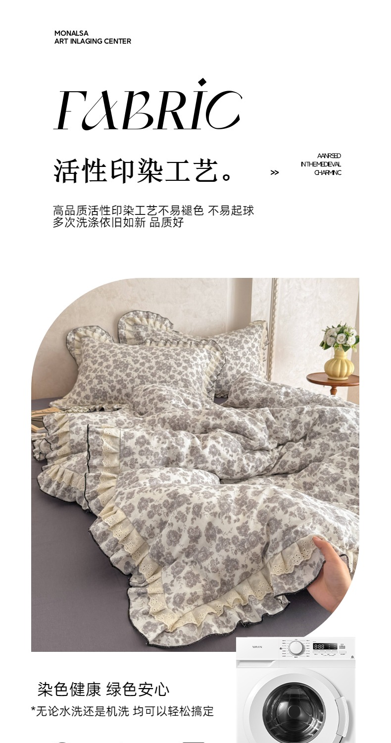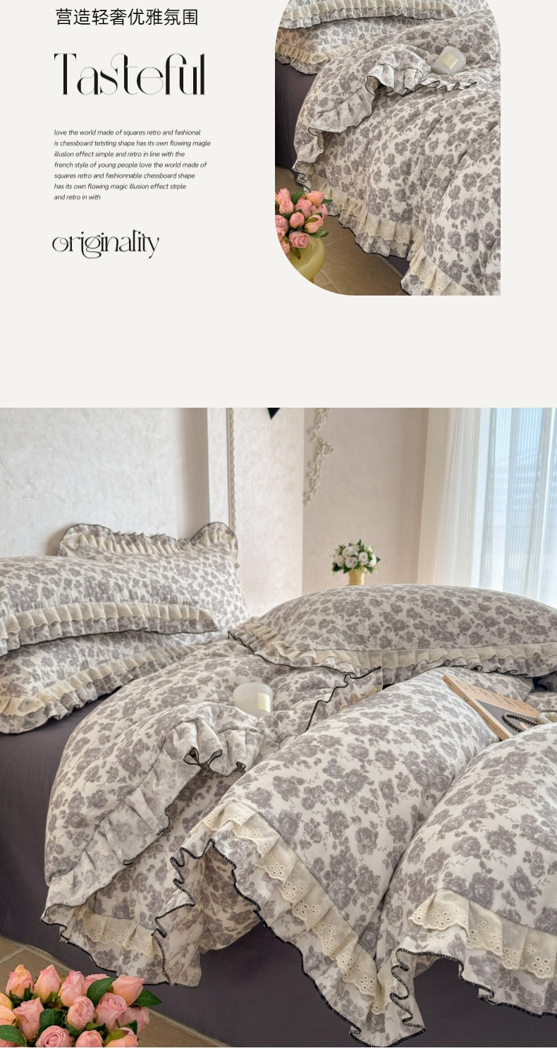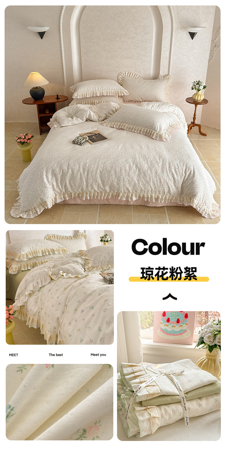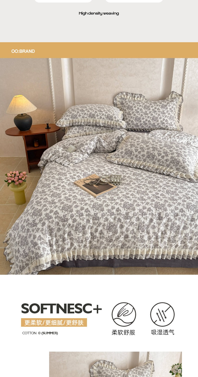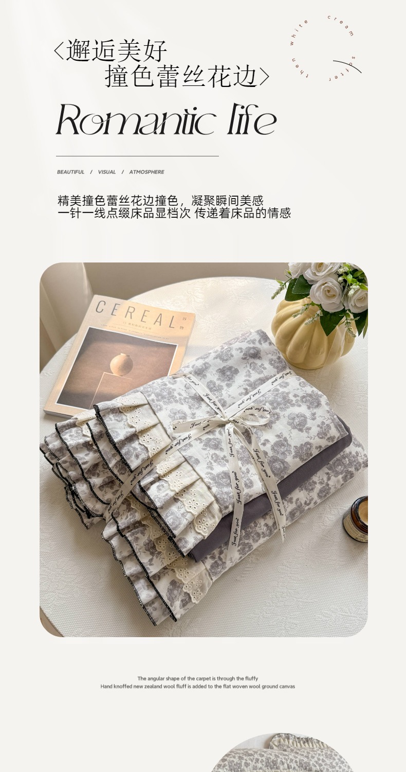 商品名称:(总)简宜家居(朝初家纺) 2025新款40s全棉纯棉双层纱撞色蕾丝花边四件套