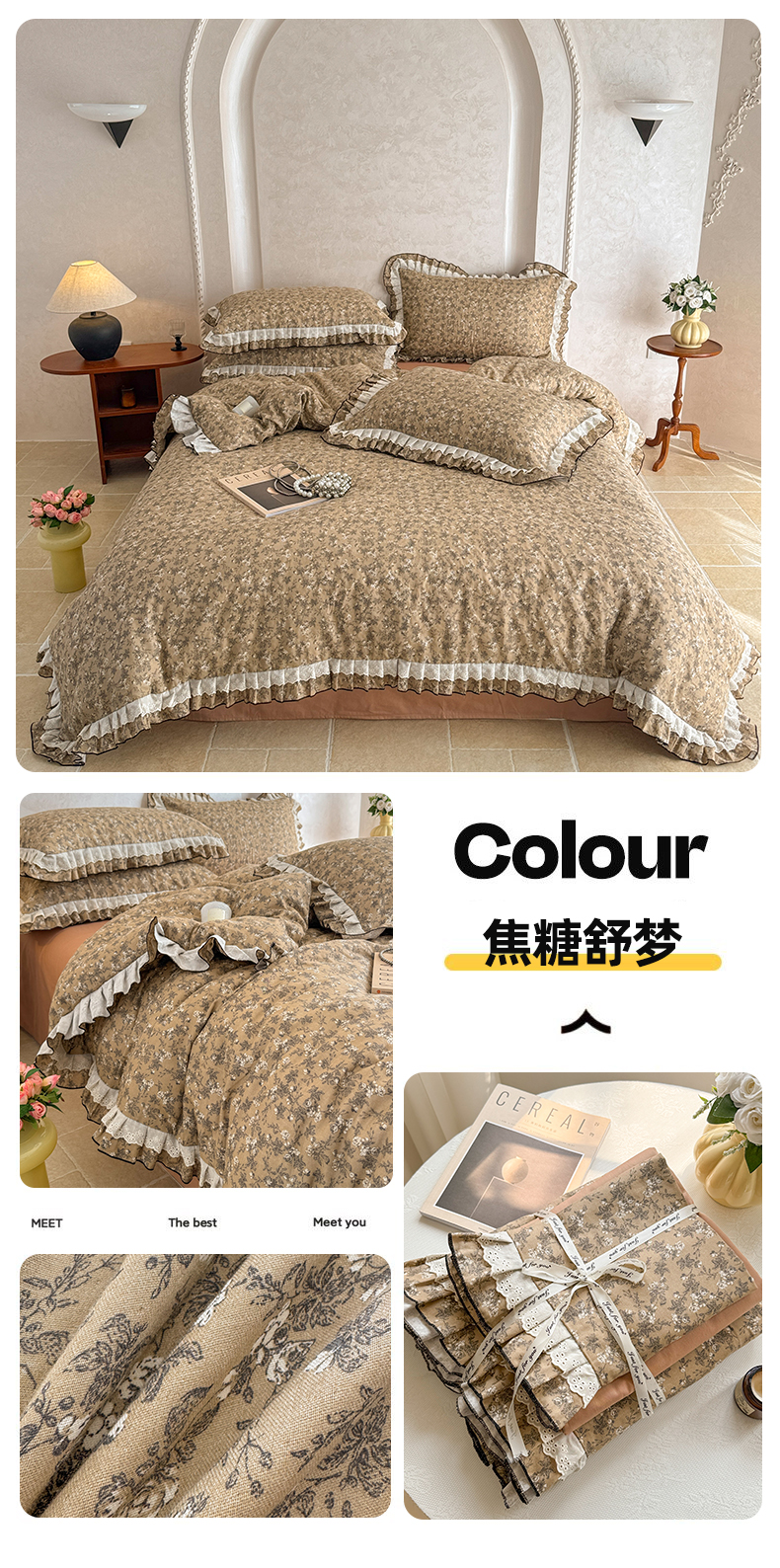 (总)简宜家居(朝初家纺) 2025新款40s全棉纯棉双层纱撞色蕾丝花边四件套