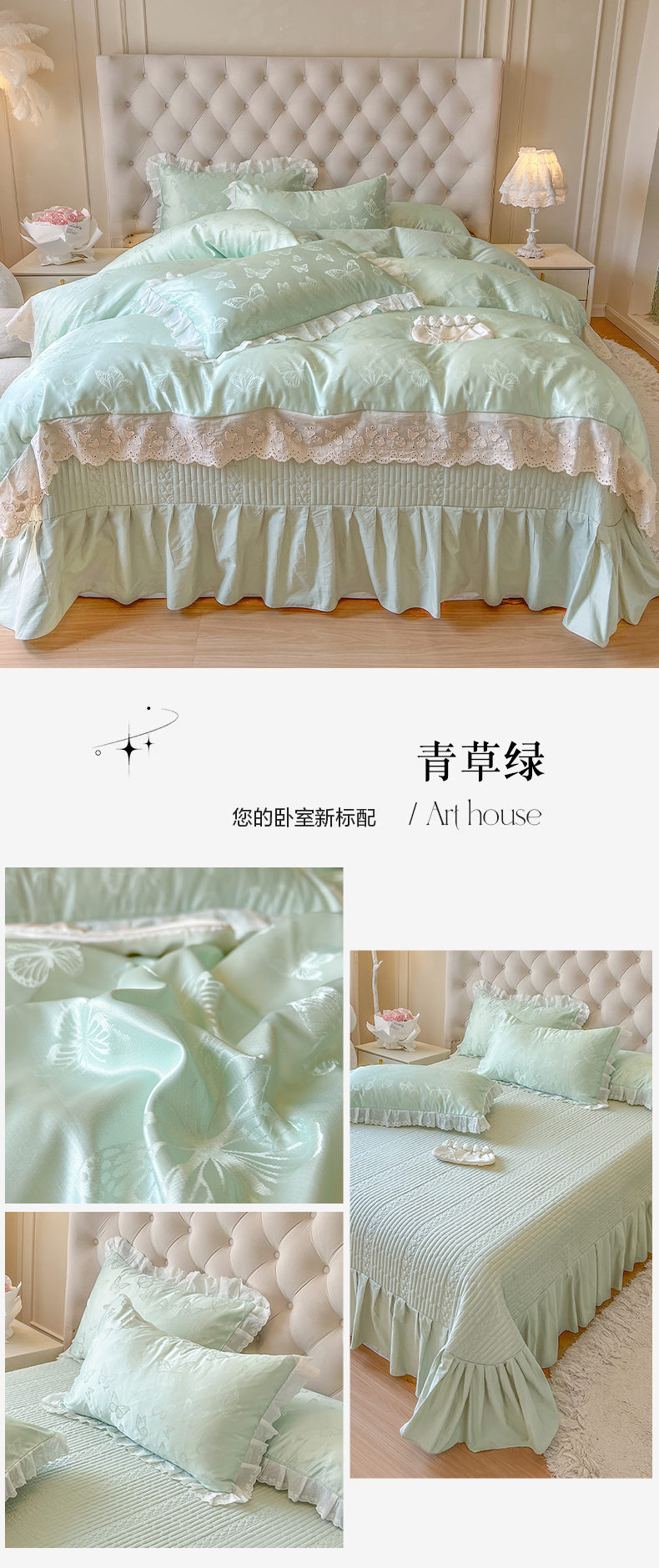 商品名称:瑞宝 2025新款法式花边贡缎提花床盖四件套-蝶与梦 青柠绿