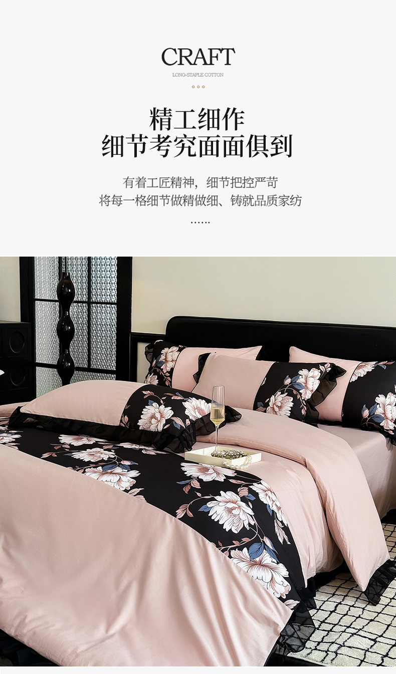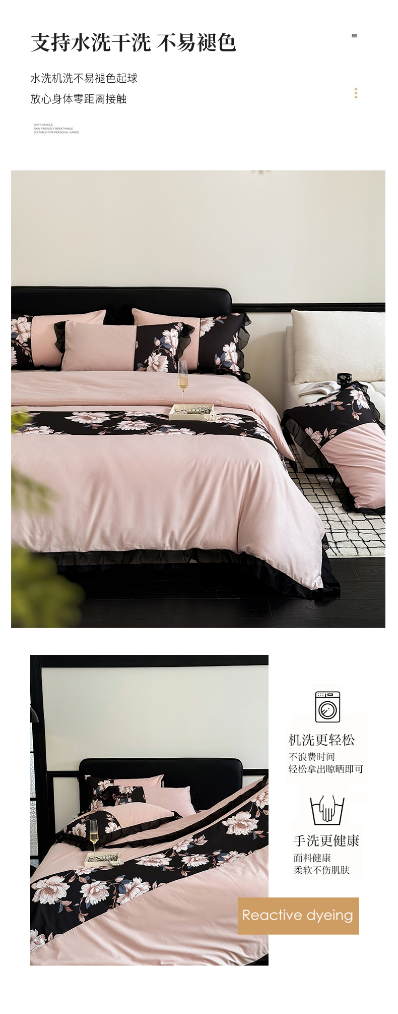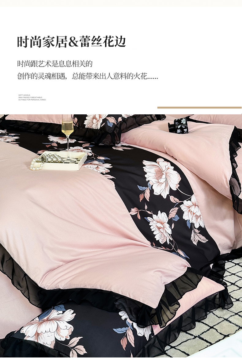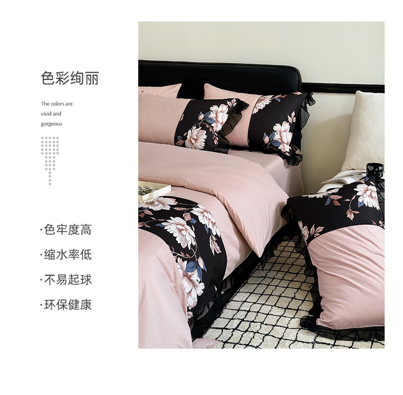 商品名称:宅家居 2025新款轻法式复古风拼接印花纯棉长绒棉韩式黑色花边40支全棉四件套-赫琳娜 赫琳娜-豆沙粉