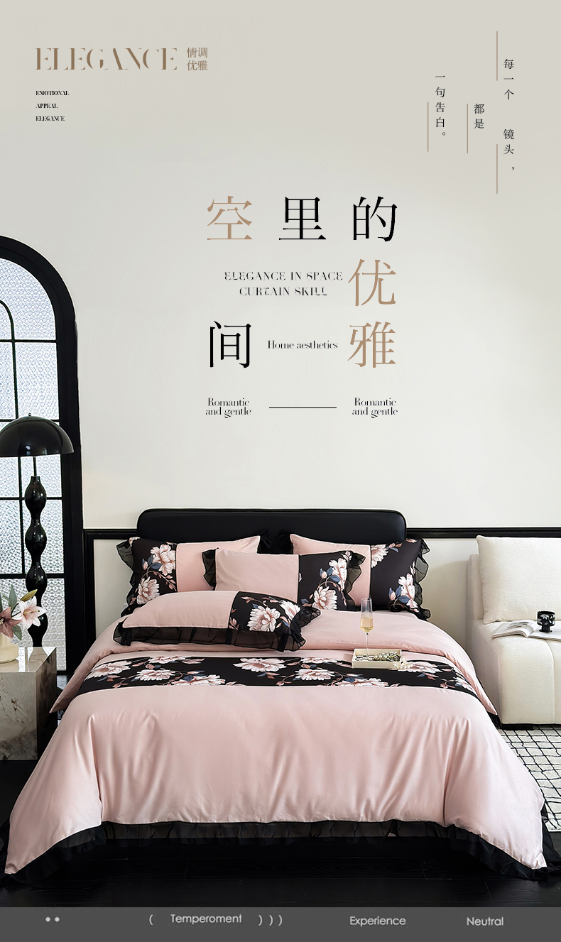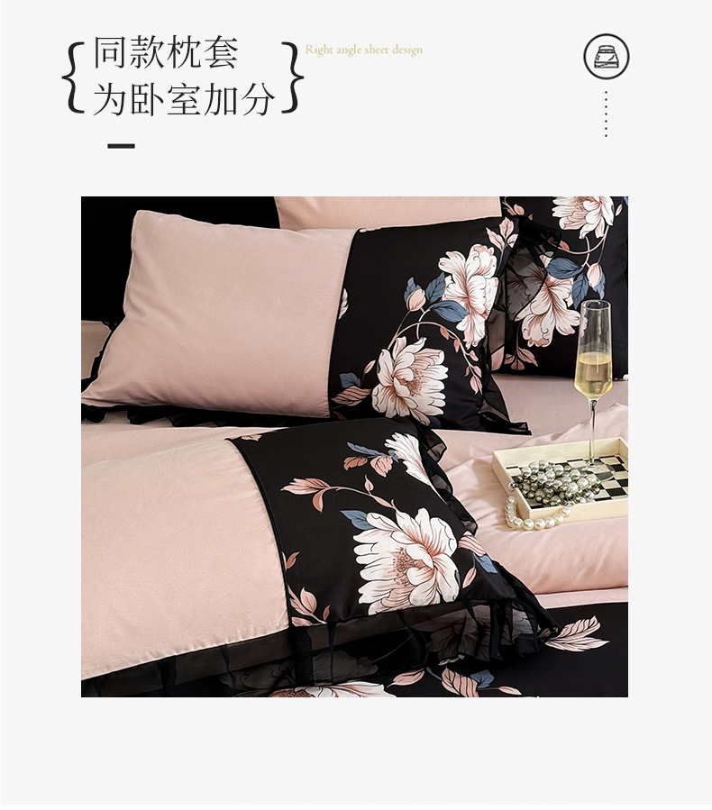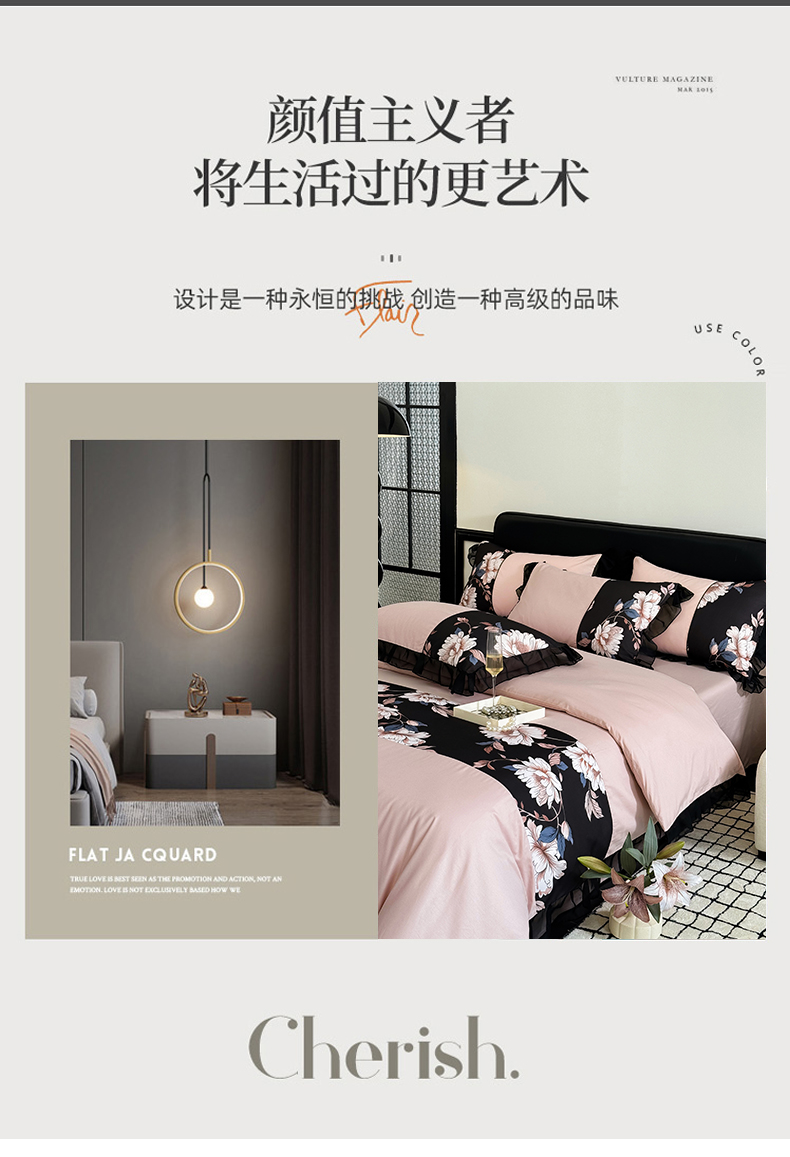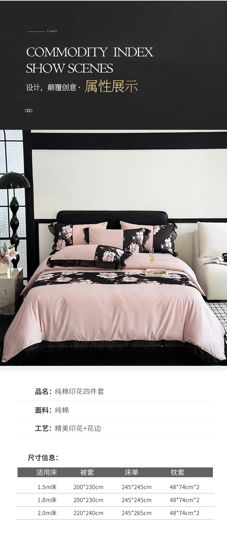 商品名称:宅家居 2025新款轻法式复古风拼接印花纯棉长绒棉韩式黑色花边40支全棉四件套-赫琳娜 赫琳娜-豆沙粉