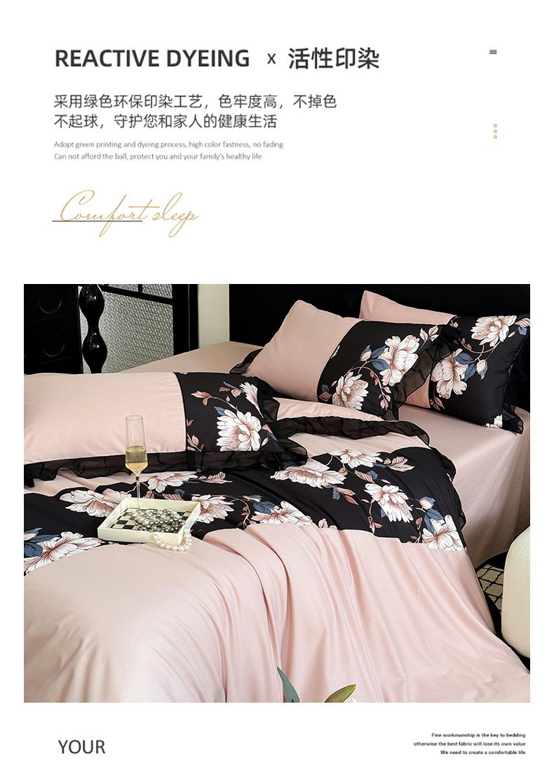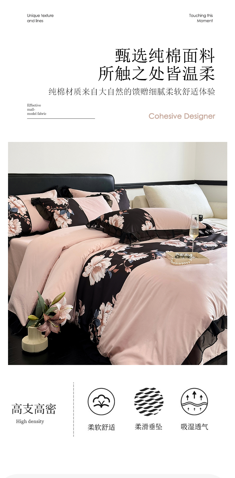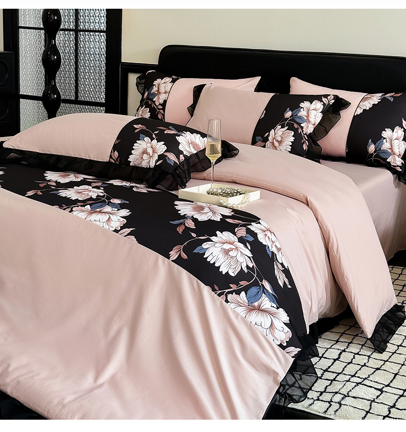 宅家居 2025新款轻法式复古风拼接印花纯棉长绒棉韩式黑色花边40支全棉四件套-赫琳娜 赫琳娜-豆沙粉