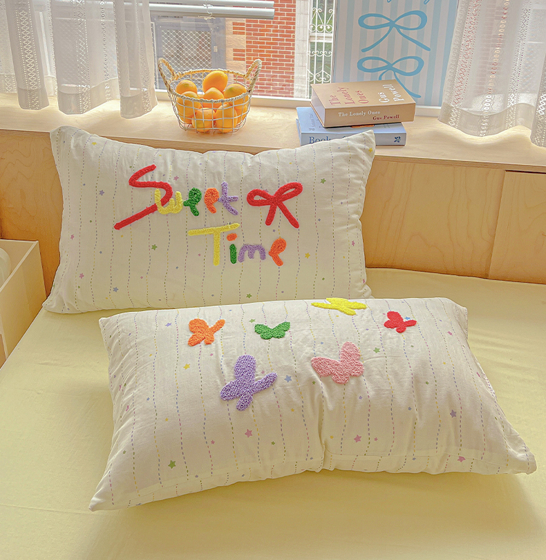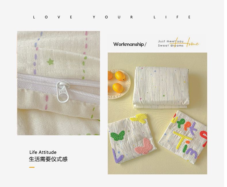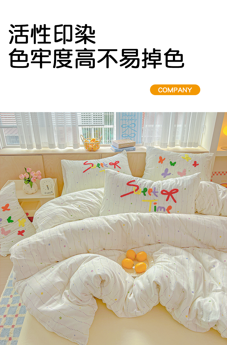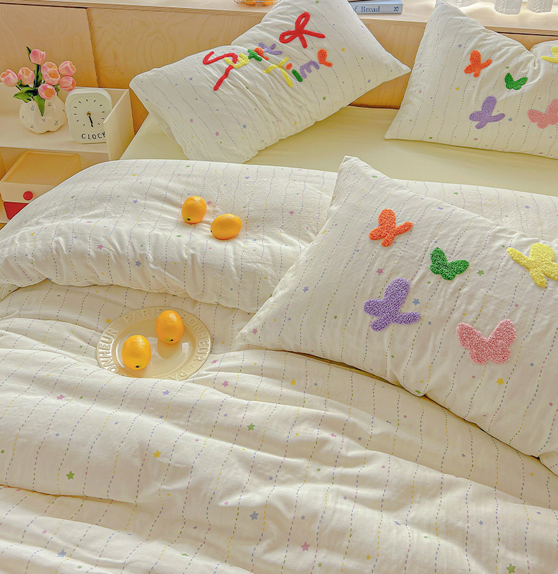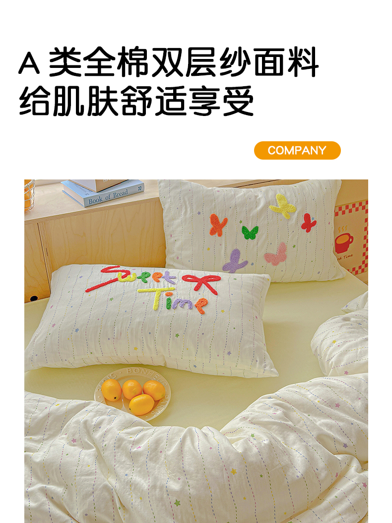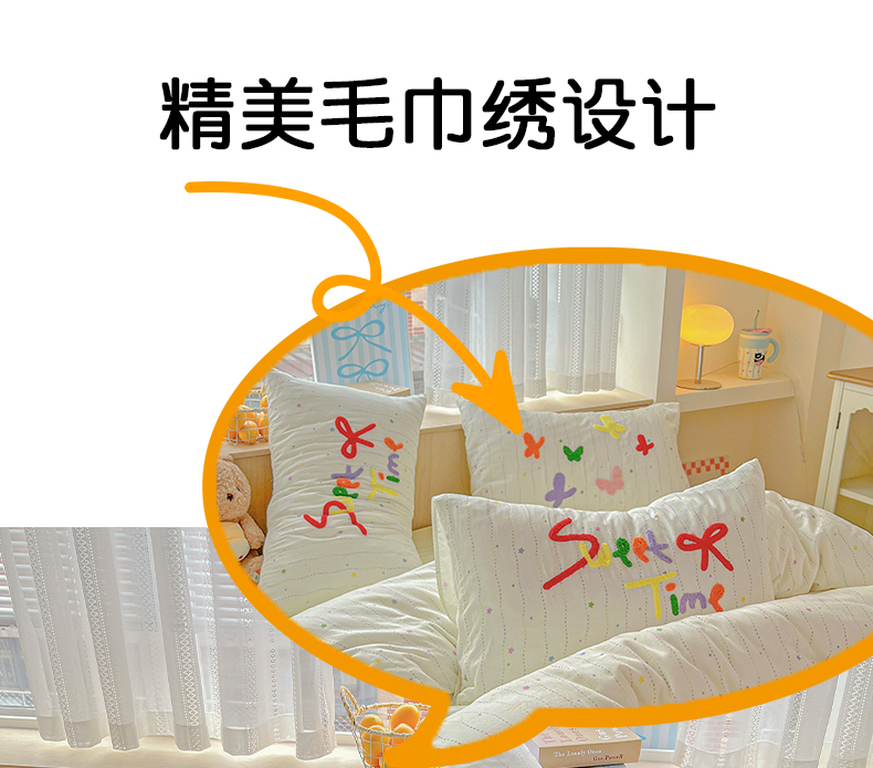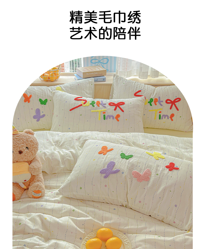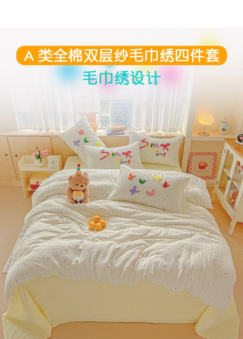 (总)静家居-简约原创家纺 2025新款A类全棉双层纱sweet毛巾绣四件套,彩墨流砂,大彩,蝶舞,小熊软糖,星线