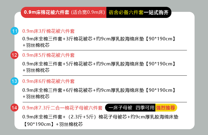 【海绵床垫床单款】0.9m床7.3斤羽丝棉子母被六件套 | ¥261.00 |