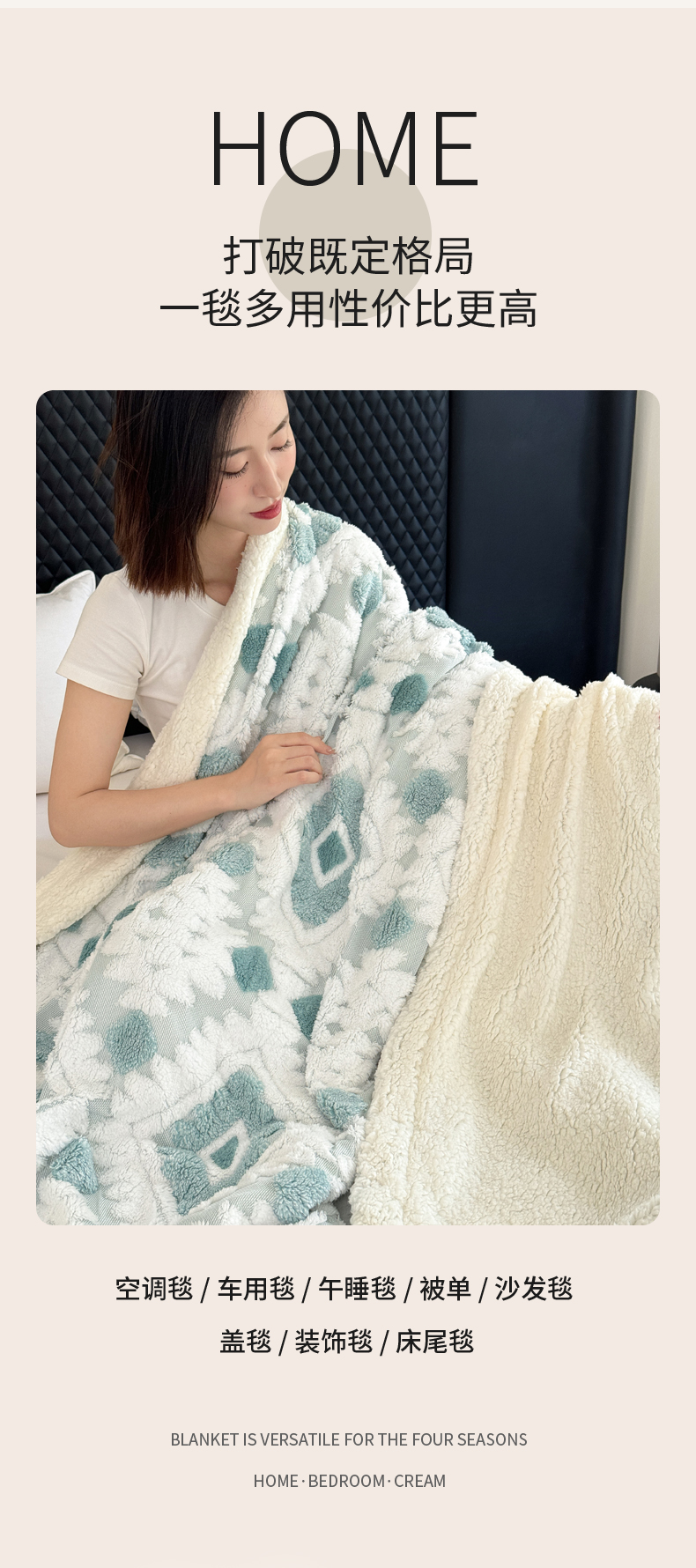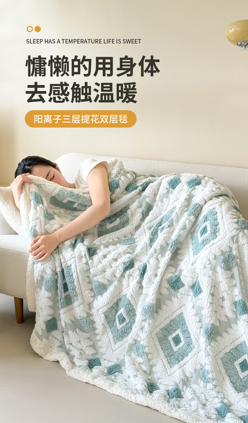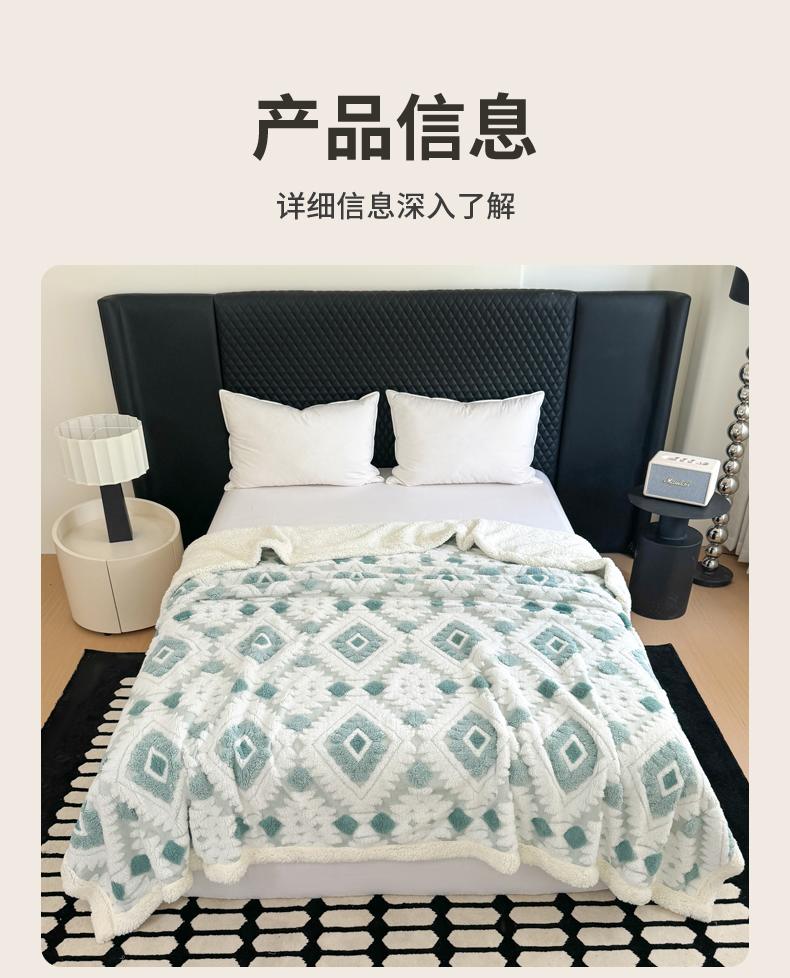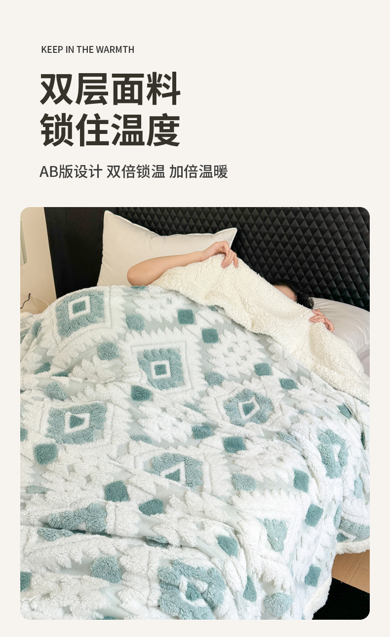 商品名称:丹本家纺 2025新款轻奢阳离子提花镂空塔芙绒羊羔绒保暖午睡双层毛毯办公室盖毯 蓝色