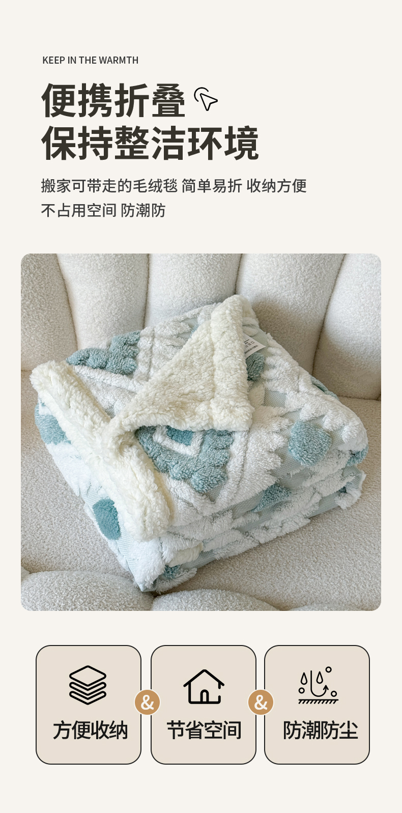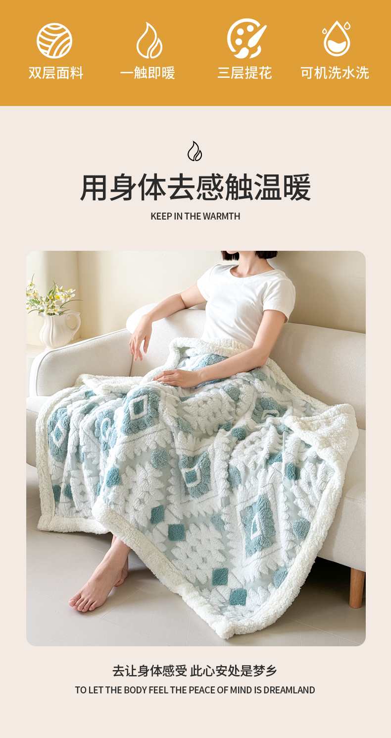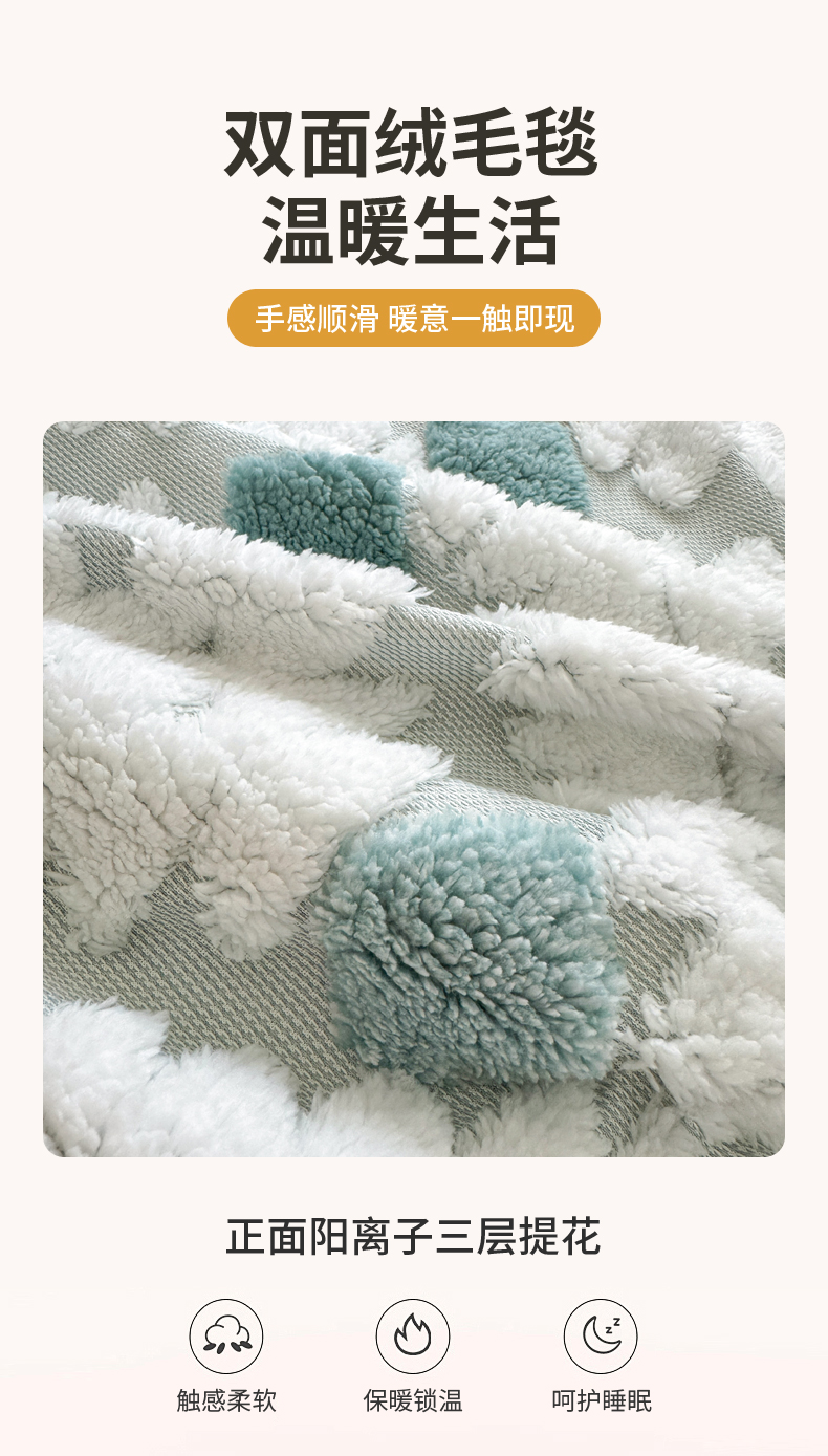 商品名称:丹本家纺 2025新款轻奢阳离子提花镂空塔芙绒羊羔绒保暖午睡双层毛毯办公室盖毯 蓝色