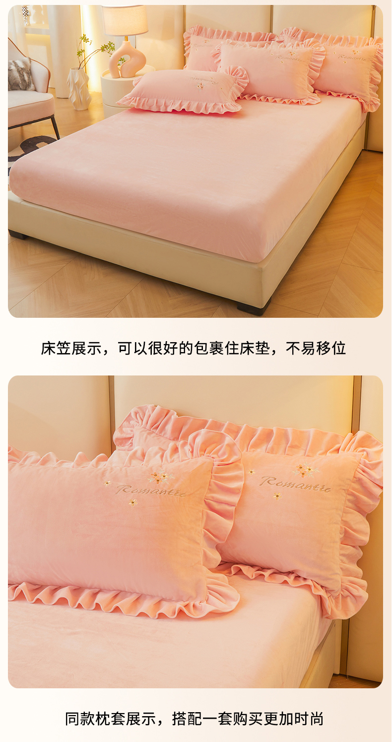 (总)怡源梦 2025新款A类牛奶绒夹棉床笠三件套-甜心公主系列,灰色,咖色,大红色,粉玉色,绿色,米白色,紫色