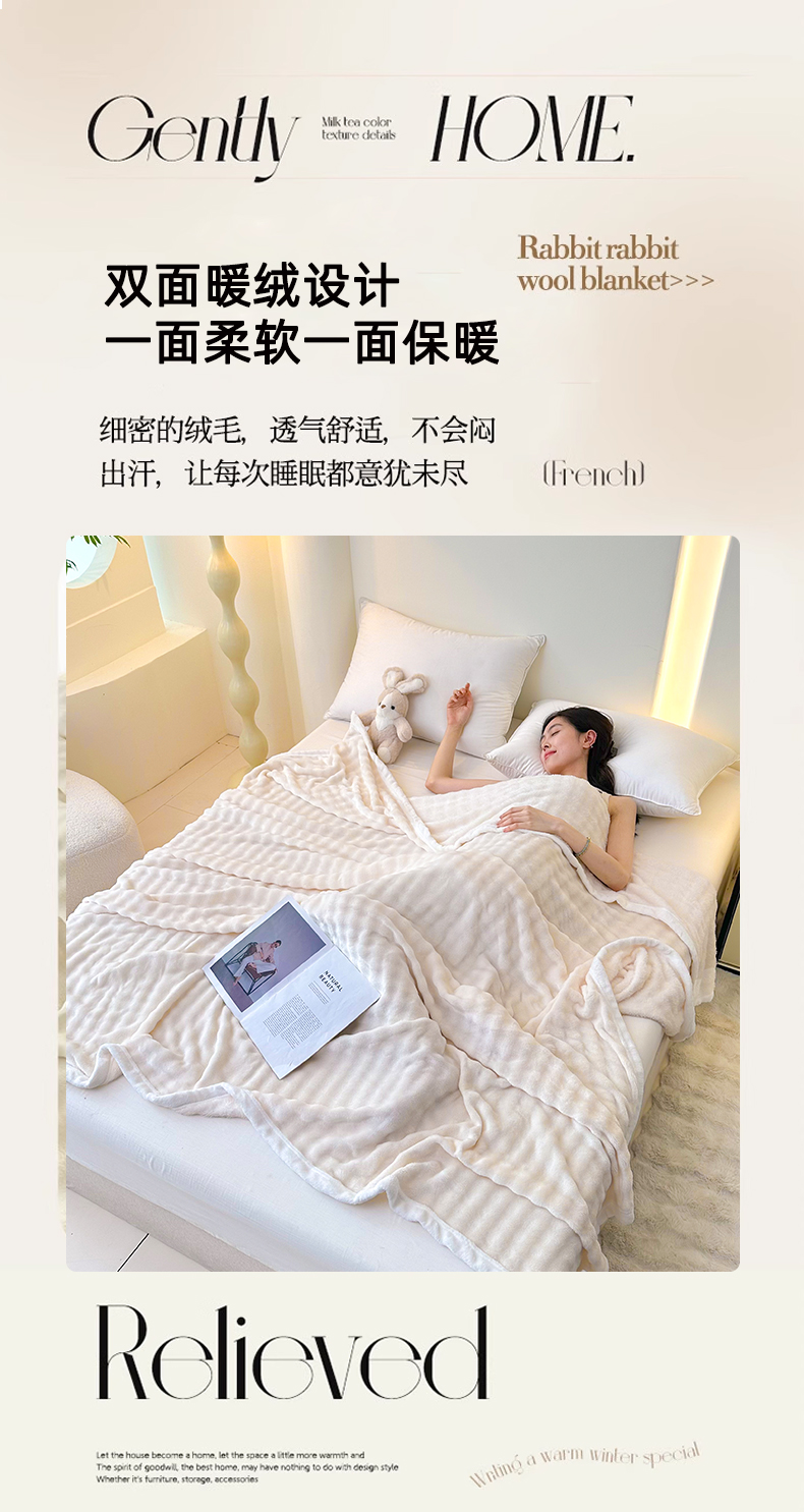 无瑕家居 2025新款跨境多功能毛毯高克重法莱绒牛奶绒珊瑚绒兔兔绒包边毛毯毯子 兔兔绒-香芋紫