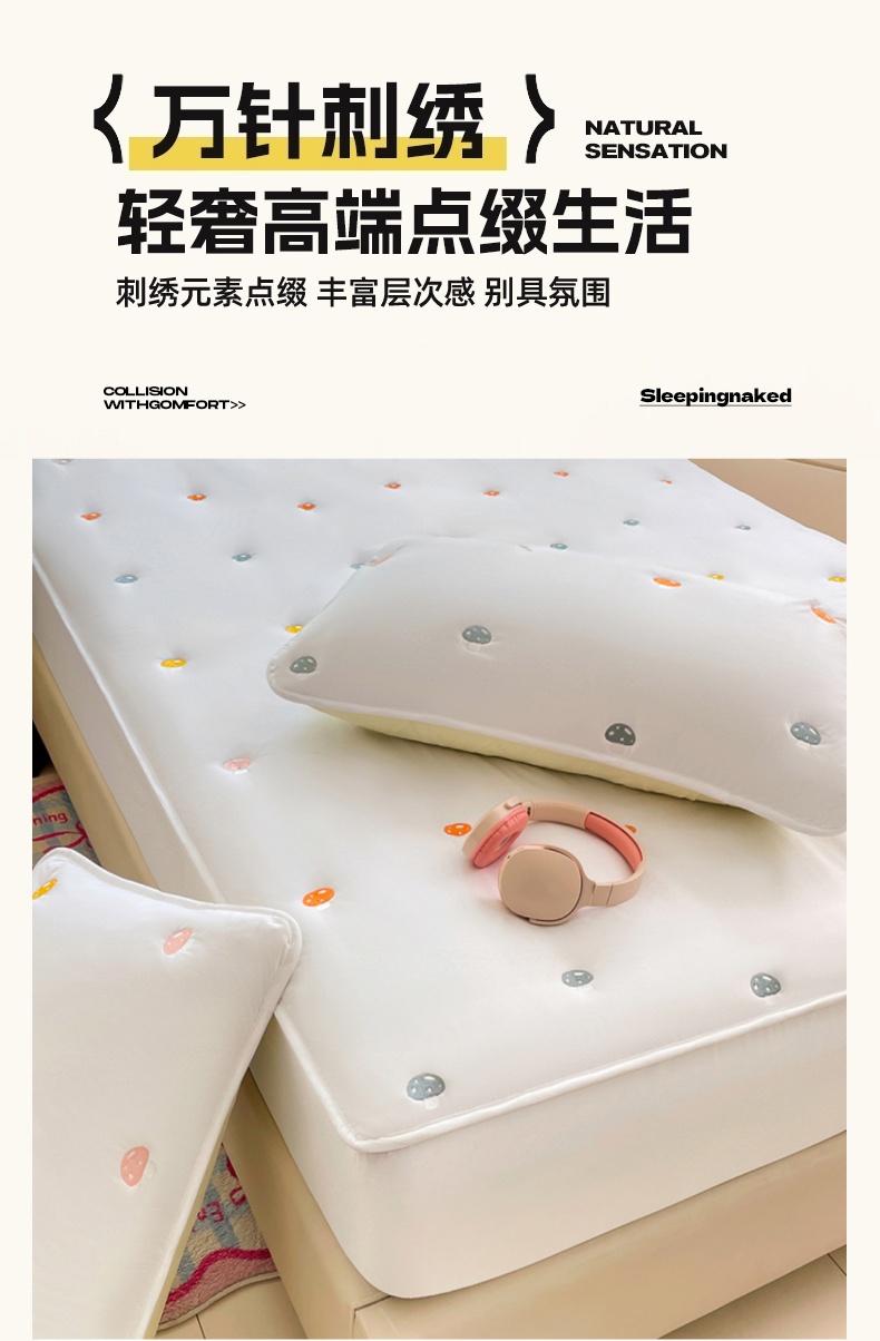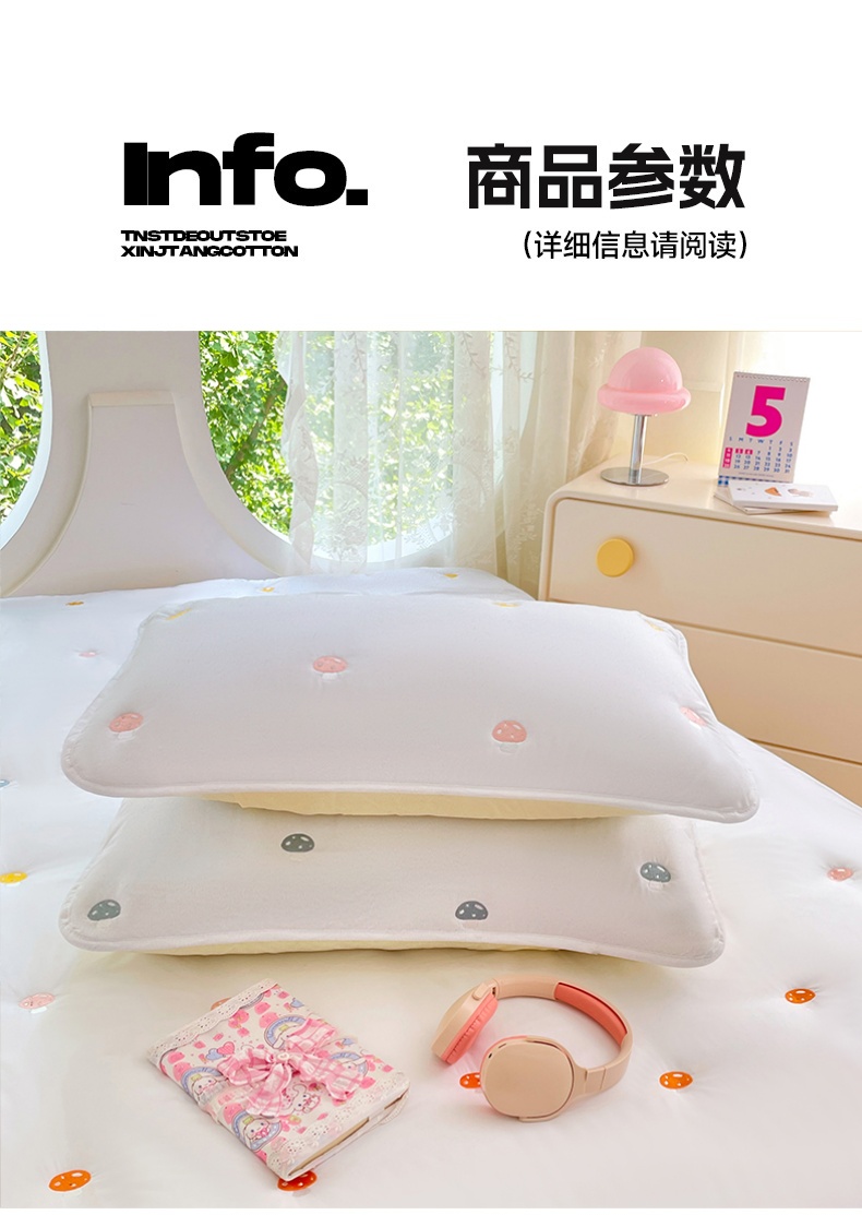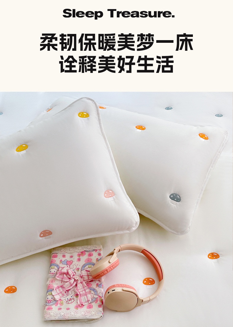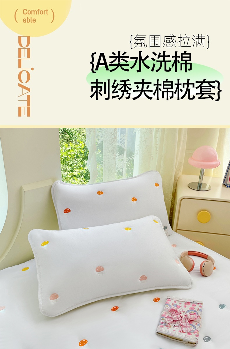 商品名称:梦舒羽 2025新款水洗棉刺绣夹棉枕套加厚宿舍学生枕头套枕芯套 蘑菇屋-本白色