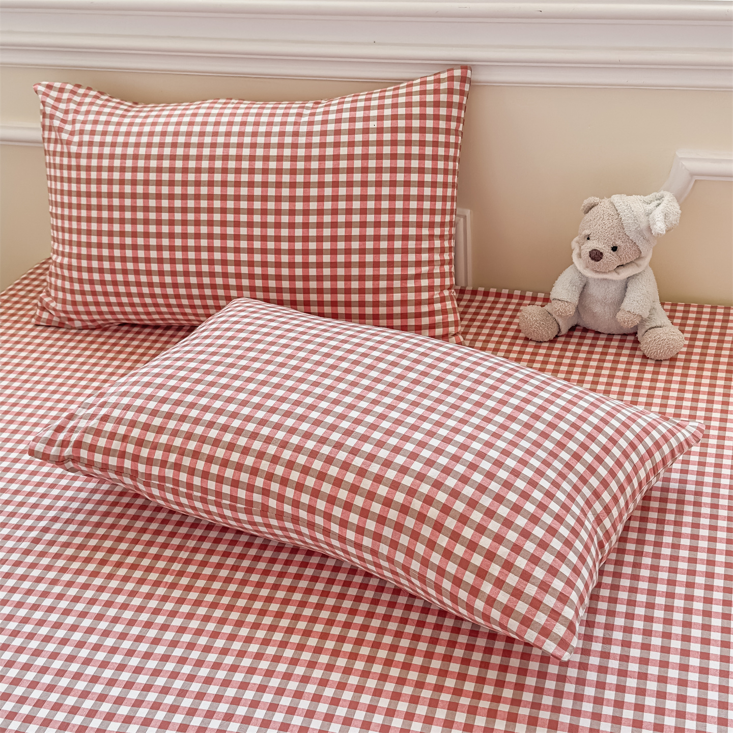 (总)菡宝 2025新款全棉纯棉色织小提花四件套支持定制定做尺寸,暴力熊卡其,暴力熊绿,大方块灰,大方块紫,千鸟格白,千鸟格灰,千鸟格绿,四叶草卡其
