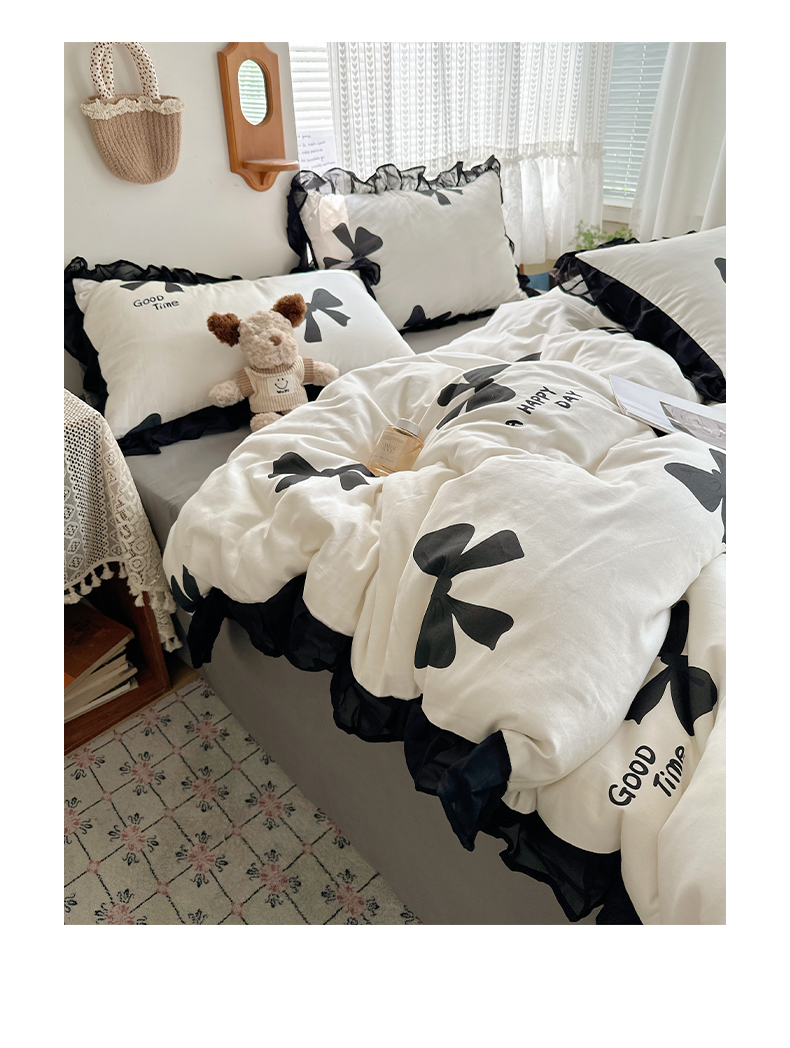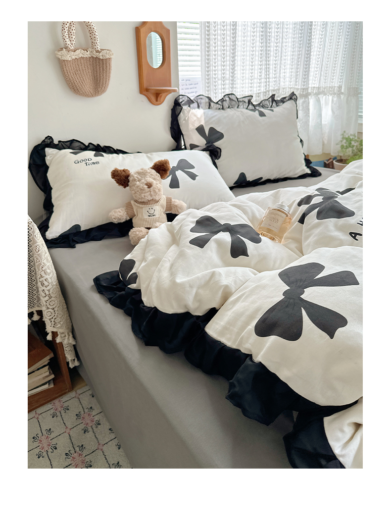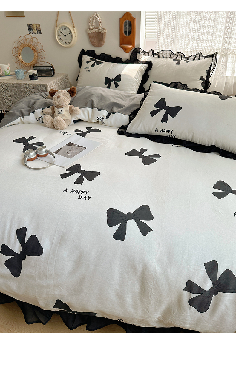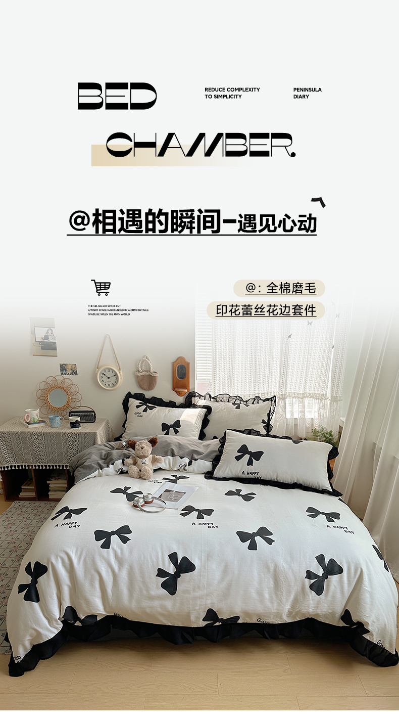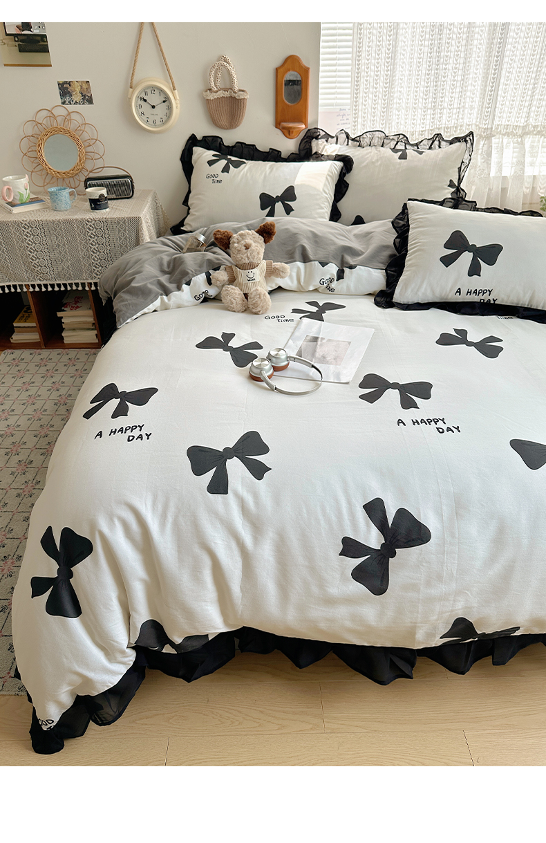 当前位置: 91家纺网 > 商品网购 > 床品套件 > 四件套 > 全棉普通四件套 > 雅居纺家纺 2025新款全棉纯棉赫本风磨毛蕾丝花边四件套-风格一 快乐蝴蝶结