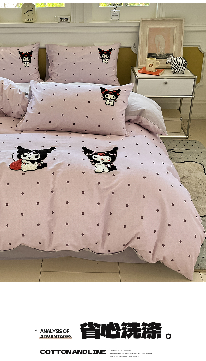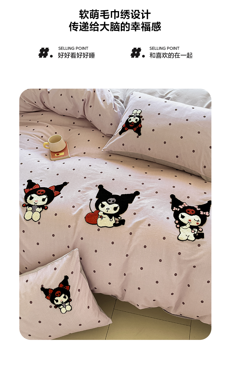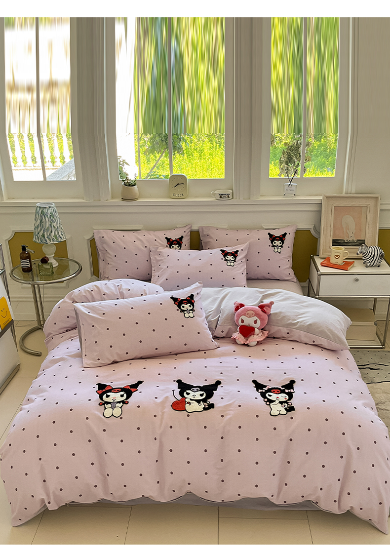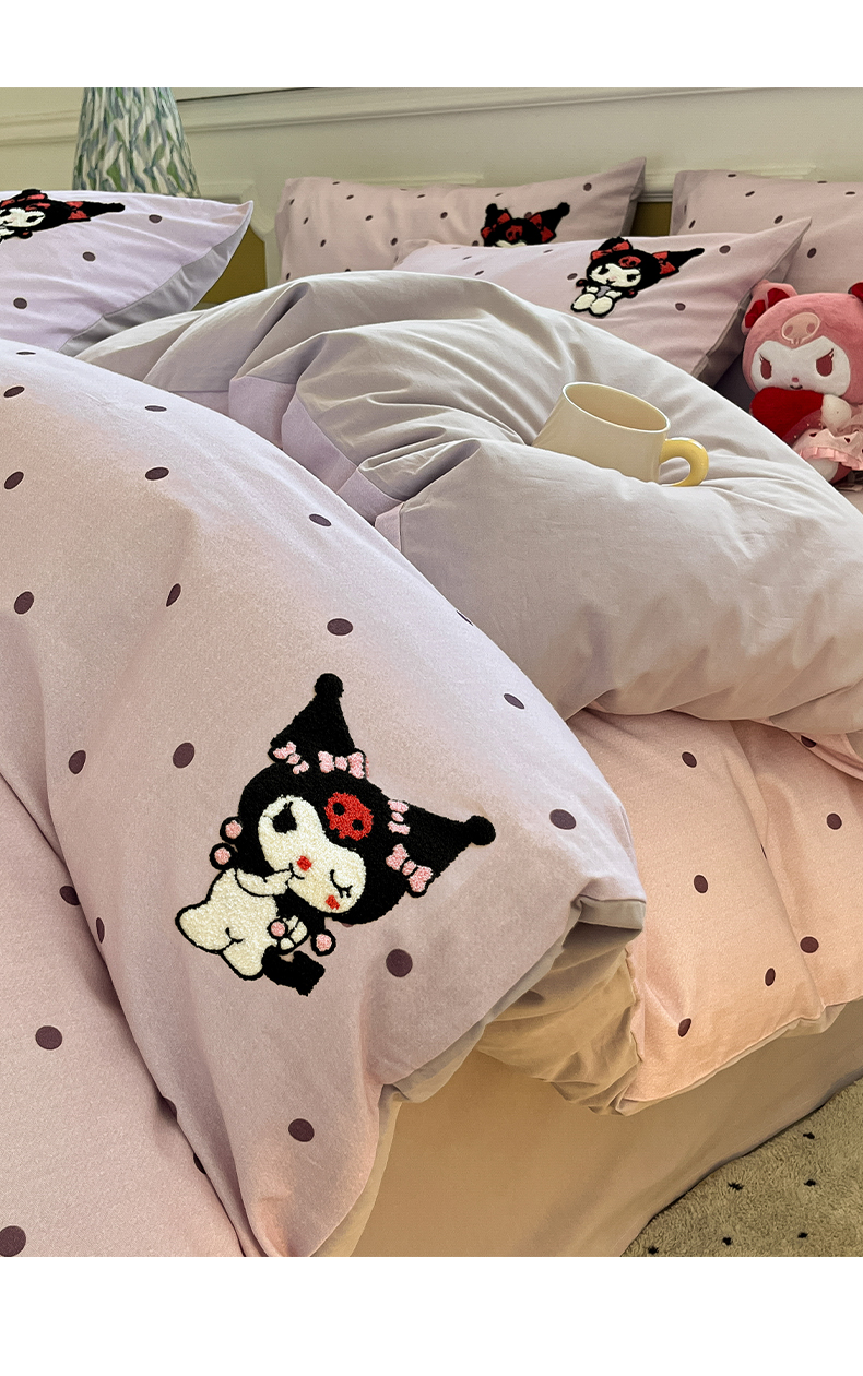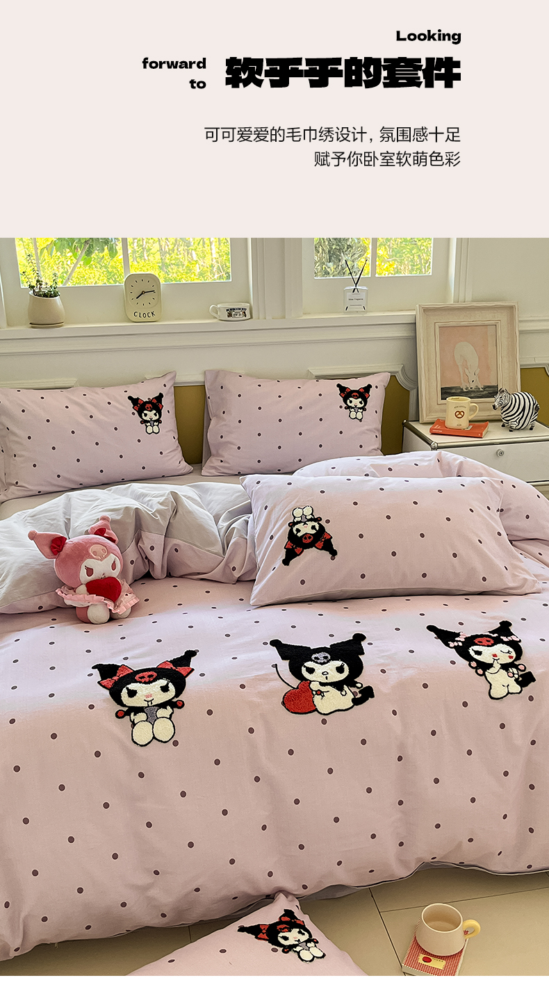 当前位置: 91家纺网 > 商品网购 > 床品套件 > 四件套 > 全棉普通四件套 > 雅居纺家纺 2025新款全棉纯棉磨毛三丽鸥毛巾绣四件套 波点库洛米