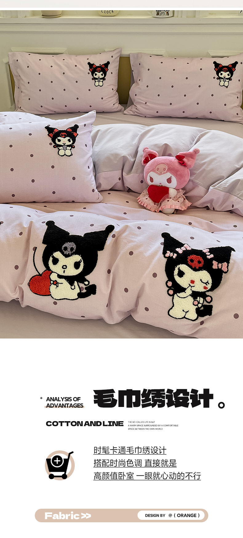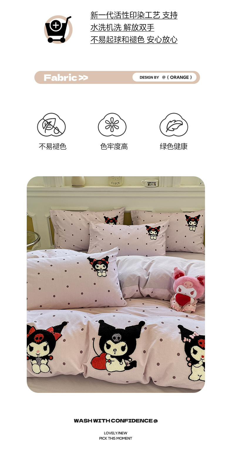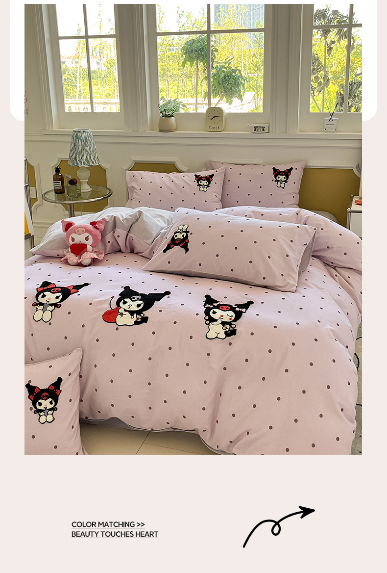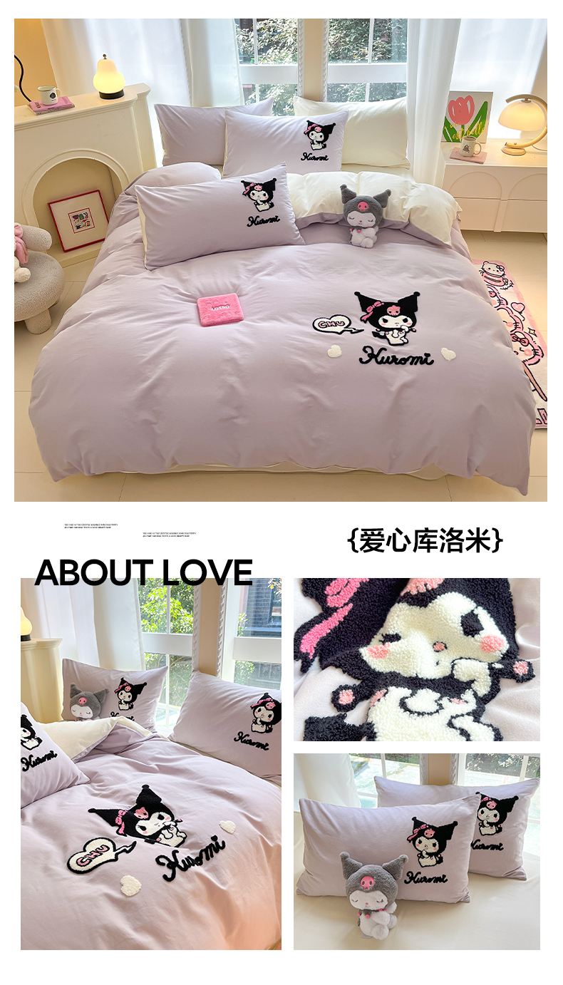 当前位置: 91家纺网 > 商品网购 > 床品套件 > 四件套 > 全棉普通四件套 > 雅居纺家纺 2025新款全棉纯棉磨毛三丽鸥毛巾绣四件套 波点库洛米
