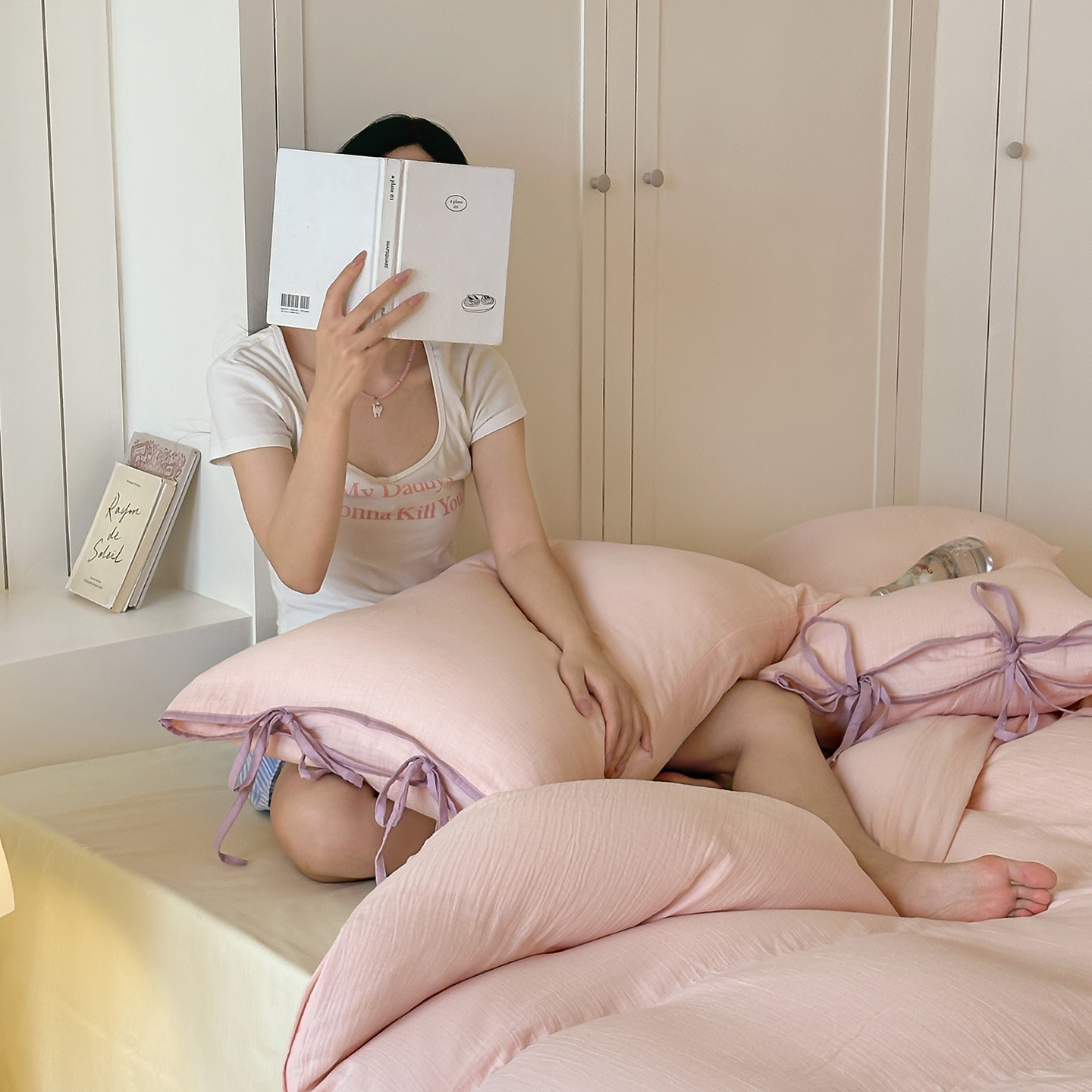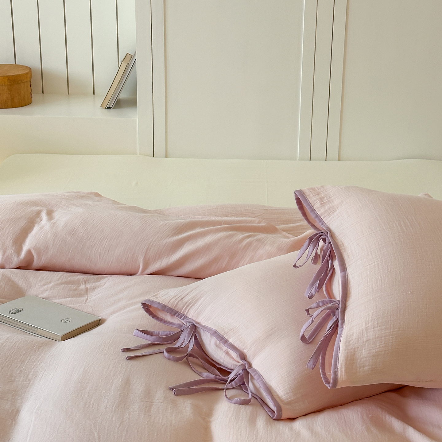 (总)小春日和 2025新款全棉双层纱A类母婴四件套纯棉提花纱布床上用品四件套纯色床单亲肤被套民宿套件1.8床笠,叙言-山雾,叙言-粉,叙言-蓝
