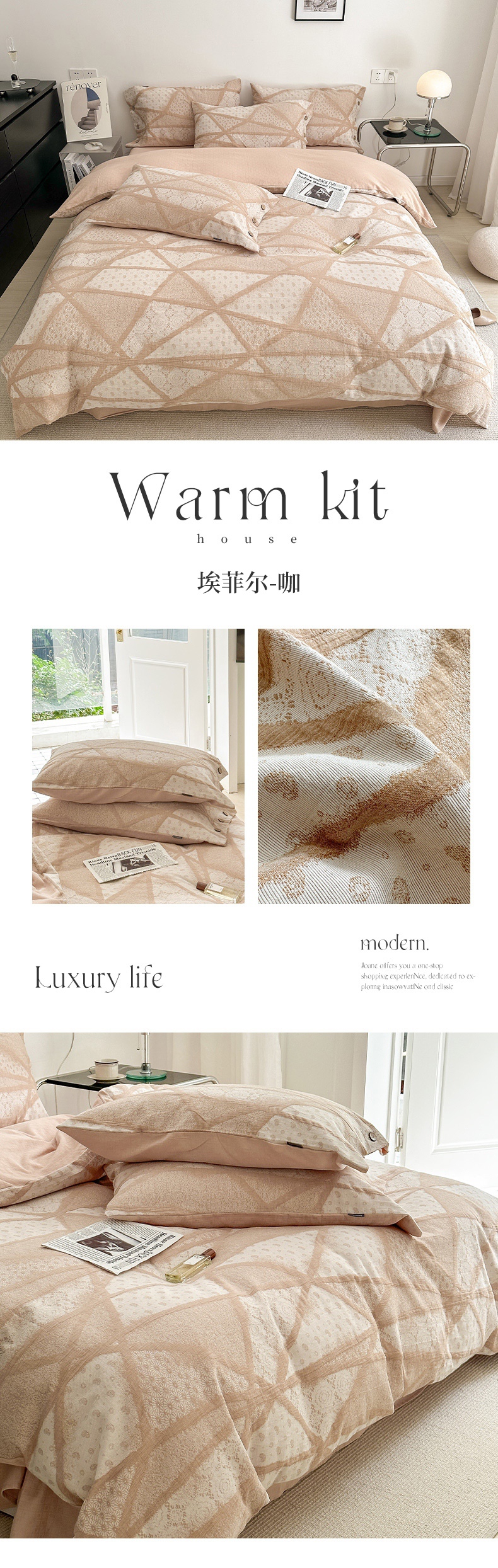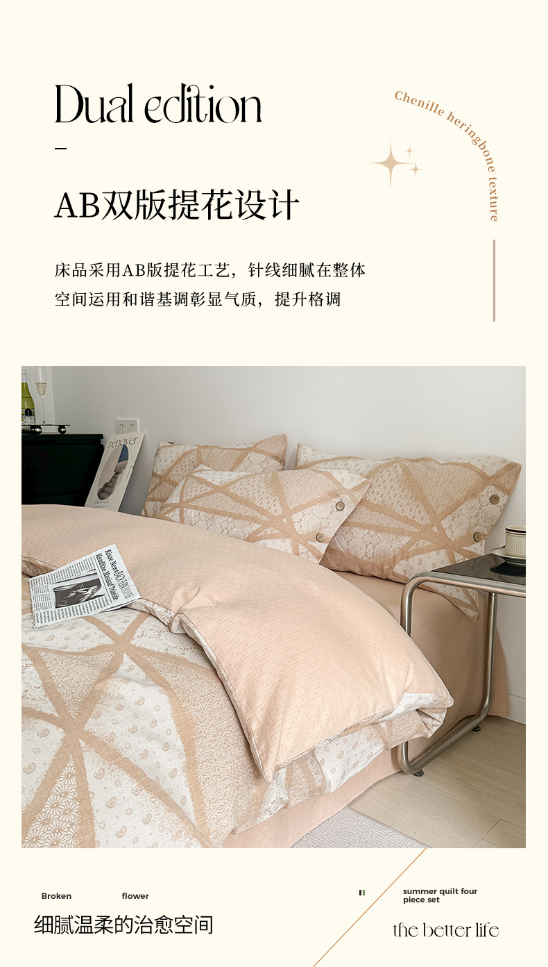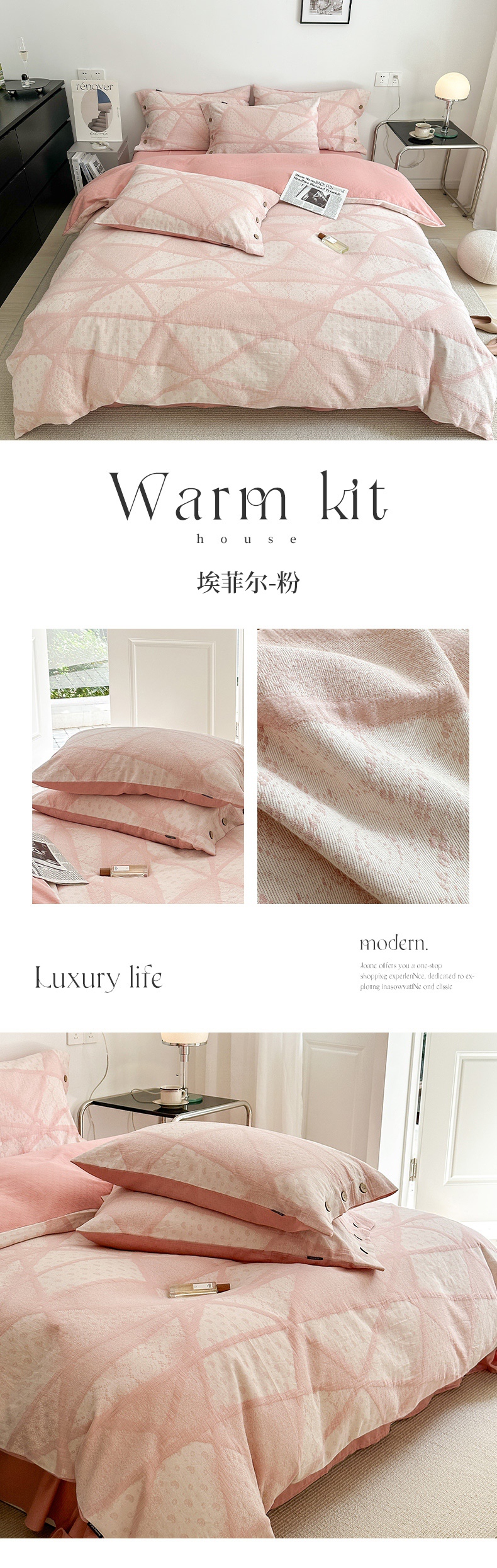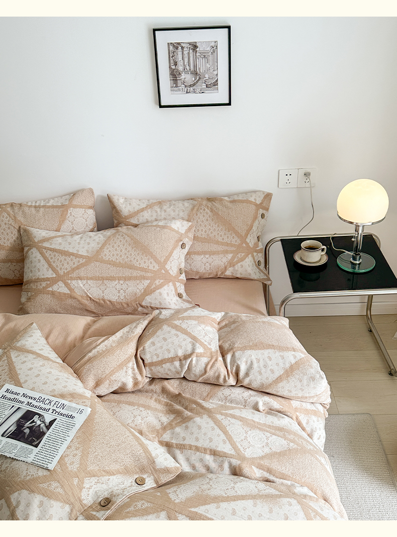 当前位置: 91家纺网 > 商品网购 > 床品套件 > 四件套 > 全棉普通四件套 > 贝尔 PELLHOME 全棉三层纱提花四件套-埃菲尔系列AB版均为全棉提花面料(可抖音代发) 埃菲尔-粉