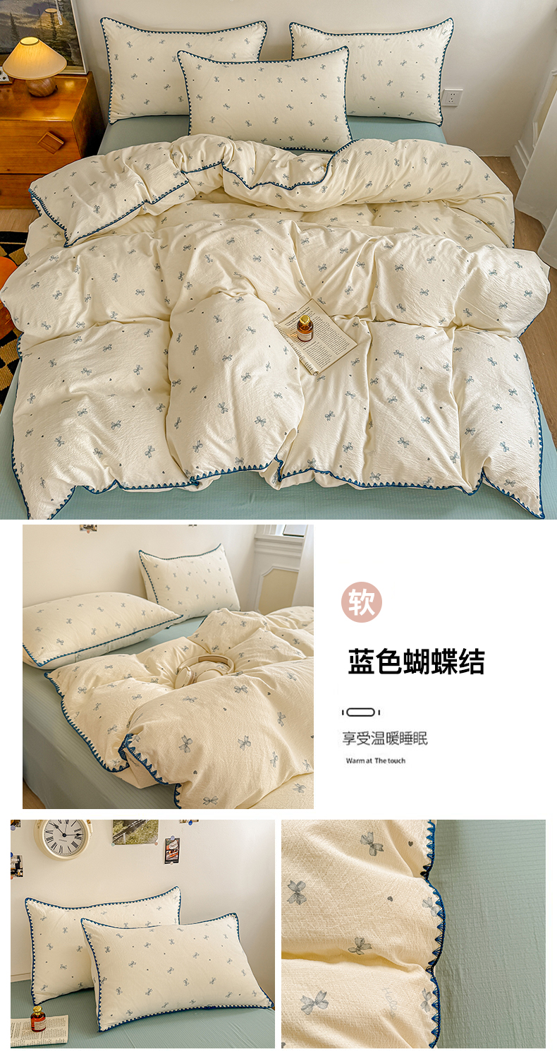 (总)晚爱家纺(原晚安家居) 2025新款云感双层纱贝壳边三角针工艺卡通小清新小碎花四件套,爱如星辰,波点黄,草莓甜心,粉色玫瑰,风铃,海象森林,花语蓝,兰亭序,蓝色蝴蝶结,玫瑰情书,奇妙小熊,倾心咖,小爱心,紫菊梗,紫色小兔