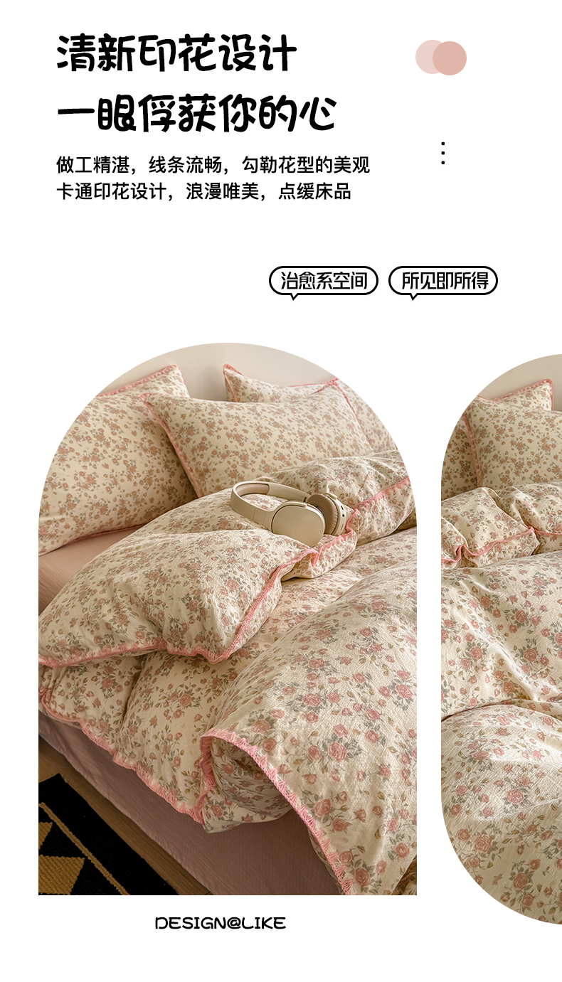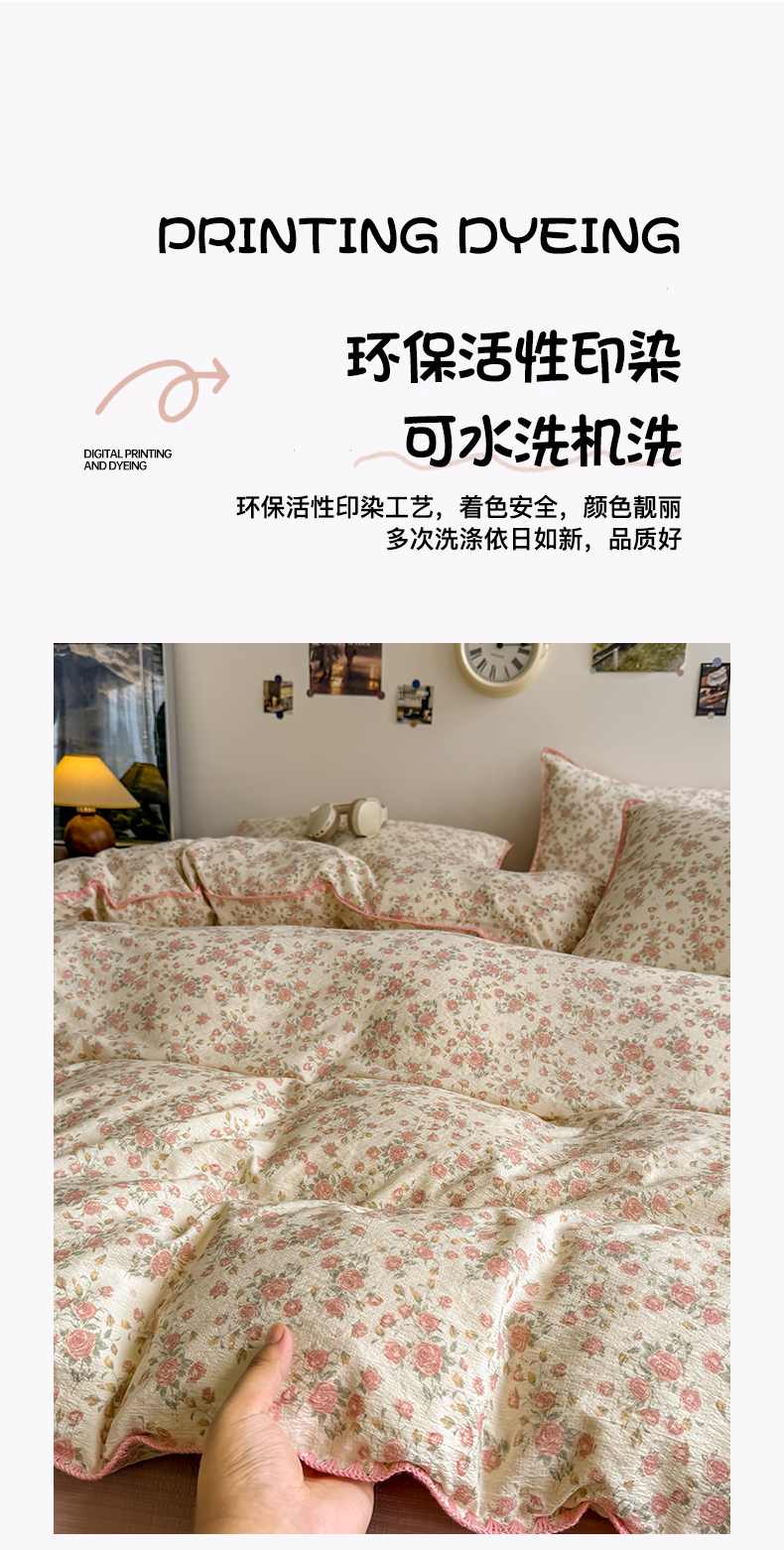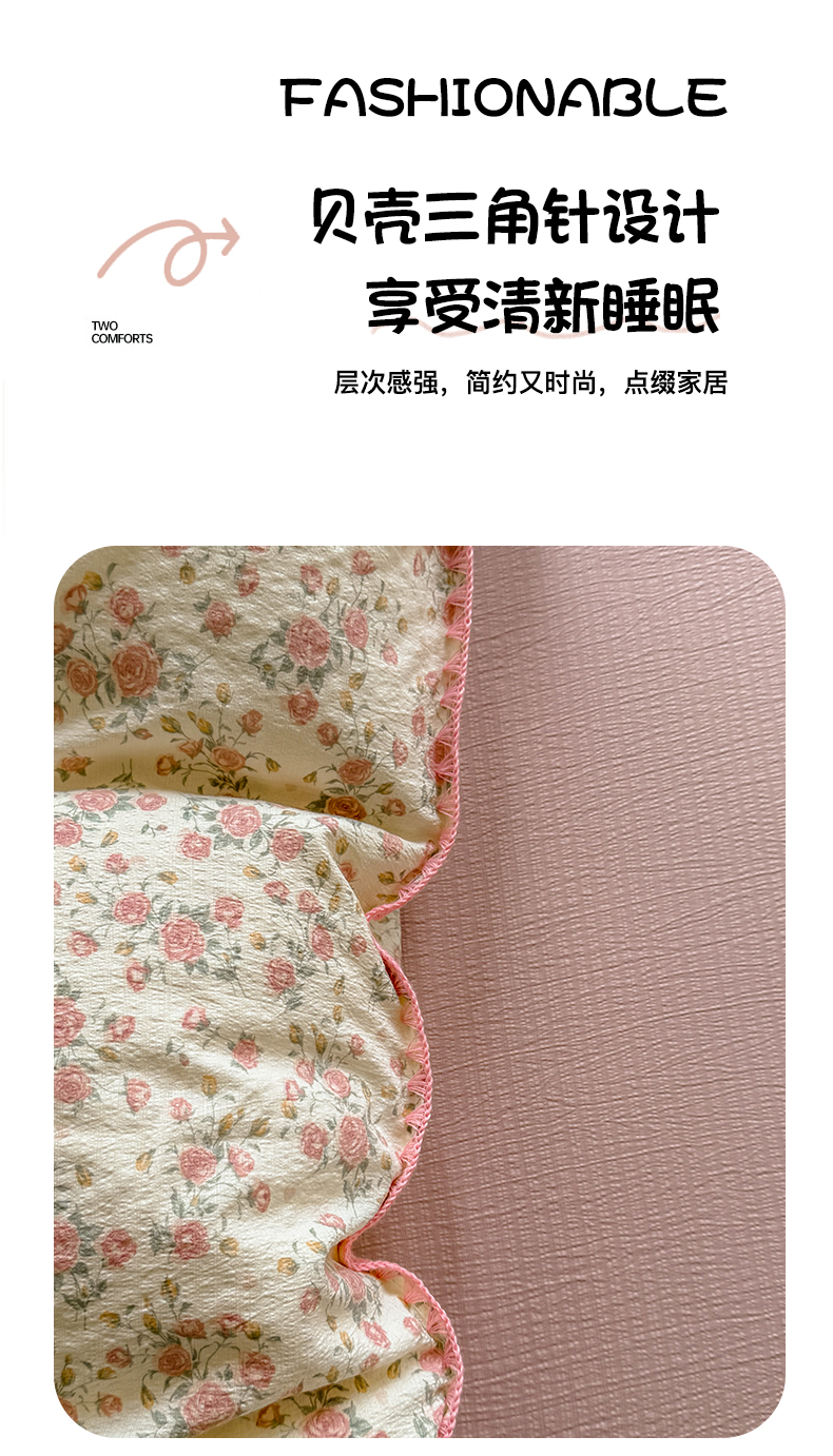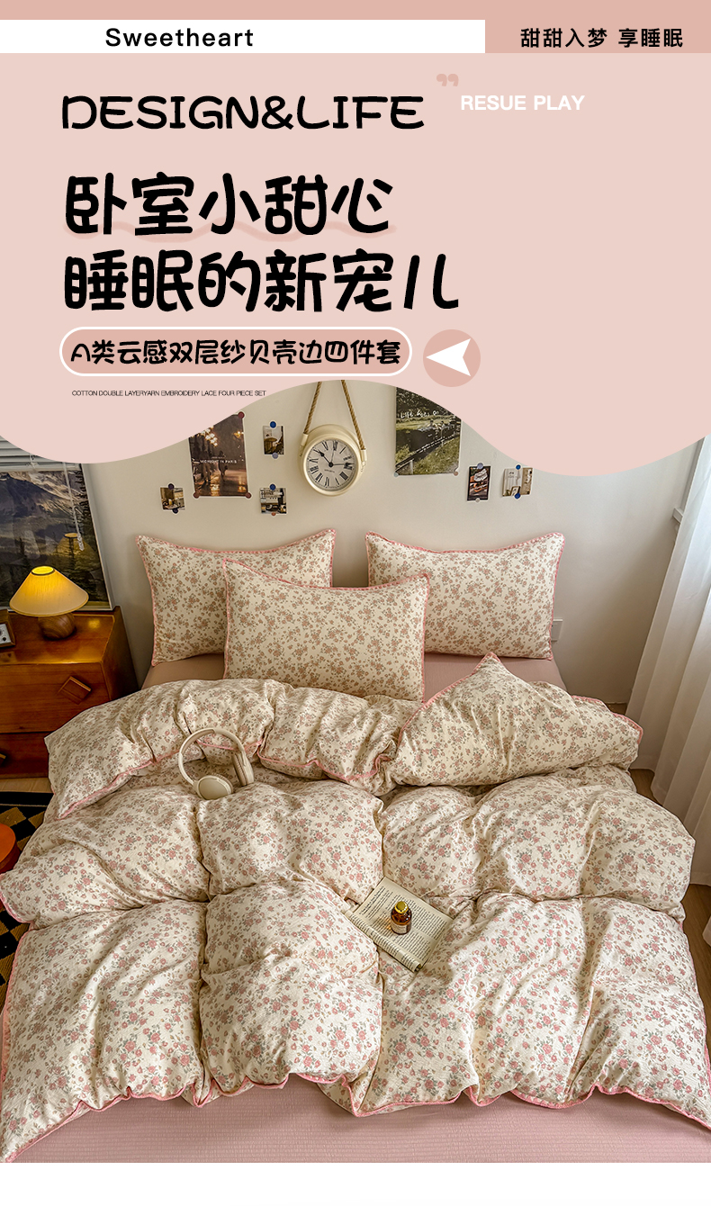 商品名称:晚爱家纺(原晚安家居) 2025新款云感双层纱贝壳边三角针工艺卡通小清新小碎花四件套 粉色玫瑰