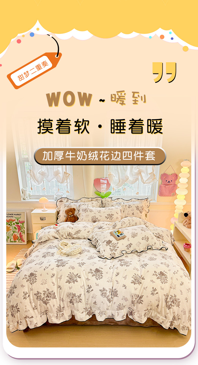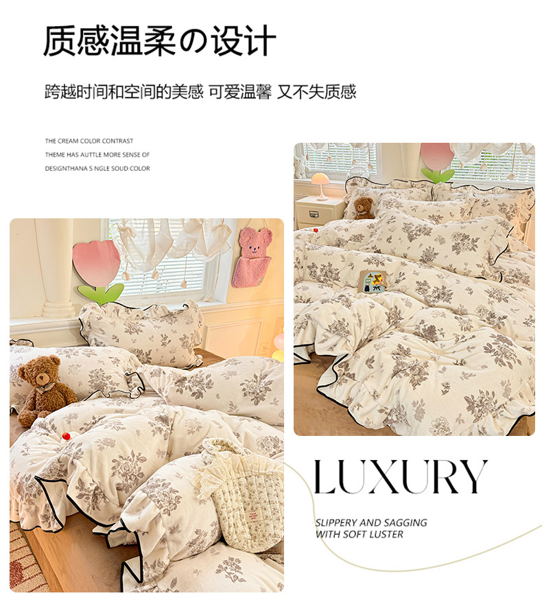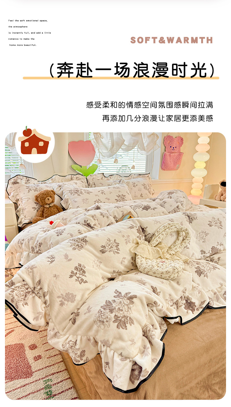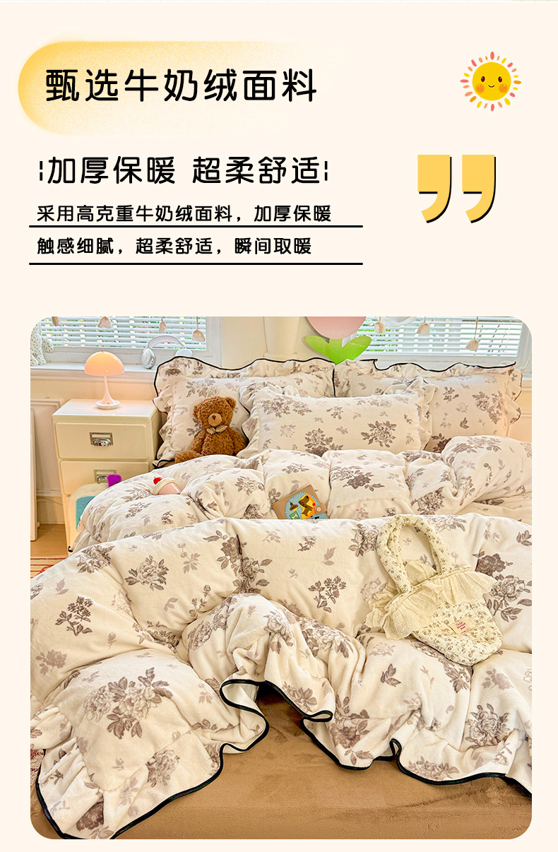 商品名称:(总)迪梦姿家纺 2025秋冬新款韩版印花牛奶绒花边款四件套
