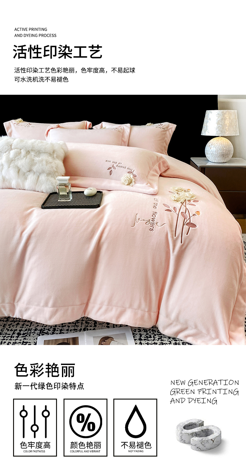 (总)席之家 2025新款刺绣牛奶绒四件套,花语-卡其玉,花语-奶咖,花语-青柠绿,花语-少女粉