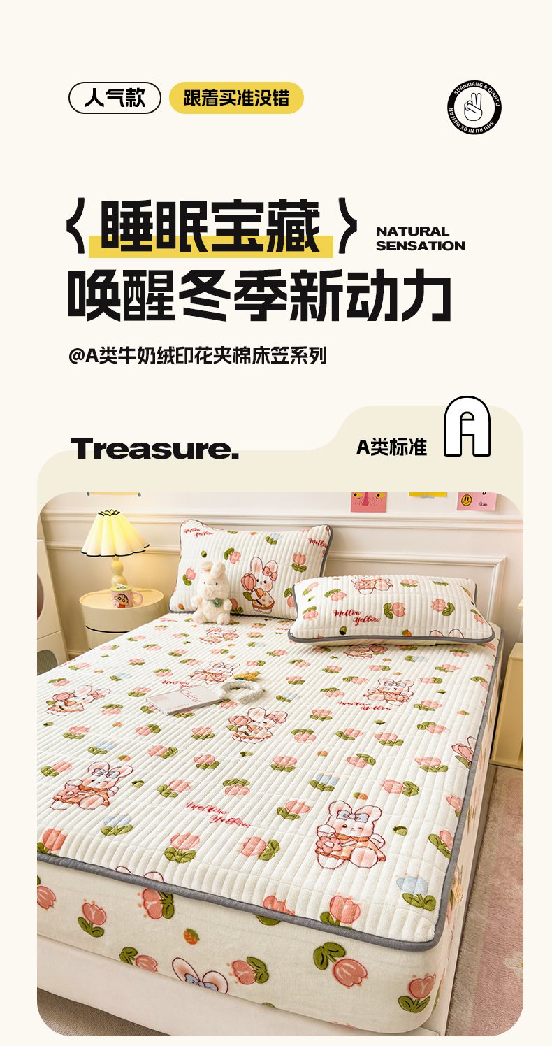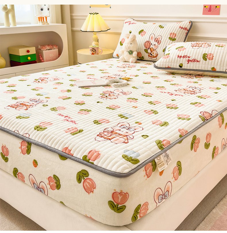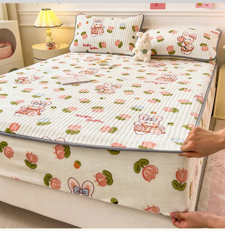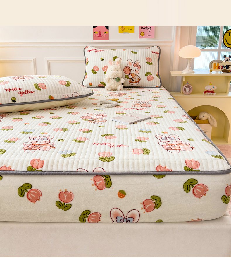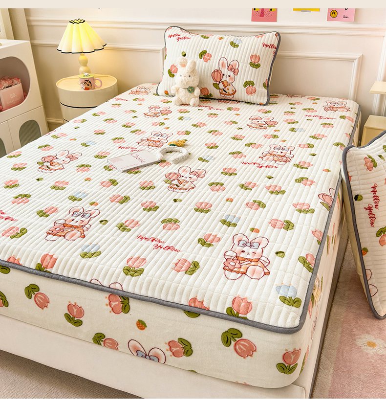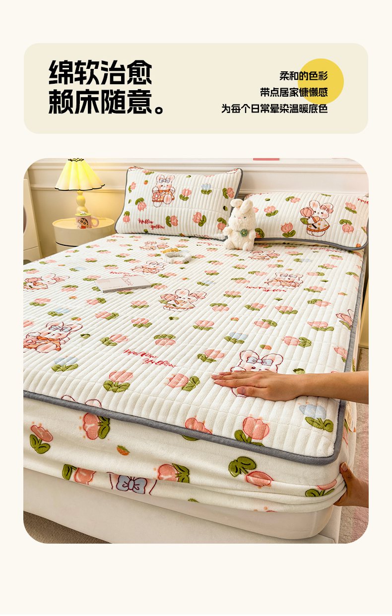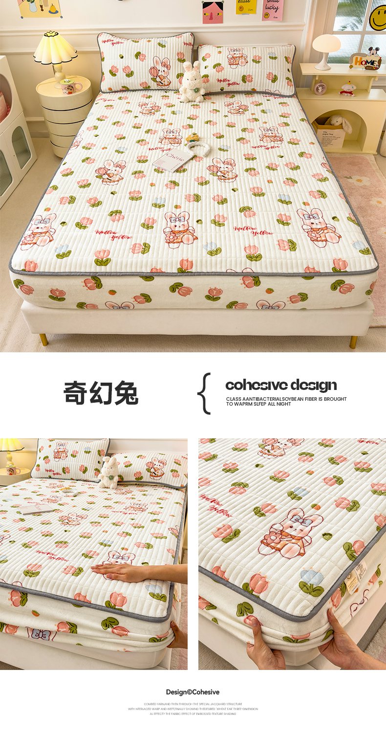 • 91家纺网 家纺一手货源 找家纺 摩妮卡 2025新款小清新系列印花牛奶绒夹棉床笠三件套 奇幻兔