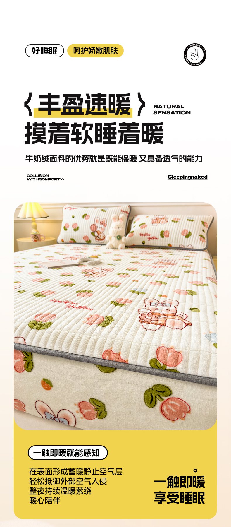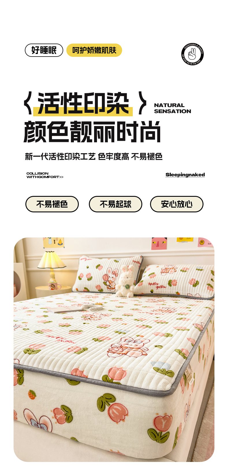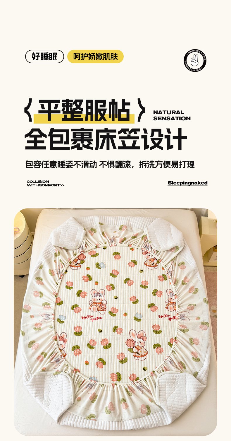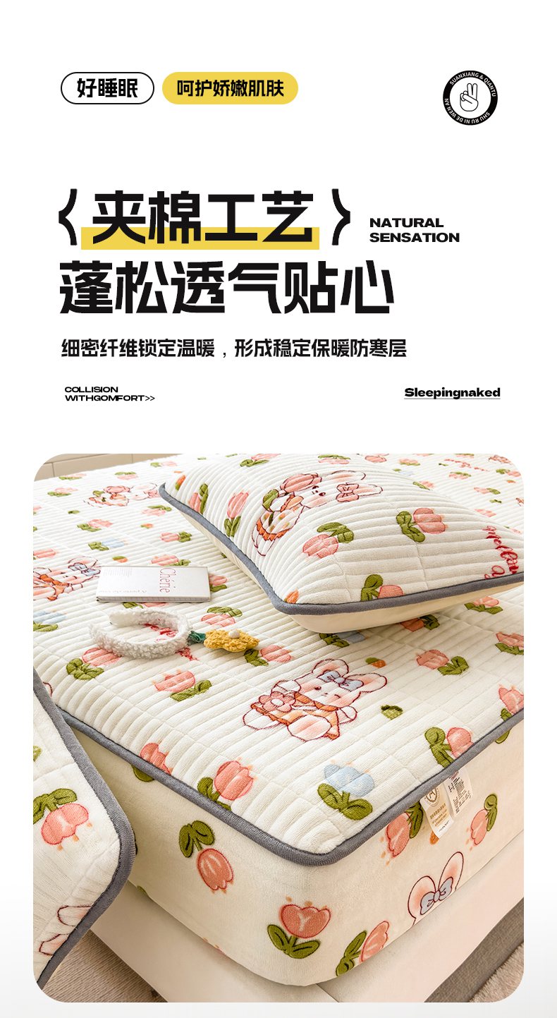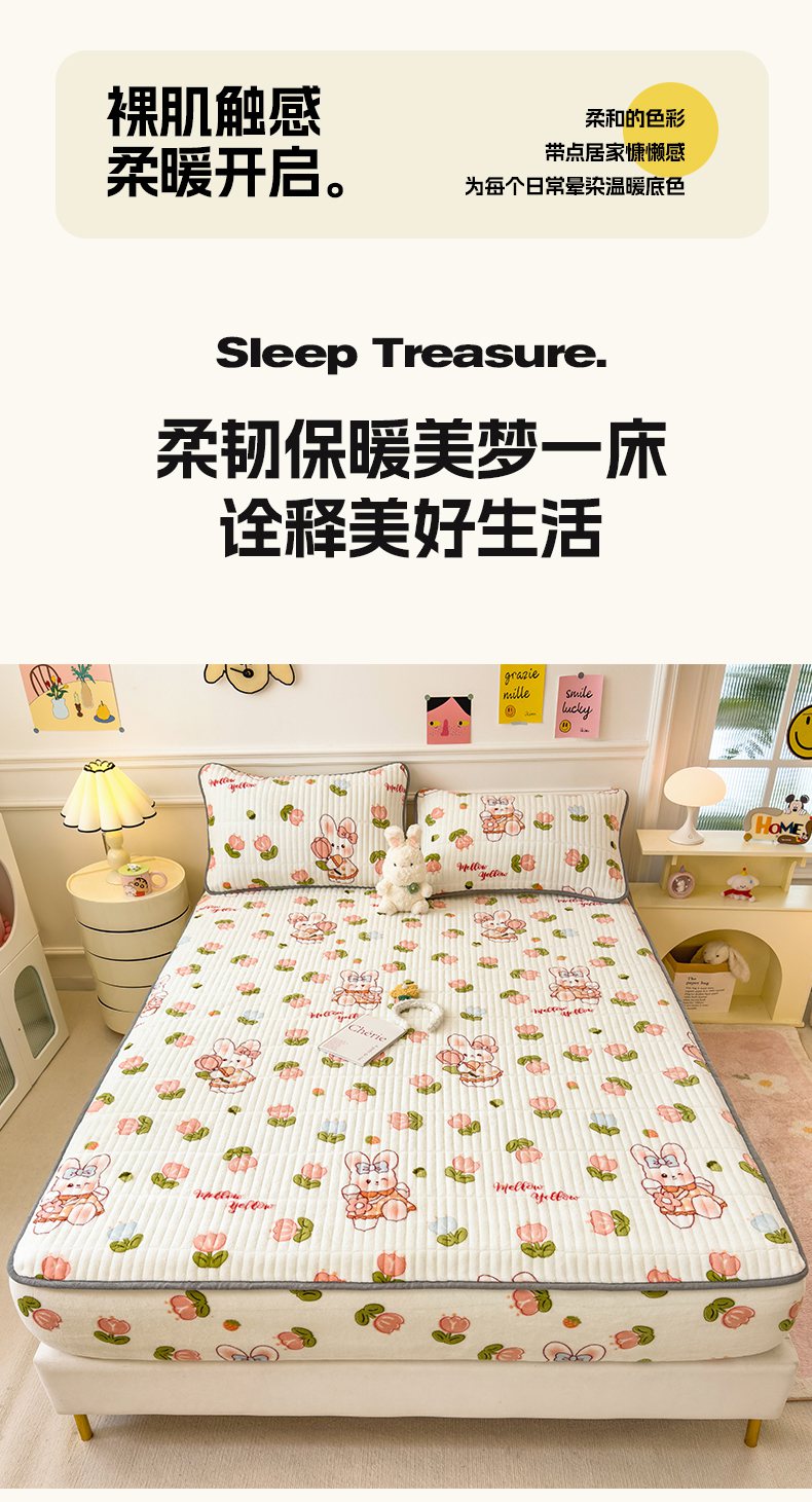 • 91家纺网 家纺一手货源 找家纺 摩妮卡 2025新款小清新系列印花牛奶绒夹棉床笠三件套 奇幻兔