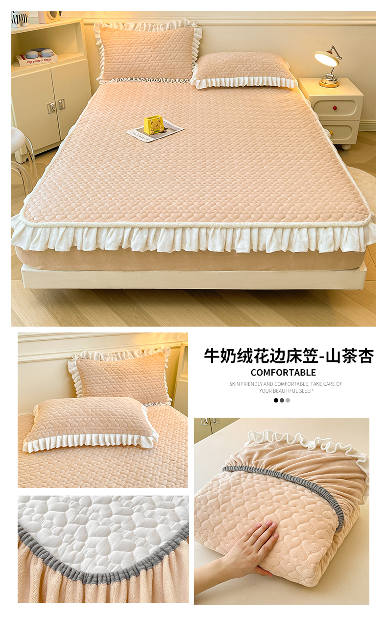 雯豆家纺 2025新款牛奶绒花边床笠单床笠单品床笠单件床笠 牛奶绒花边床笠-格调粉