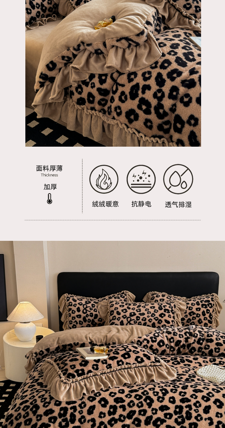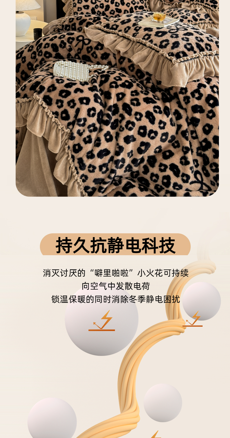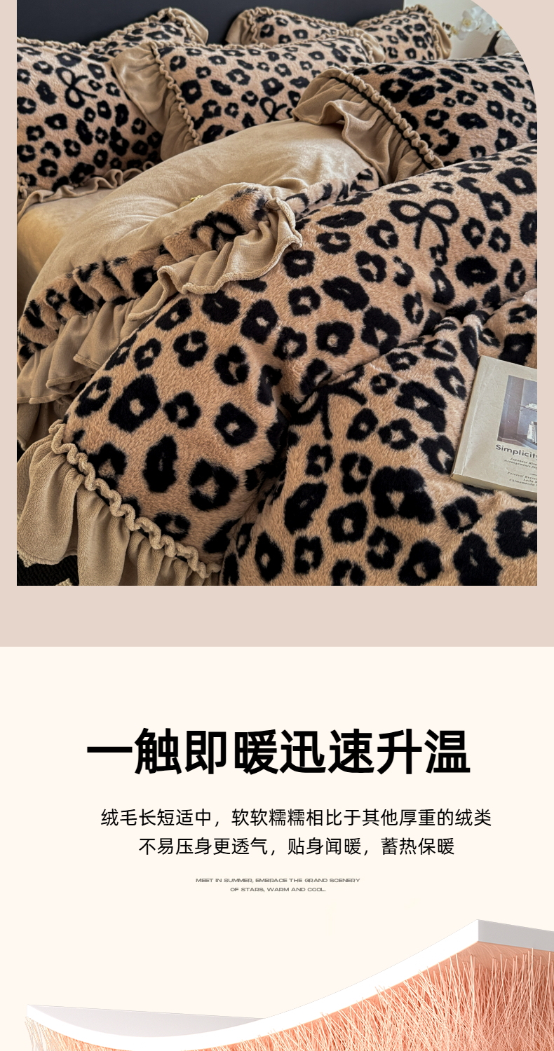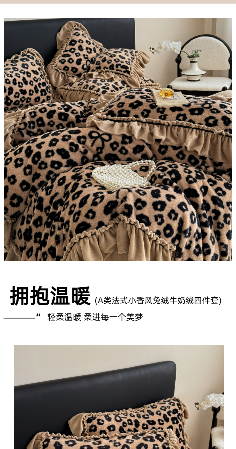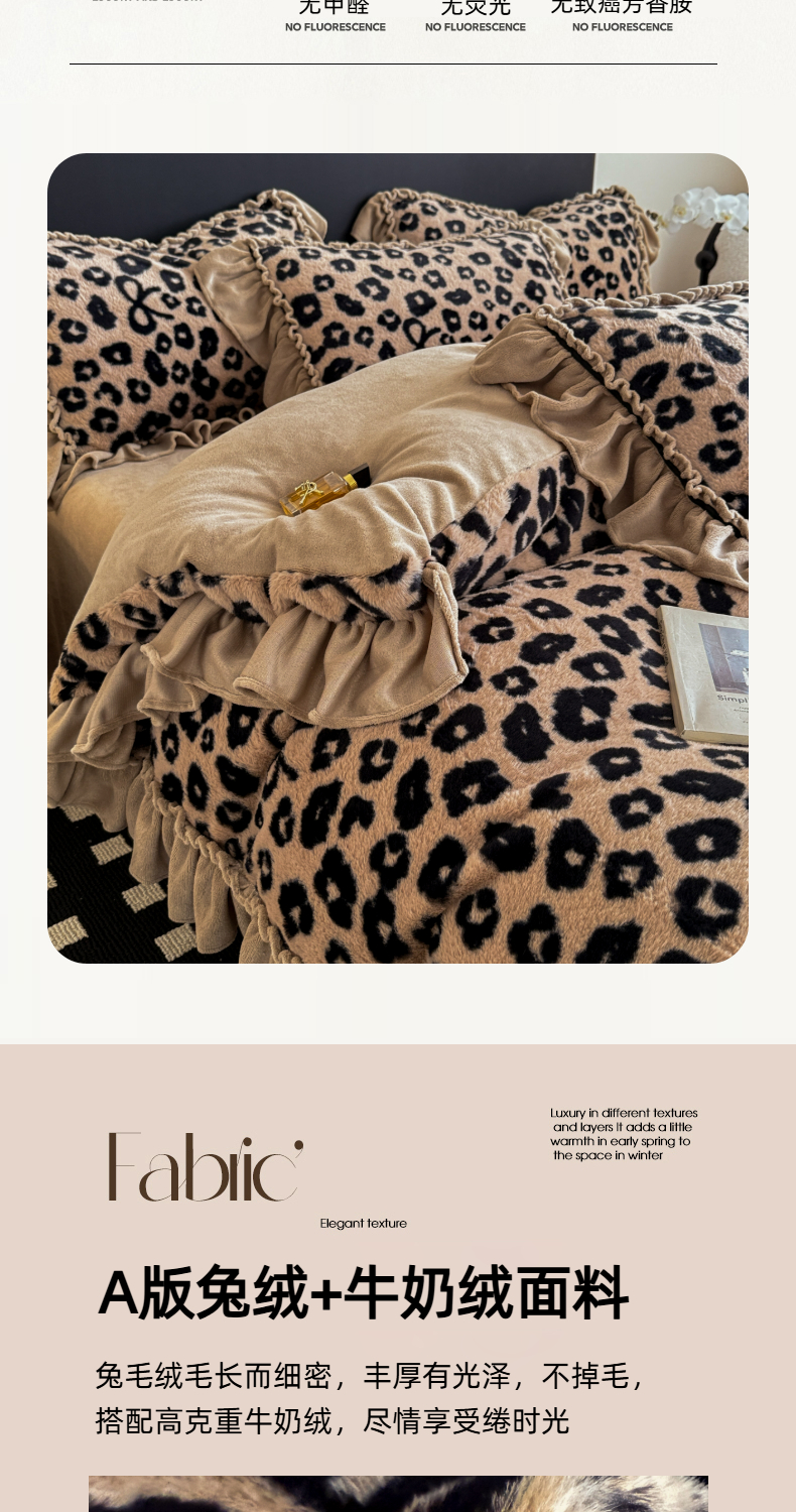 商品名称:米莱家纺 2025新款兔毛绒法式花边四件套 豹纹-咖