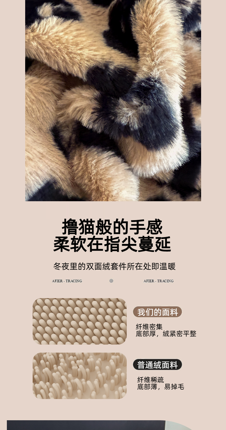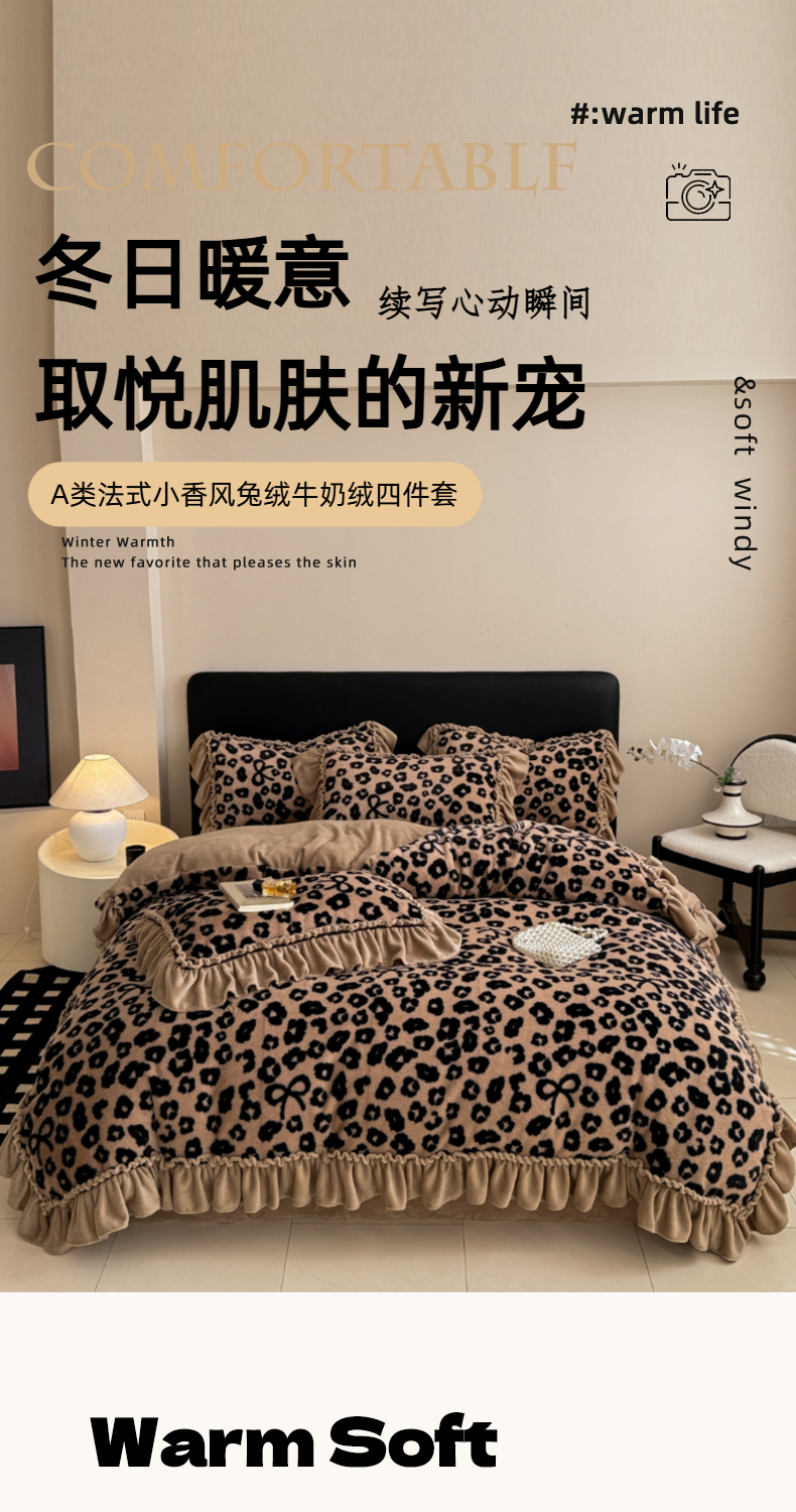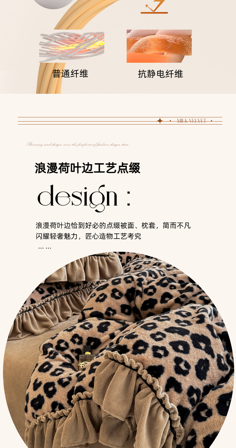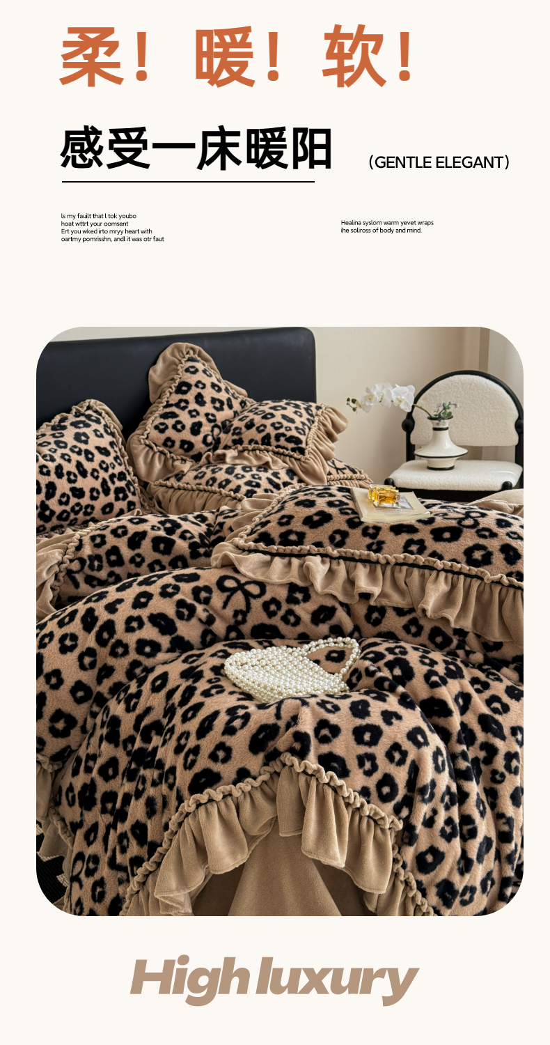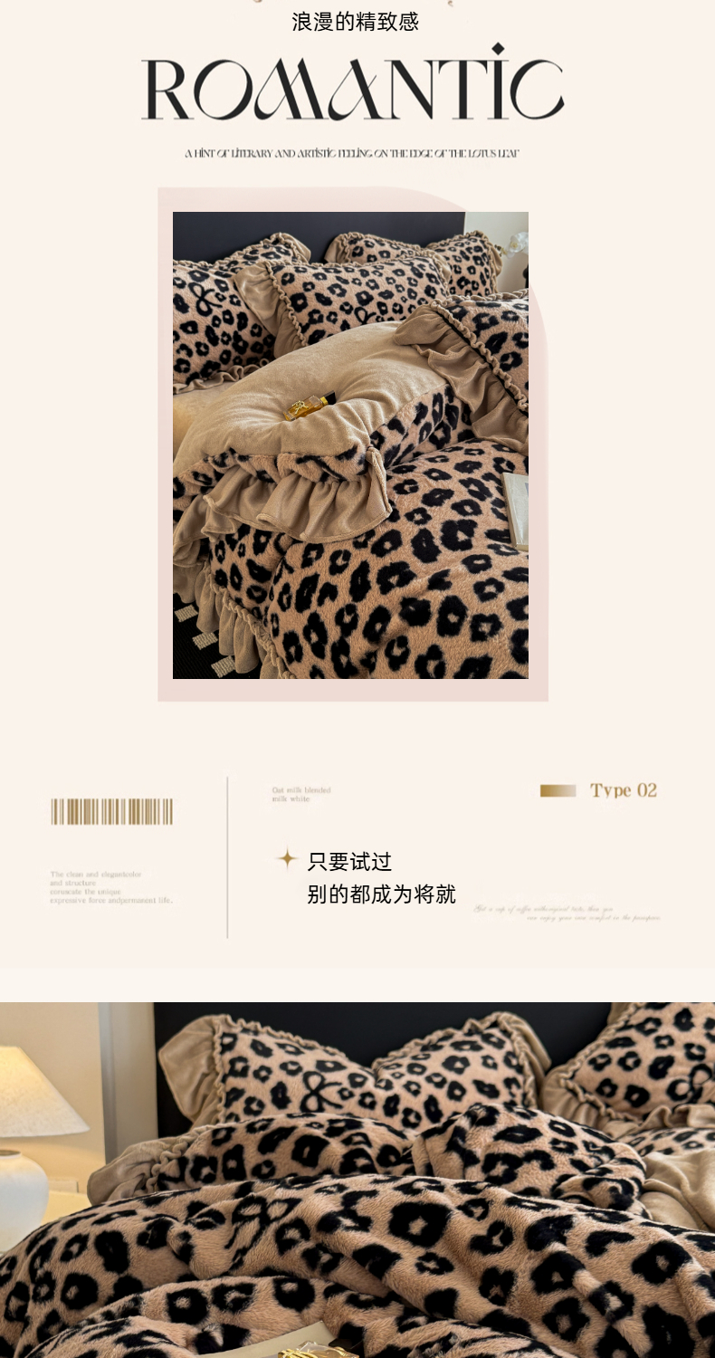 商品名称:米莱家纺 2025新款兔毛绒法式花边四件套 豹纹-咖