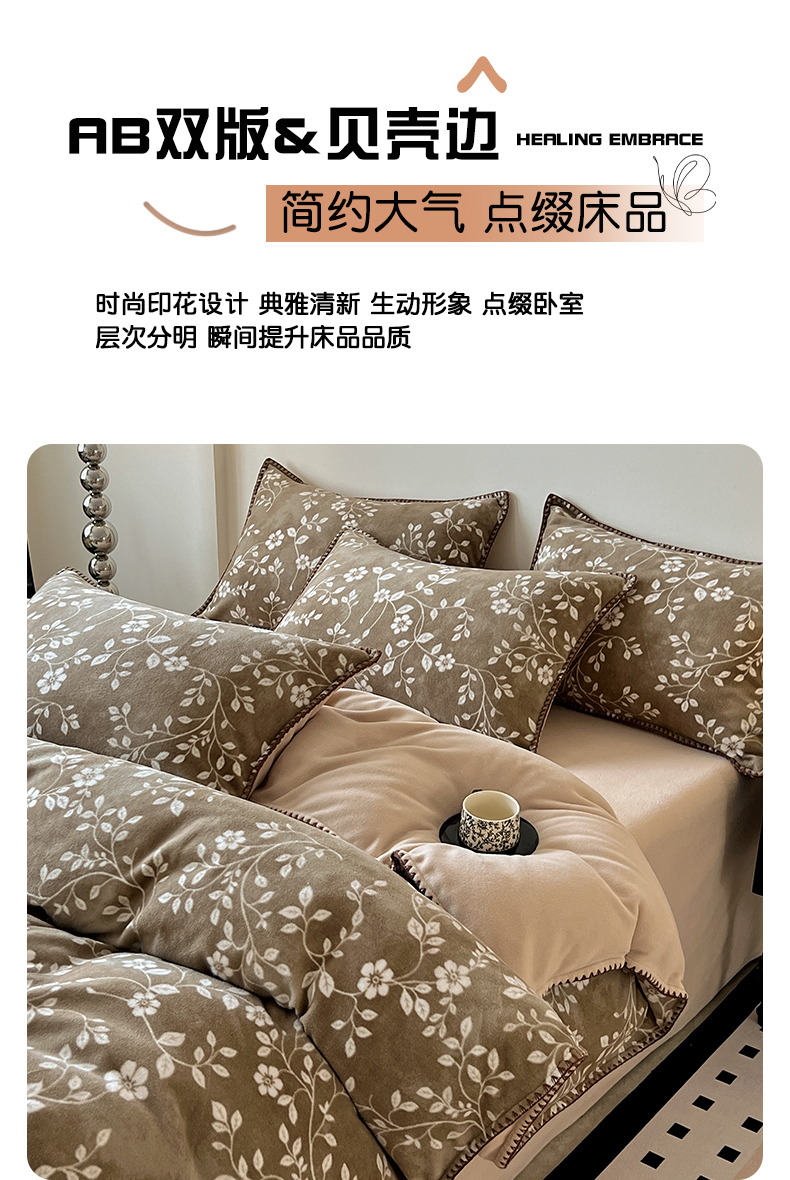 (总)忆生活家纺 2025秋冬新品软糯缇肤绒印花贝壳边四件套,卡拉-灰,开心熊-米,南笙-咖,南笙-绿,浅夏-咖,素影-酒红,素影-紫,小樱桃-酒红,叶茂-驼