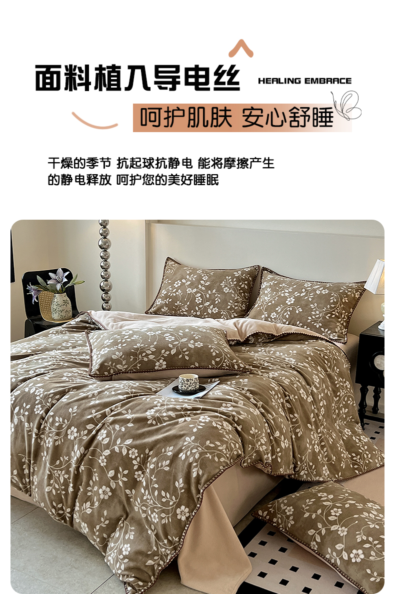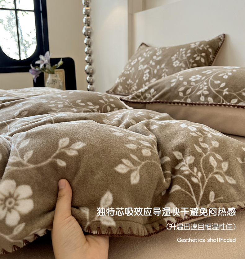 商品名称:忆生活家纺 2025秋冬新品软糯缇肤绒印花贝壳边四件套 南笙-咖