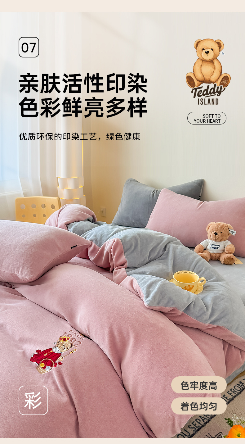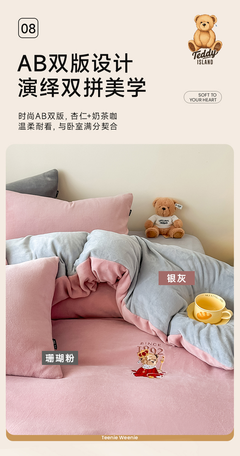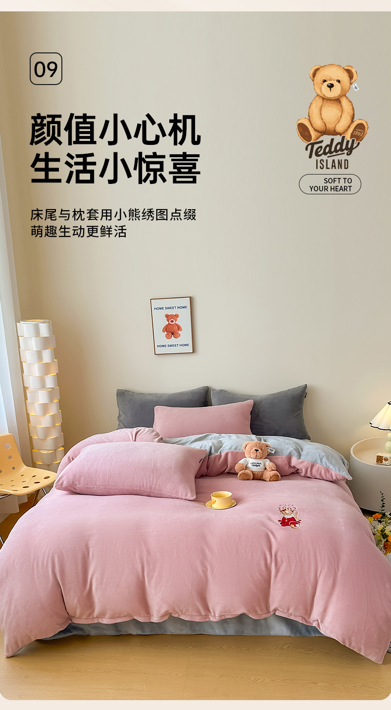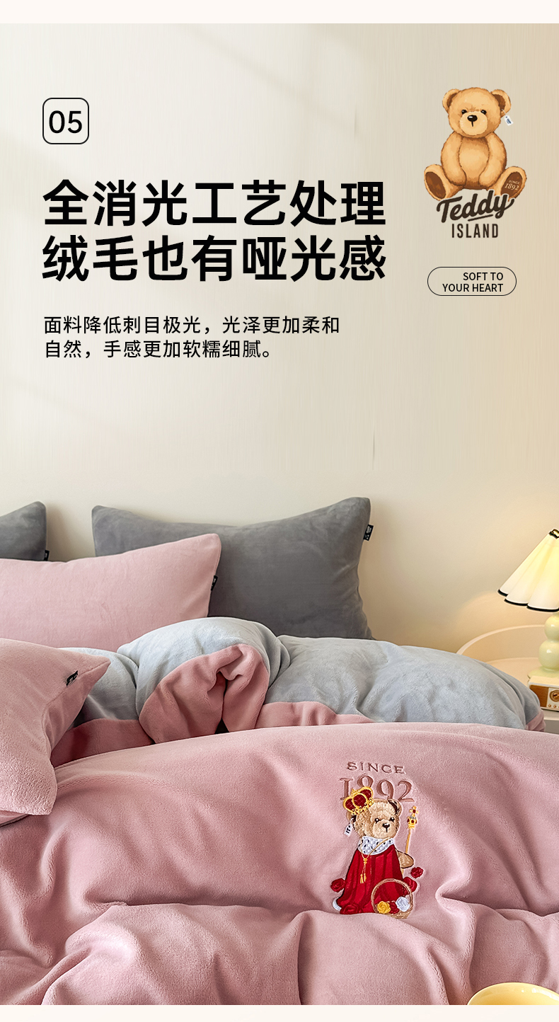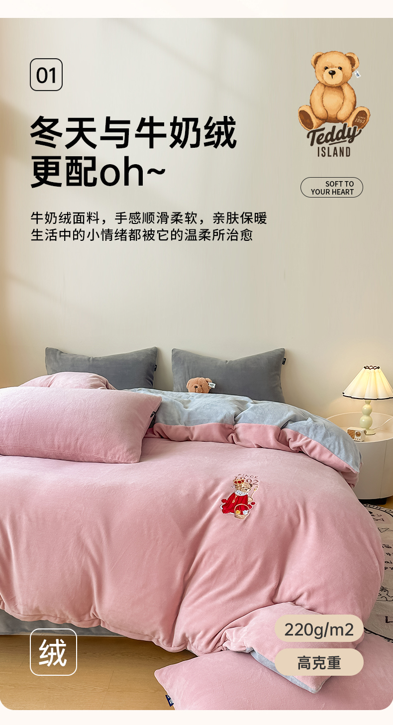 (总)泰迪爱兰Teddy ISLAND 2025新款牛奶绒绣花四件套,粉色+杏仁色,可可色+杏仁色,雾霾灰+神秘灰,香芋紫+神秘灰,杏仁色+可可色,杏仁色+神秘灰