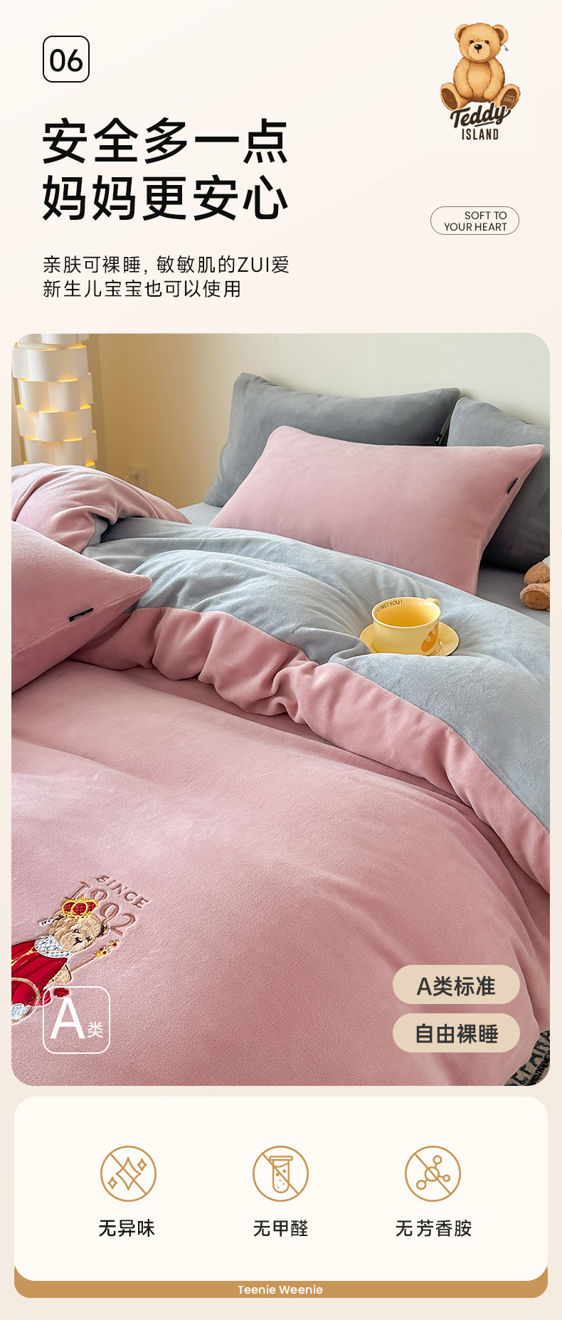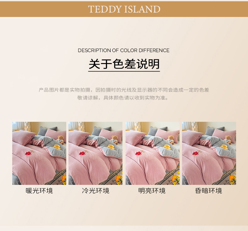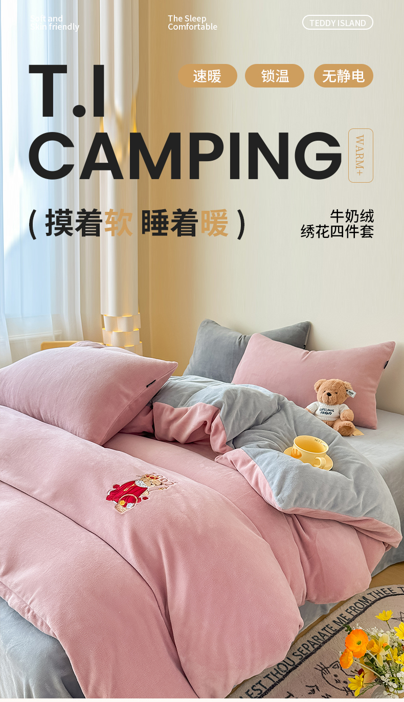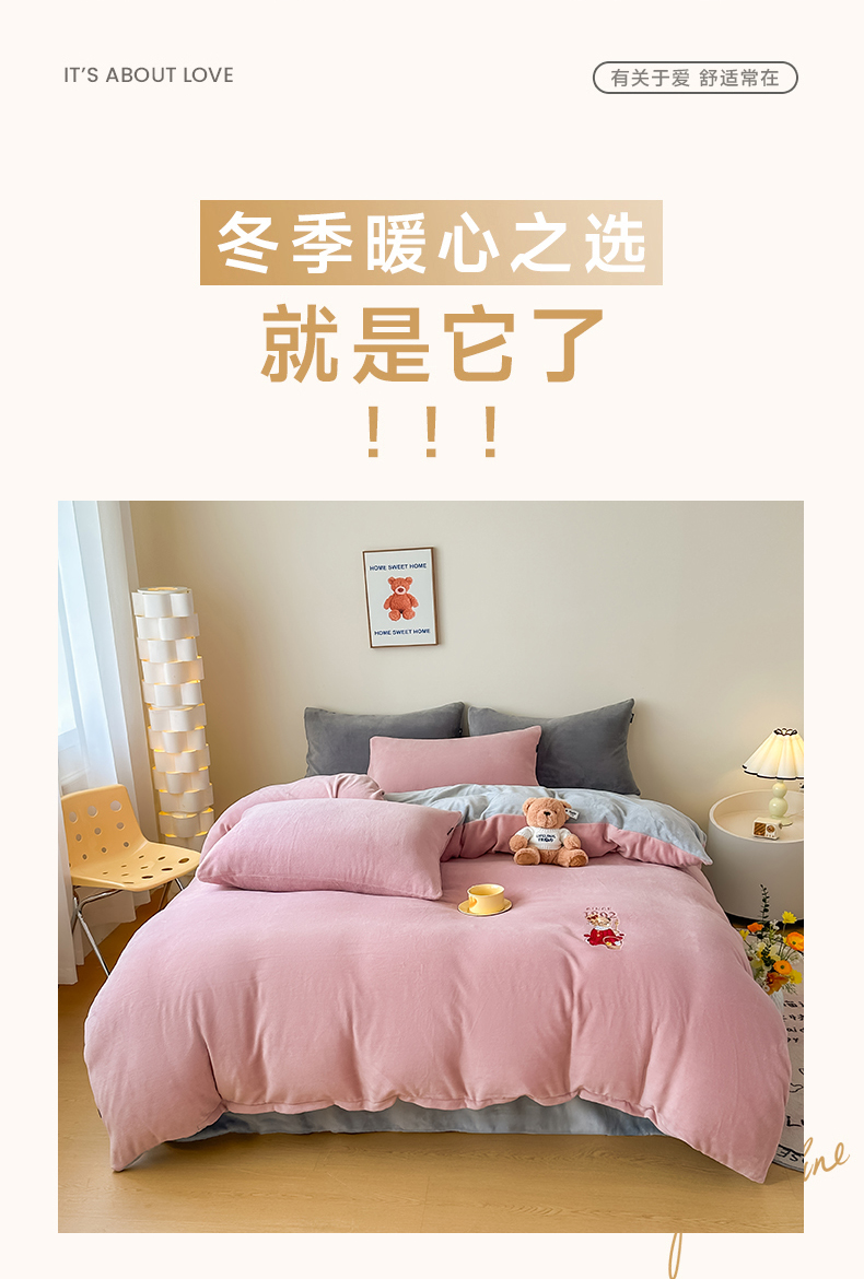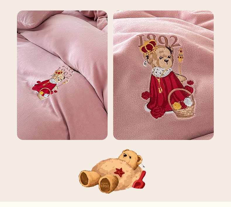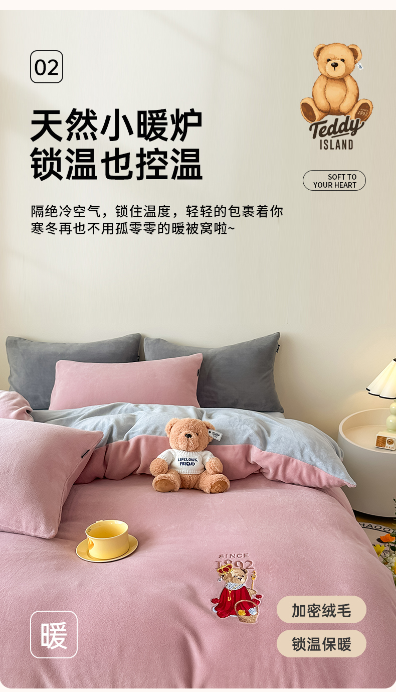 (总)泰迪爱兰Teddy ISLAND 2025新款牛奶绒绣花四件套,粉色+杏仁色,可可色+杏仁色,雾霾灰+神秘灰,香芋紫+神秘灰,杏仁色+可可色,杏仁色+神秘灰