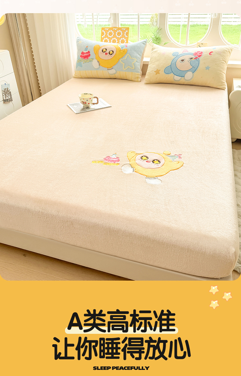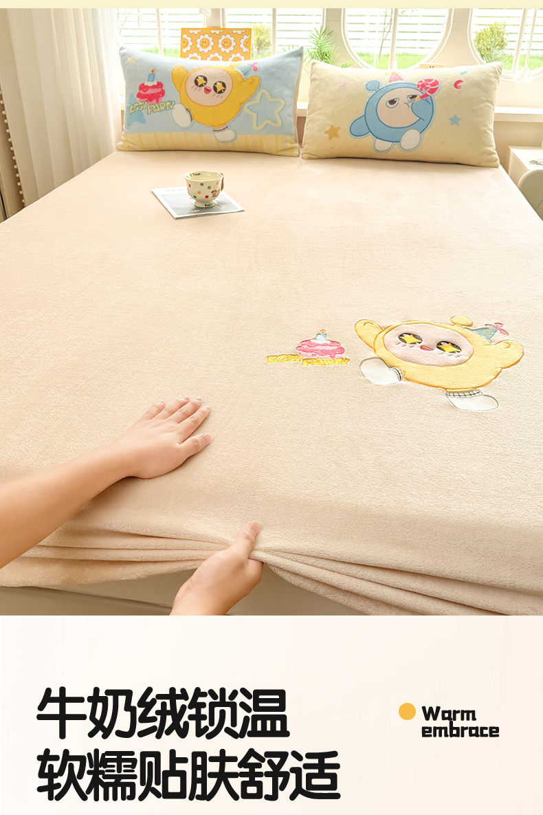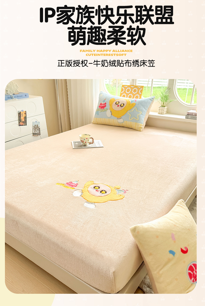 雯豆家纺 正版授权IP纯色贴布绣牛奶绒床笠三件套加厚卡通床垫保护套 黄蛋仔-米